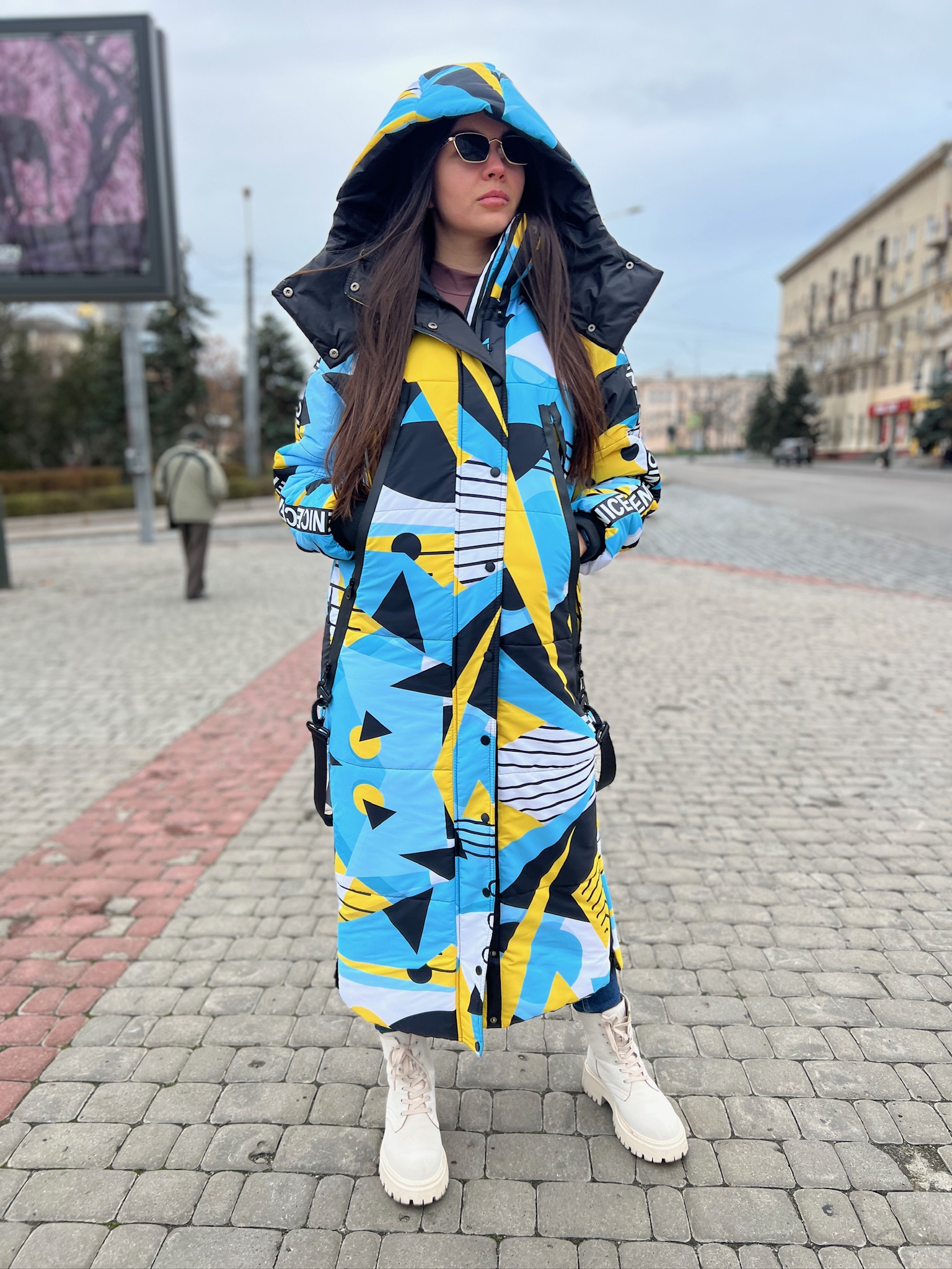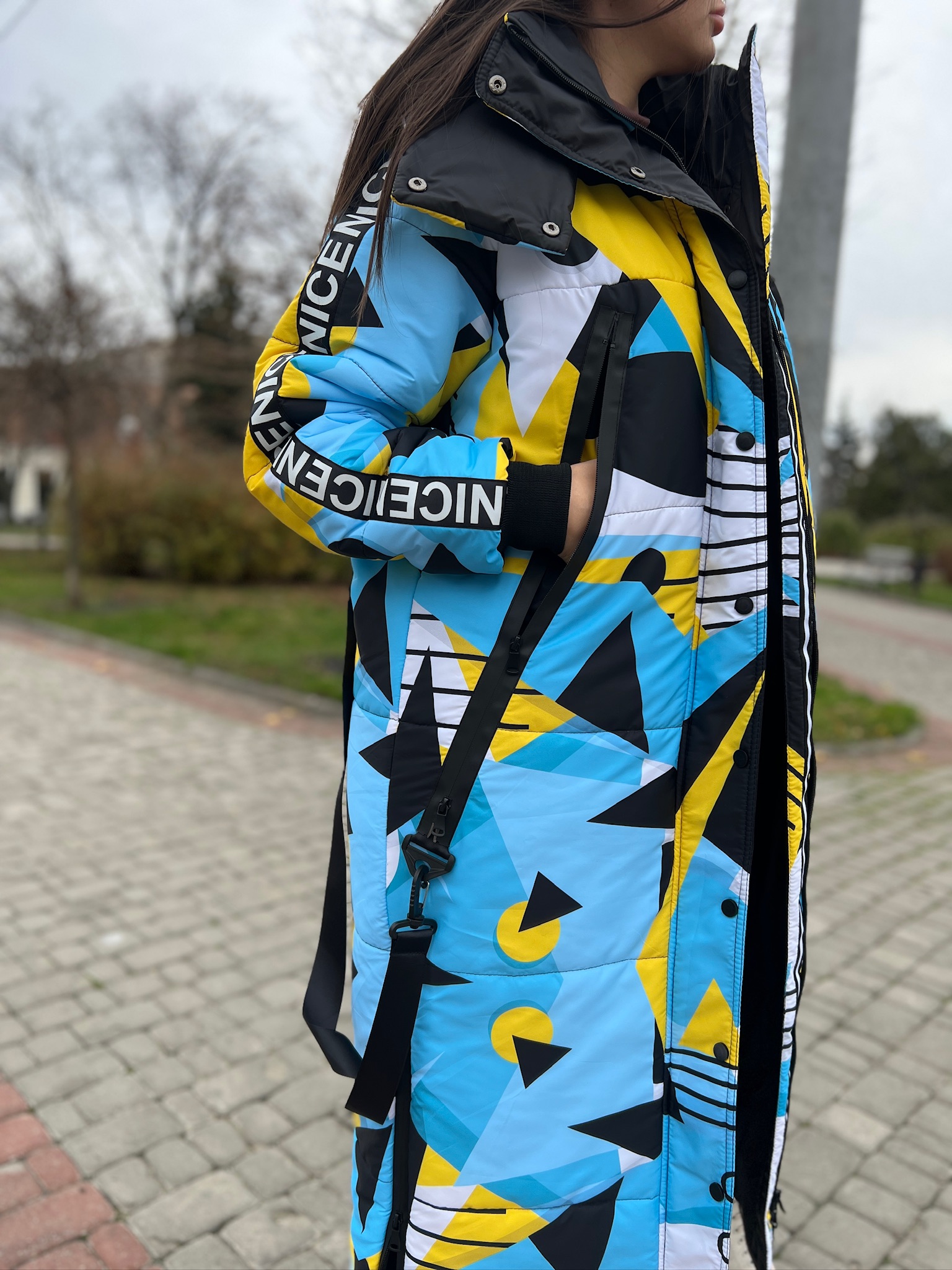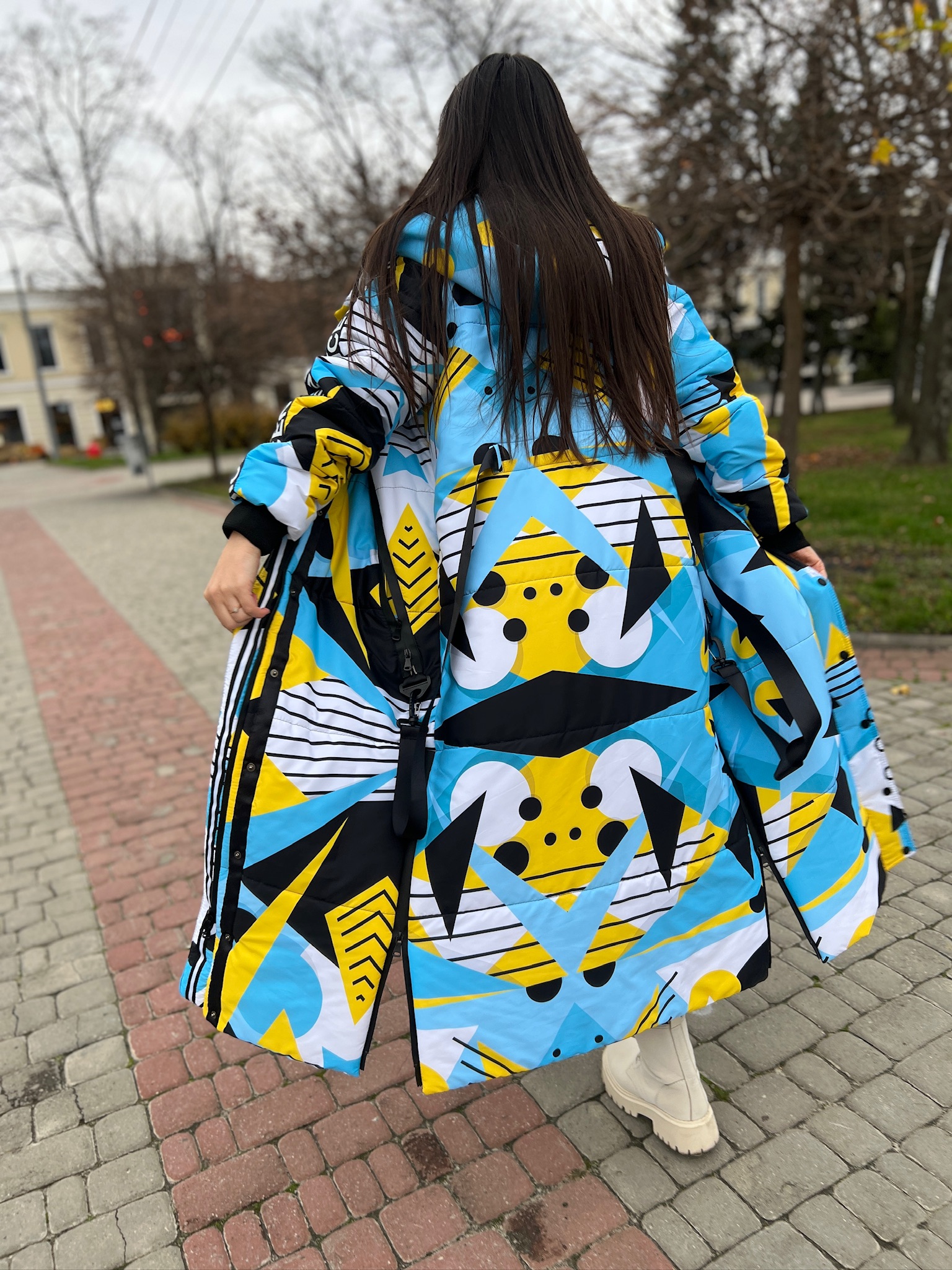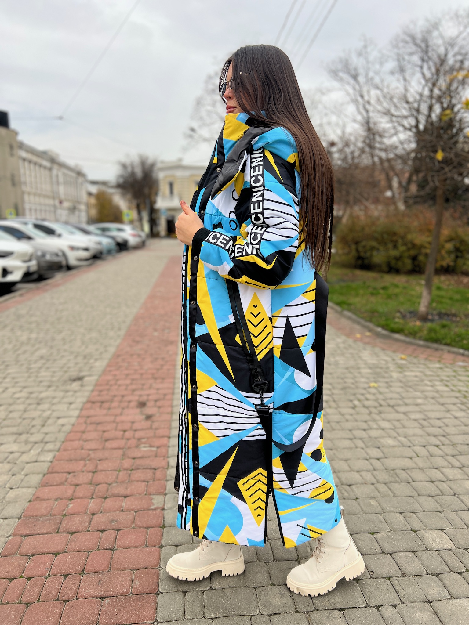 Прямий крій, блискавка двостороння – можна розстібати знизу, зверху планка із кнопками, рукава регланом, на манжетах, капюшон з’ємний: на кнопочках, є бокові розрізи, на блискавках, можна розстібати для зручності при хотьбі, є кишені по 2шт з обох сторін, всі блискавки прорезинені – захищають від дощу та снігу. Декорована стрічкою, яка застібається біля кишень, можна використовувати як пасок. Довжина 127 см, довжина рукава по зовнішньому шву від горловини 77 см, температурний режим до -20 градусів.