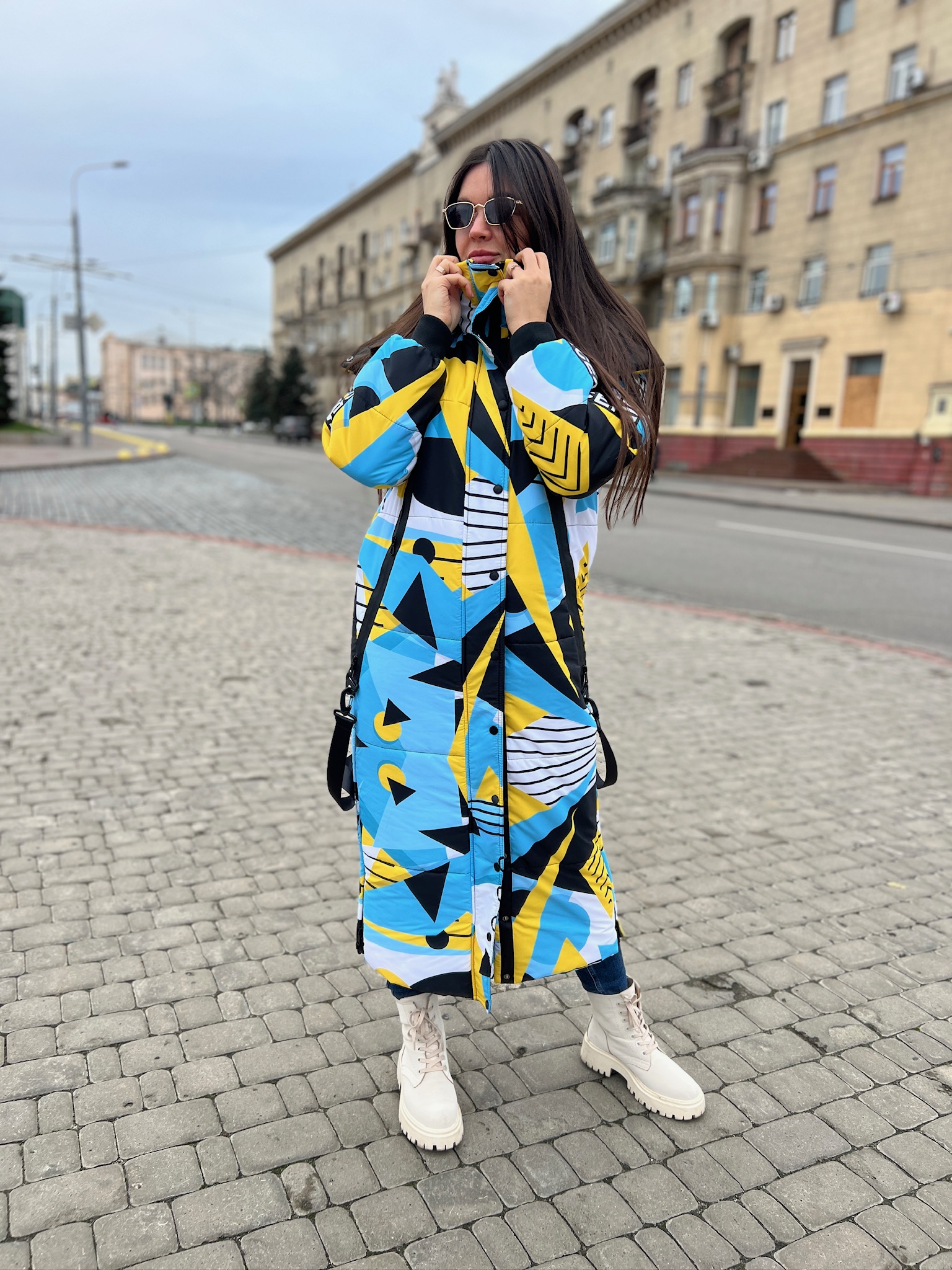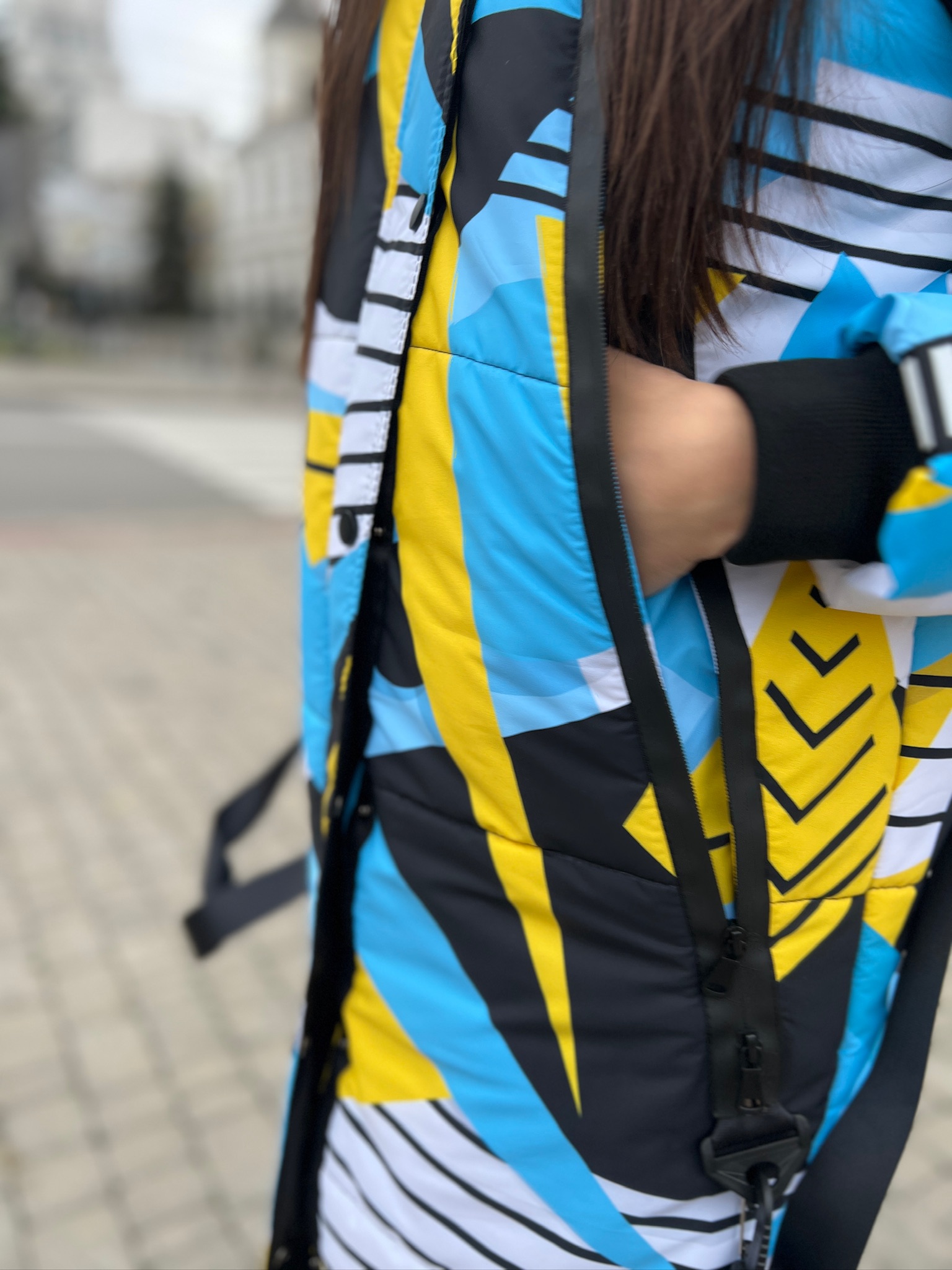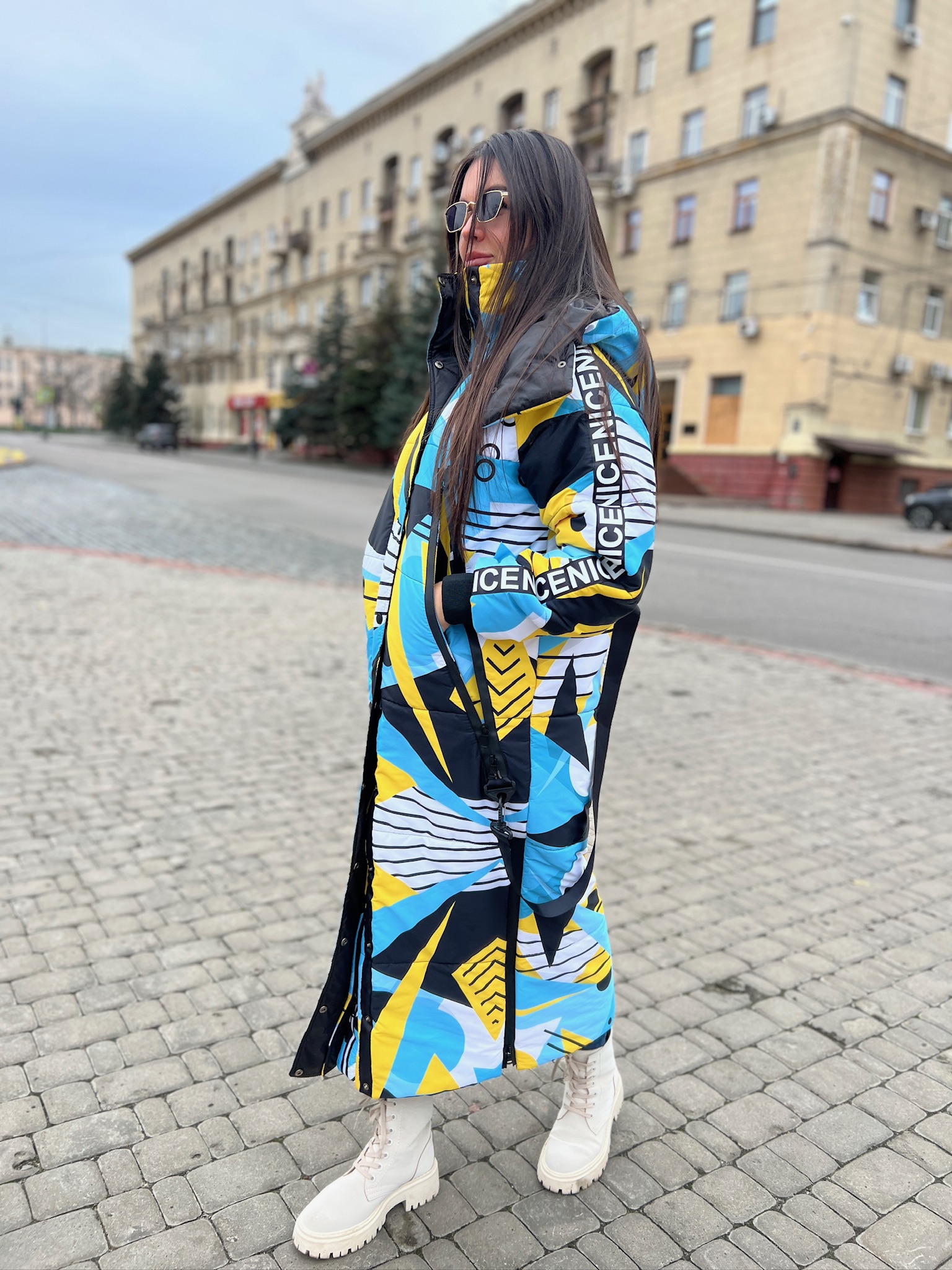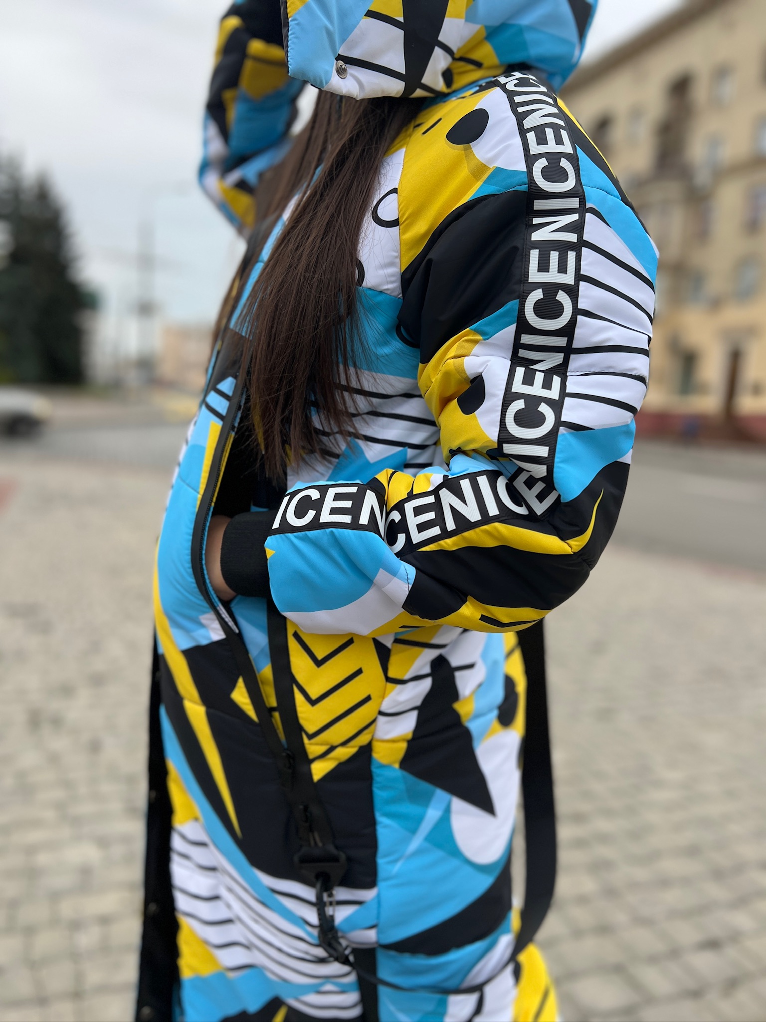 Прямий крій, блискавка двостороння – можна розстібати знизу, зверху планка із кнопками, рукава регланом, на манжетах, капюшон з’ємний: на кнопочках, є бокові розрізи, на блискавках, можна розстібати для зручності при хотьбі, є кишені по 2шт з обох сторін, всі блискавки прорезинені – захищають від дощу та снігу. Декорована стрічкою, яка застібається біля кишень, можна використовувати як пасок. Довжина 127 см, довжина рукава по зовнішньому шву від горловини 77 см, температурний режим до -20 градусів.
