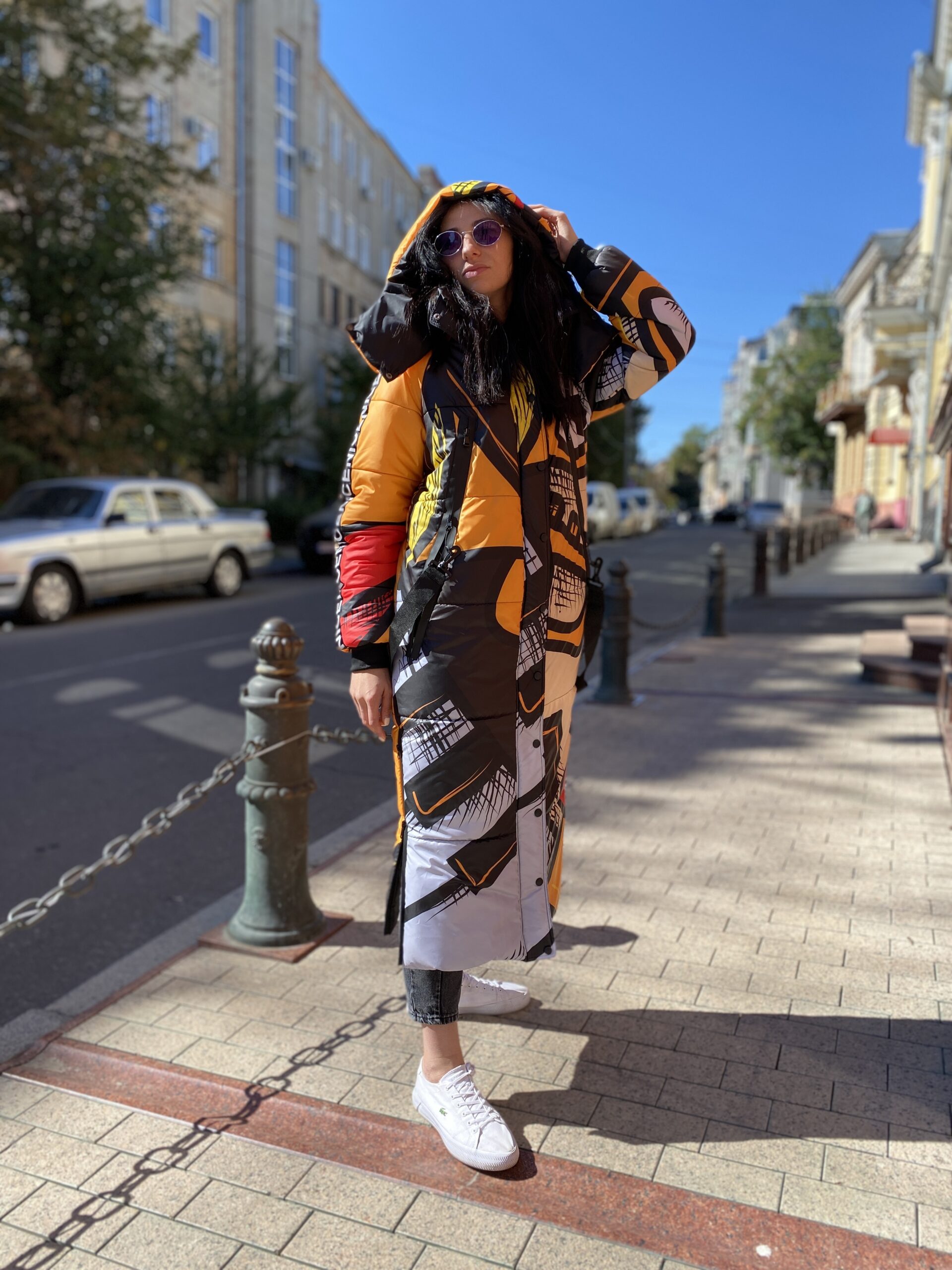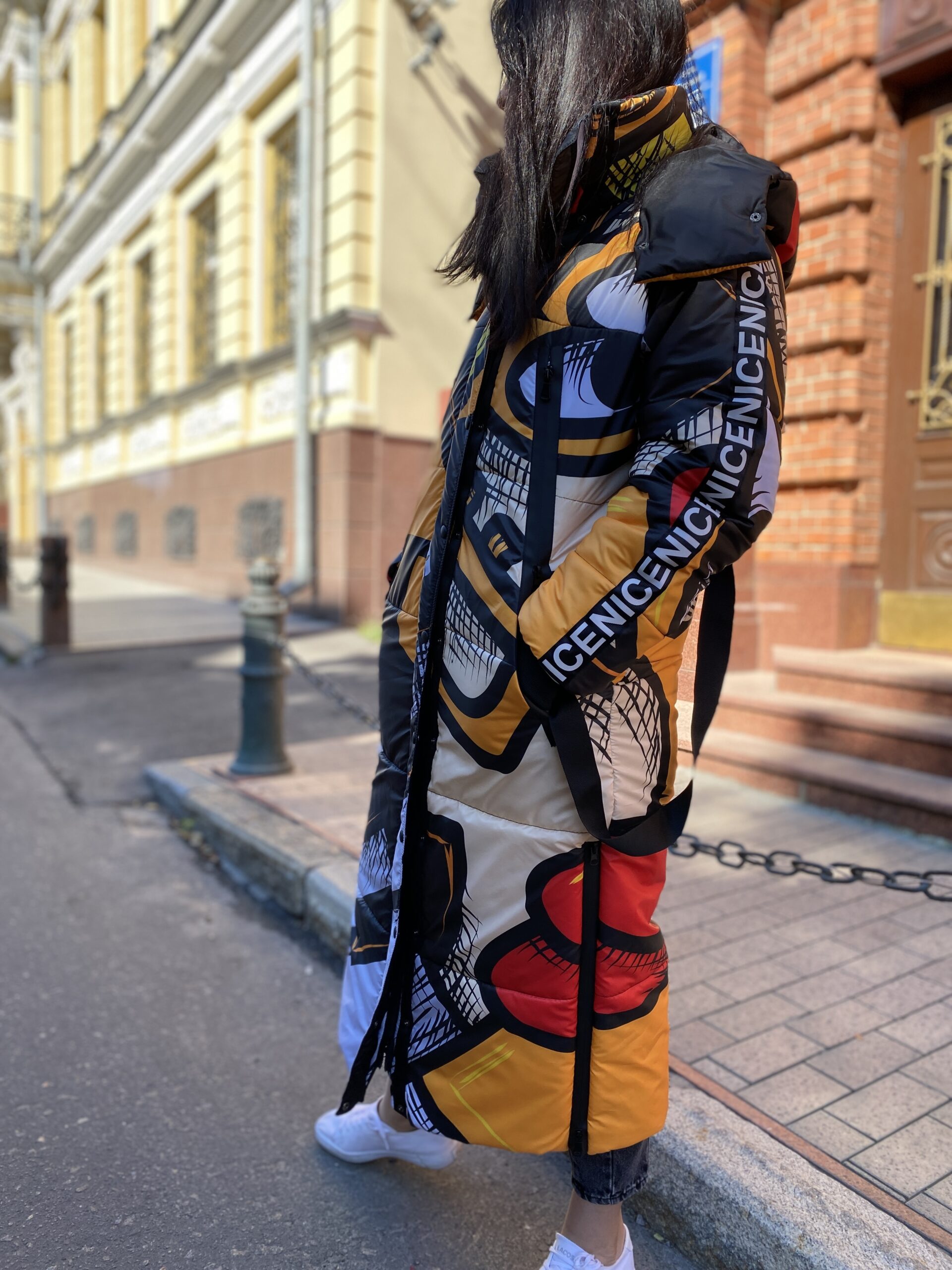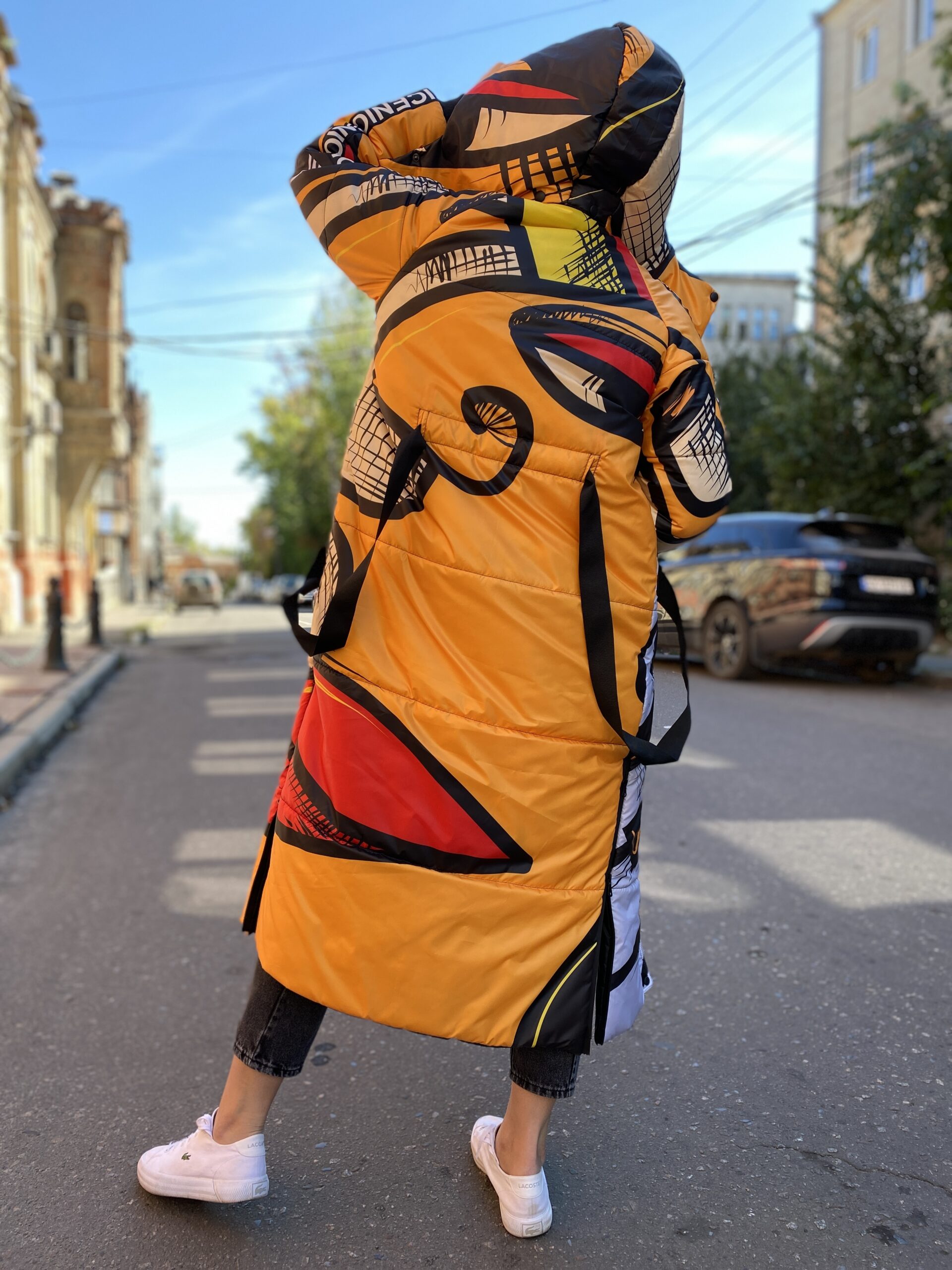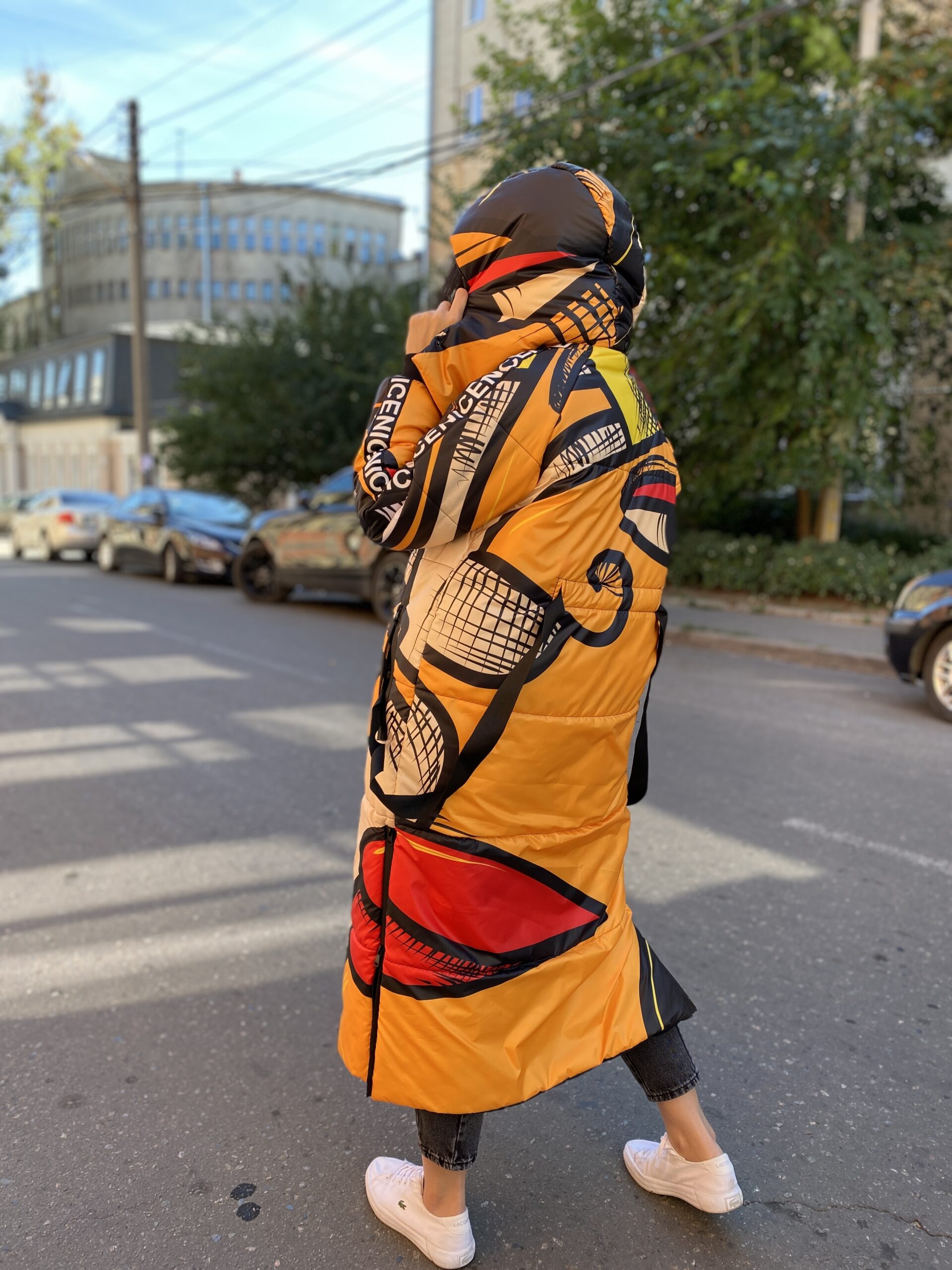Прямий крій, блискавка двостороння – можна розстібати знизу, зверху планка із кнопками, рукава регланом, на манжетах, капюшон з’ємний: на кнопочках, є бокові розрізи, на блискавках, можна розстібати для зручності при хотьбі, є кишені по 2шт з обох сторін, всі блискавки прорезинені – захищають від дощу та снігу. Декорована стрічкою, яка застібається біля кишень, можна використовувати як пасок. Довжина 127 см, довжина рукава по зовнішньому шву від горловини 77 см, температурний режим до -20 градусів.
