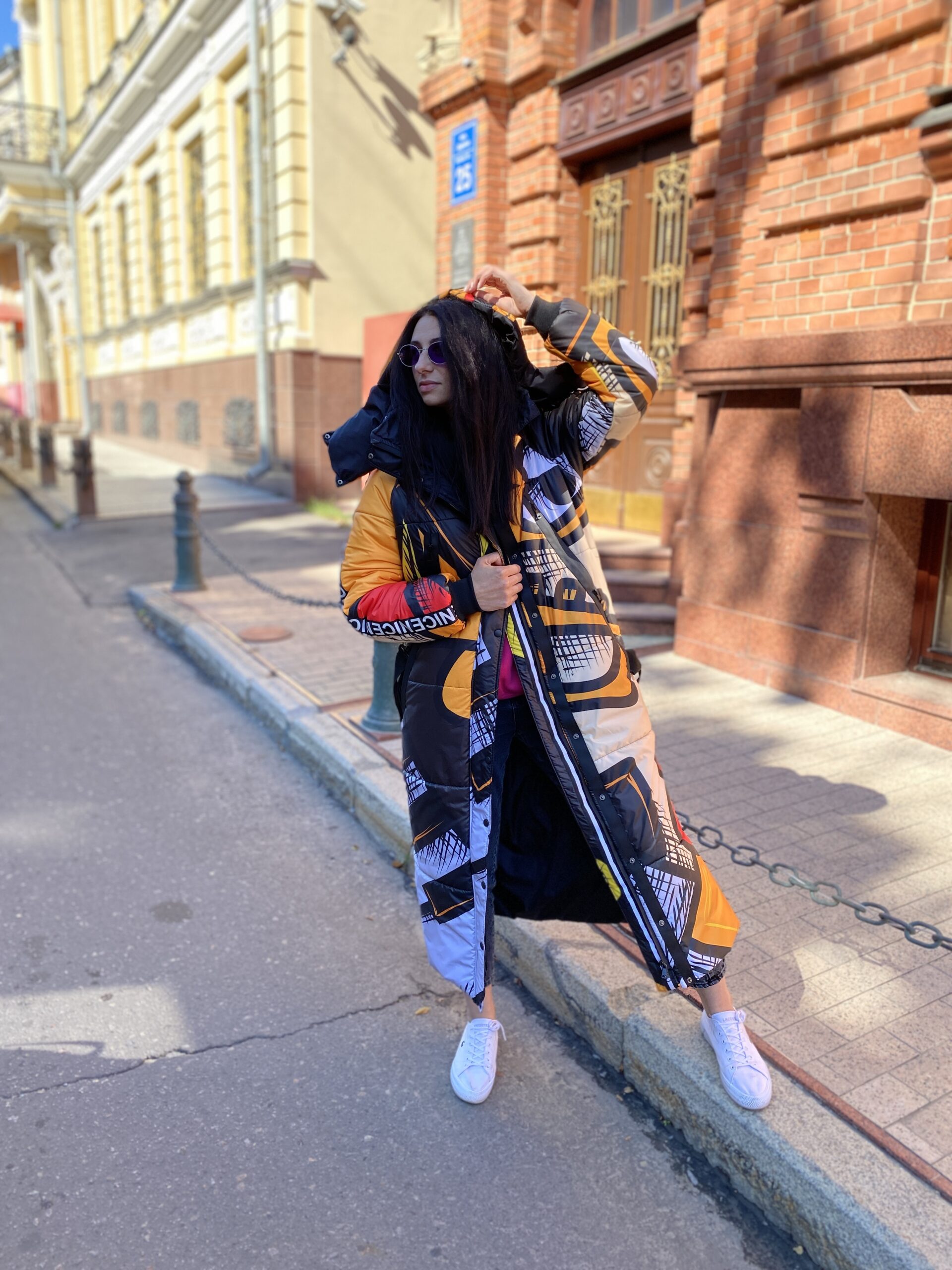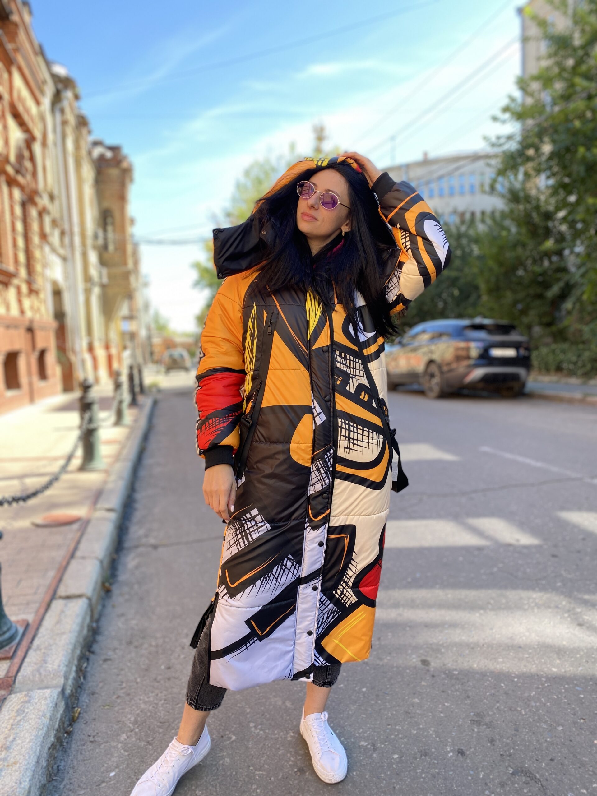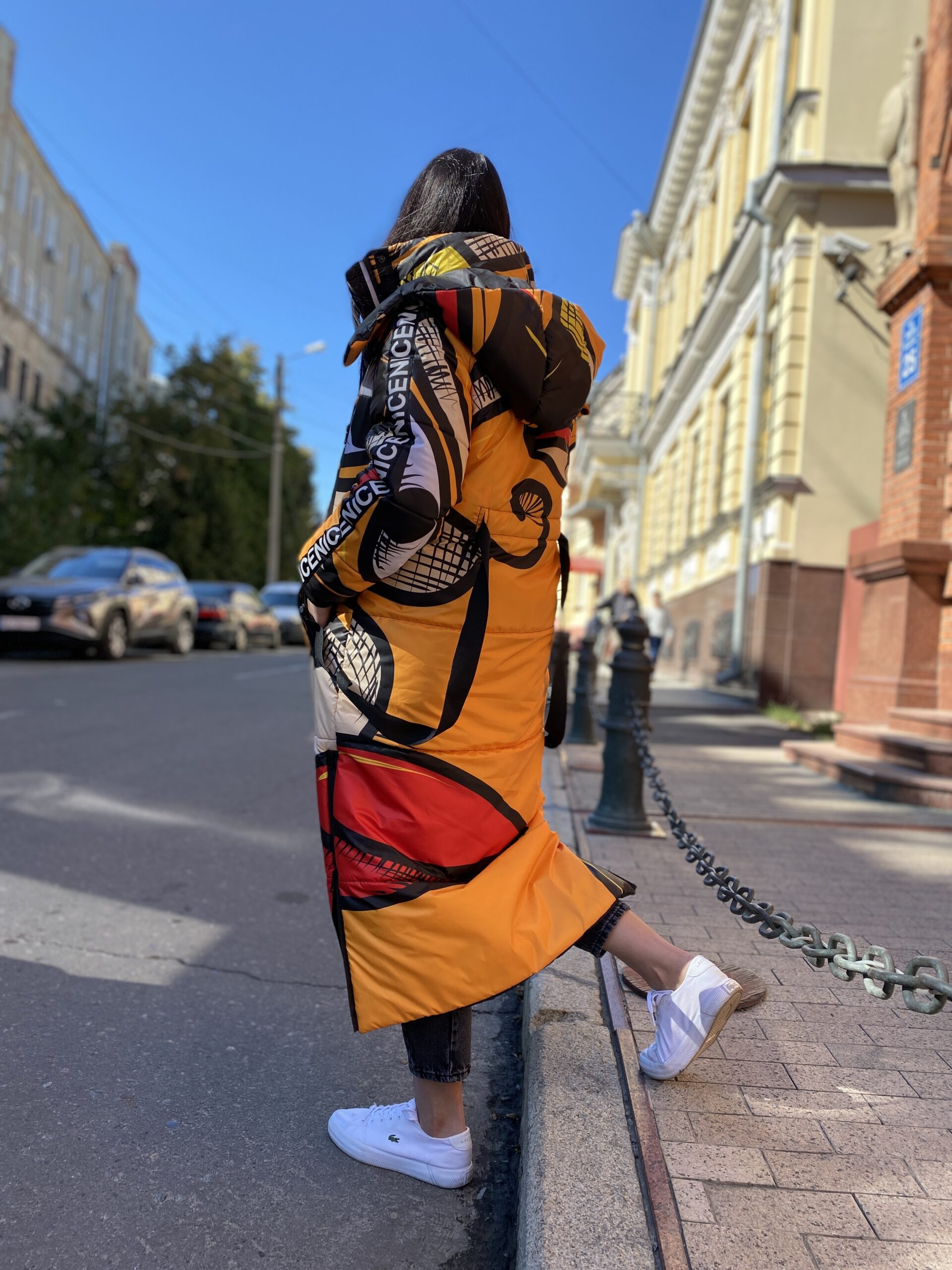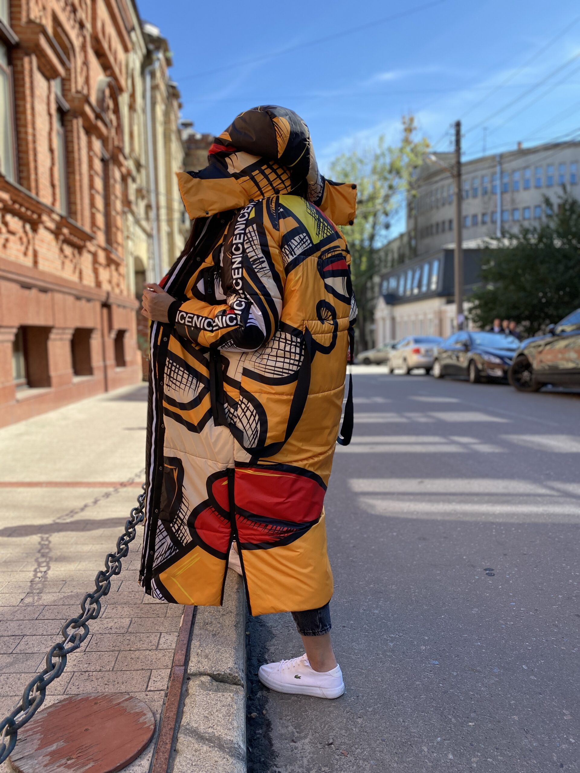 Прямий крій, блискавка двостороння – можна розстібати знизу, зверху планка із кнопками, рукава регланом, на манжетах, капюшон з’ємний: на кнопочках, є бокові розрізи, на блискавках, можна розстібати для зручності при хотьбі, є кишені по 2шт з обох сторін, всі блискавки прорезинені – захищають від дощу та снігу. Декорована стрічкою, яка застібається біля кишень, можна використовувати як пасок. Довжина 127 см, довжина рукава по зовнішньому шву від горловини 77 см, температурний режим до -20 градусів.