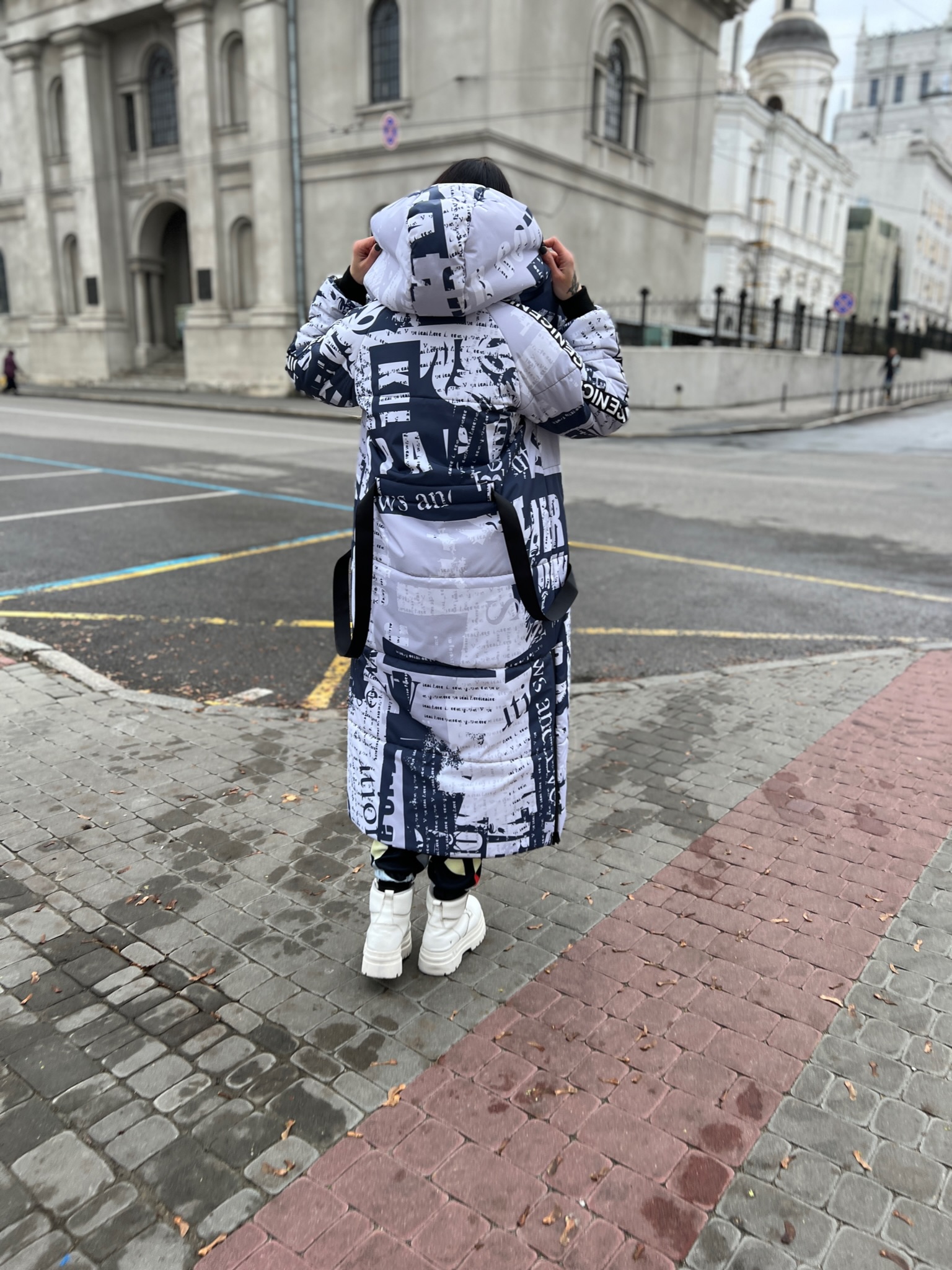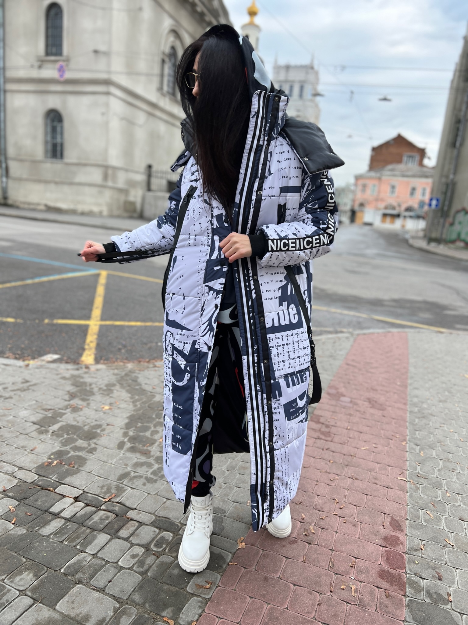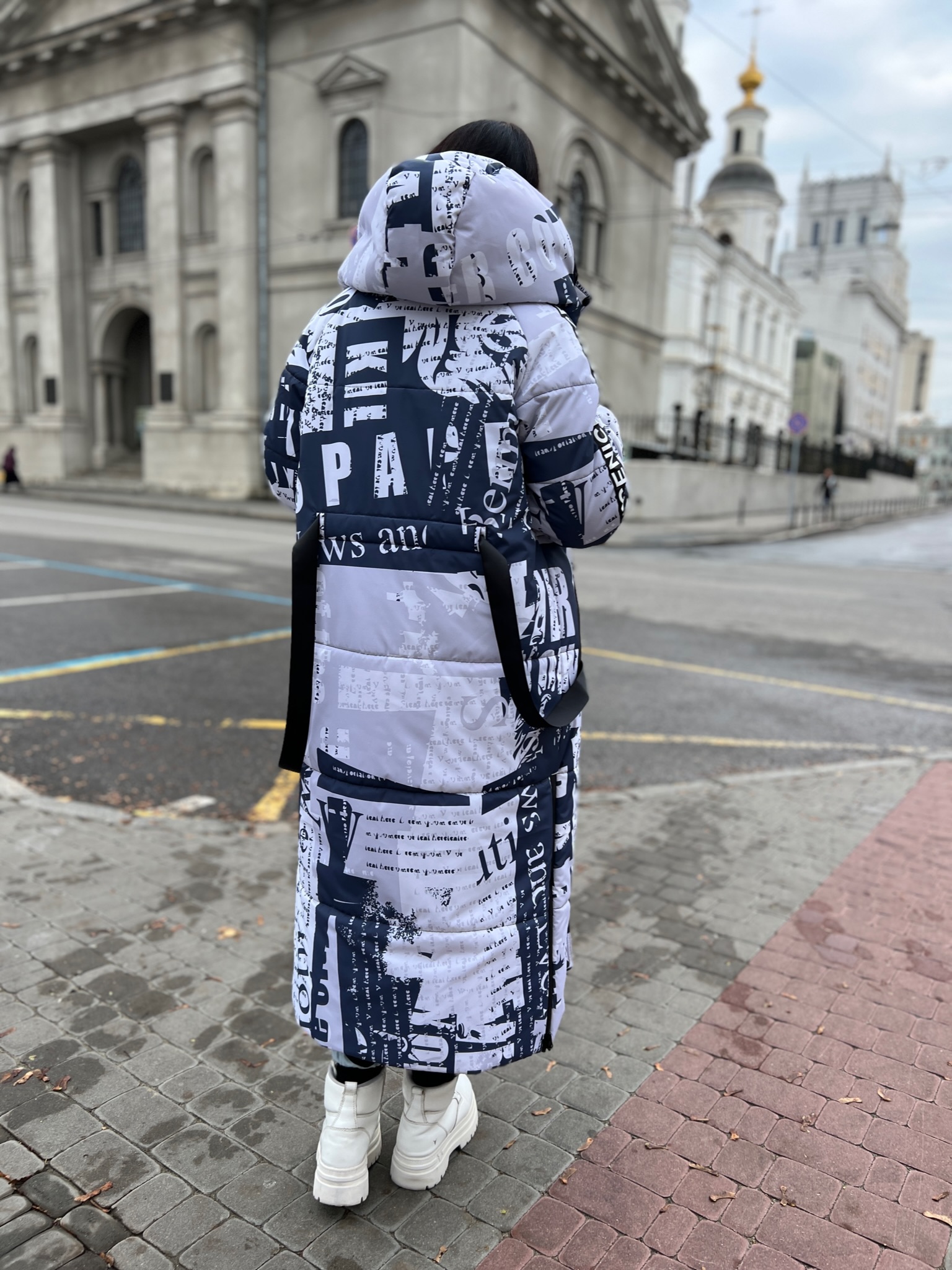 Прямий крій, блискавка двостороння – можна розстібати знизу, зверху планка із кнопками, рукава регланом, на манжетах, капюшон з’ємний: на кнопочках, є бокові розрізи, на блискавках, можна розстібати для зручності при хотьбі, є кишені по 2шт з обох сторін, всі блискавки прорезинені – захищають від дощу та снігу. Декорована стрічкою, яка застібається біля кишень, можна використовувати як пасок. Довжина 127 см, довжина рукава по зовнішньому шву від горловини 77 см, температурний режим до -20 градусів.