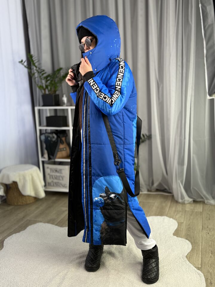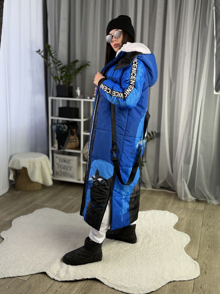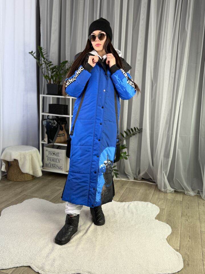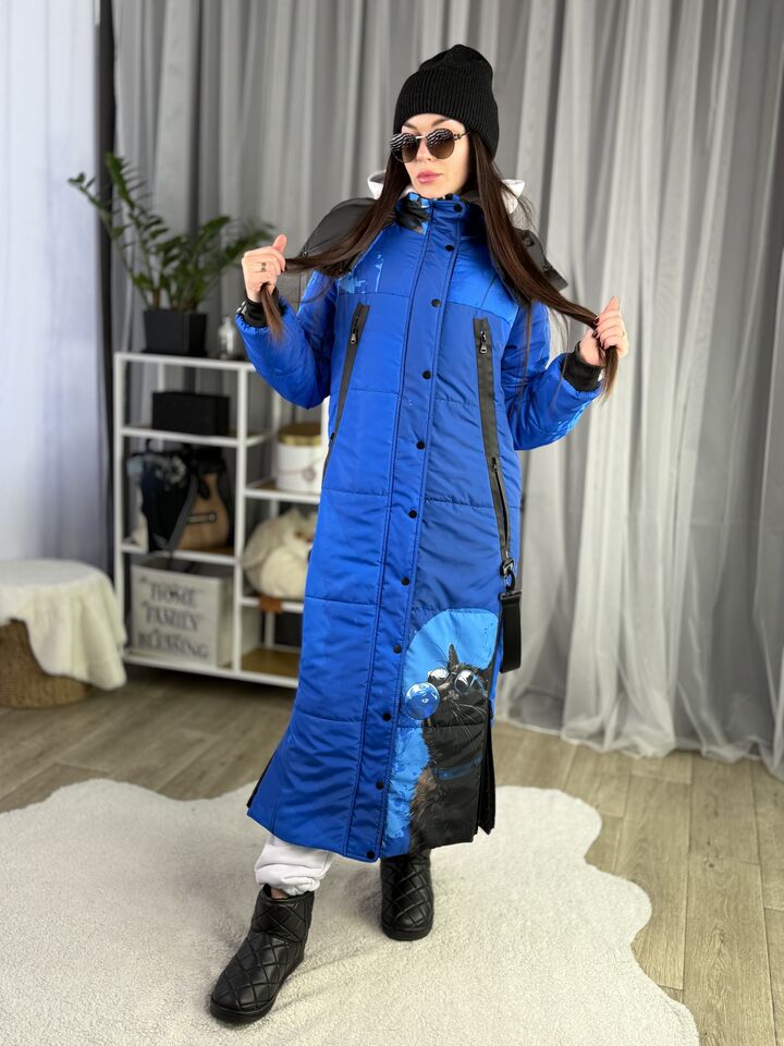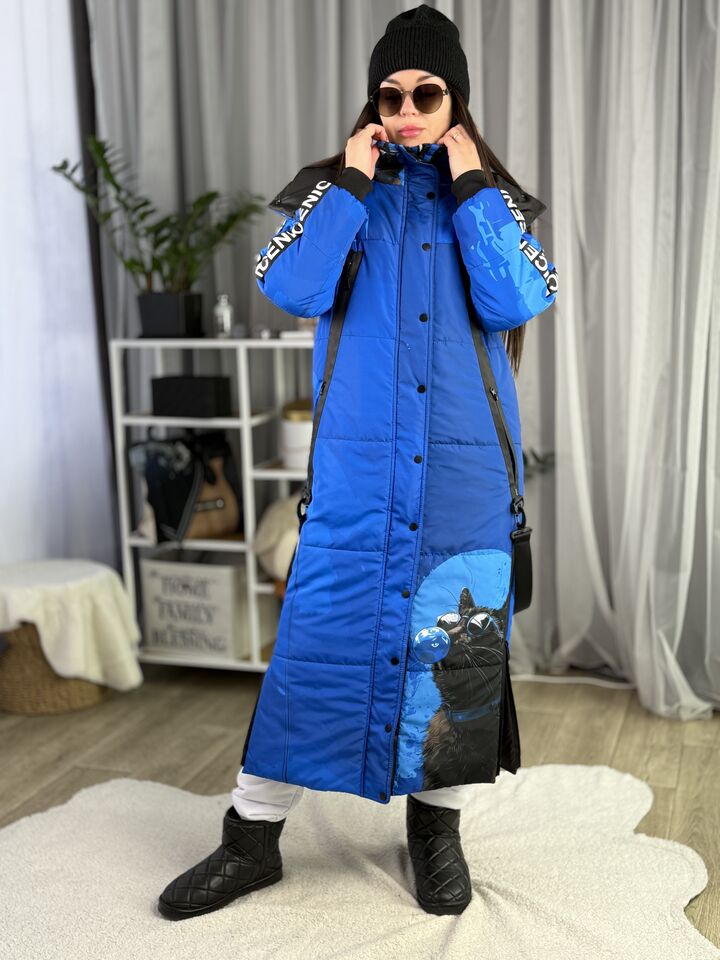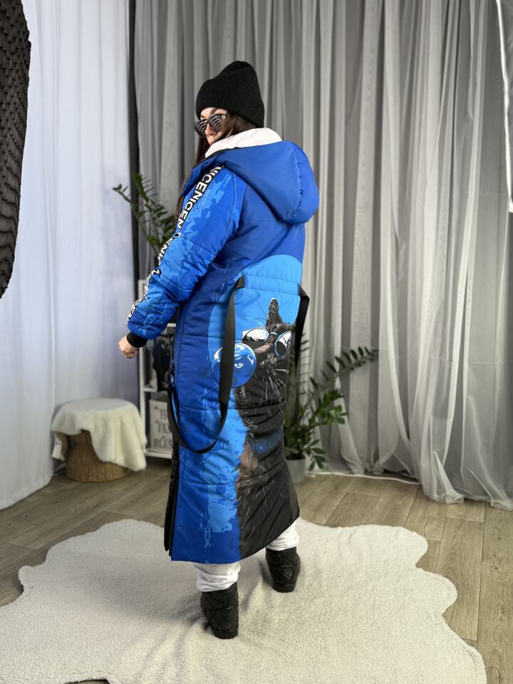 Прямий крій, блискавка двостороння – можна розстібати знизу, зверху планка із кнопками, рукава регланом, на манжетах, капюшон з’ємний: на кнопочках, є бокові розрізи, на блискавках, можна розстібати для зручності при хотьбі, є кишені по 2шт з обох сторін, всі блискавки прорезинені – захищають від дощу та снігу. Декорована стрічкою, яка застібається біля кишень, можна використовувати як пасок. Довжина 127 см, довжина рукава по зовнішньому шву від горловини 77 см, температурний режим до -20 градусів.