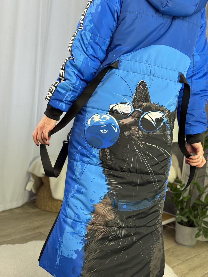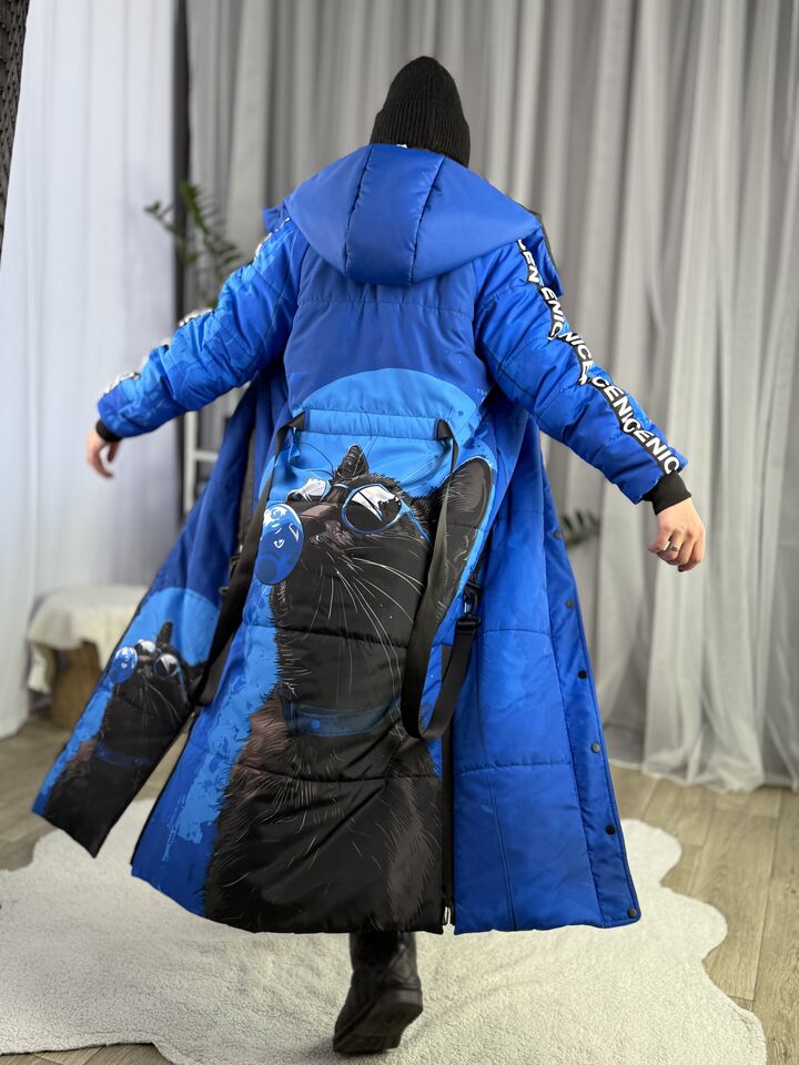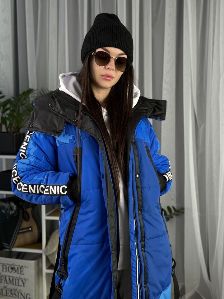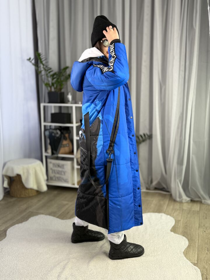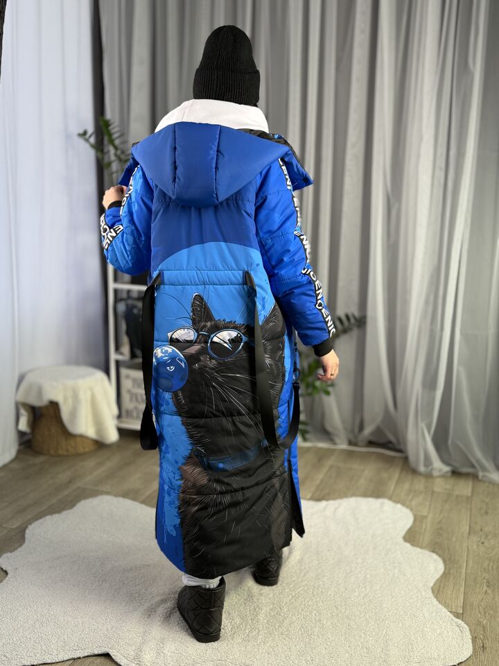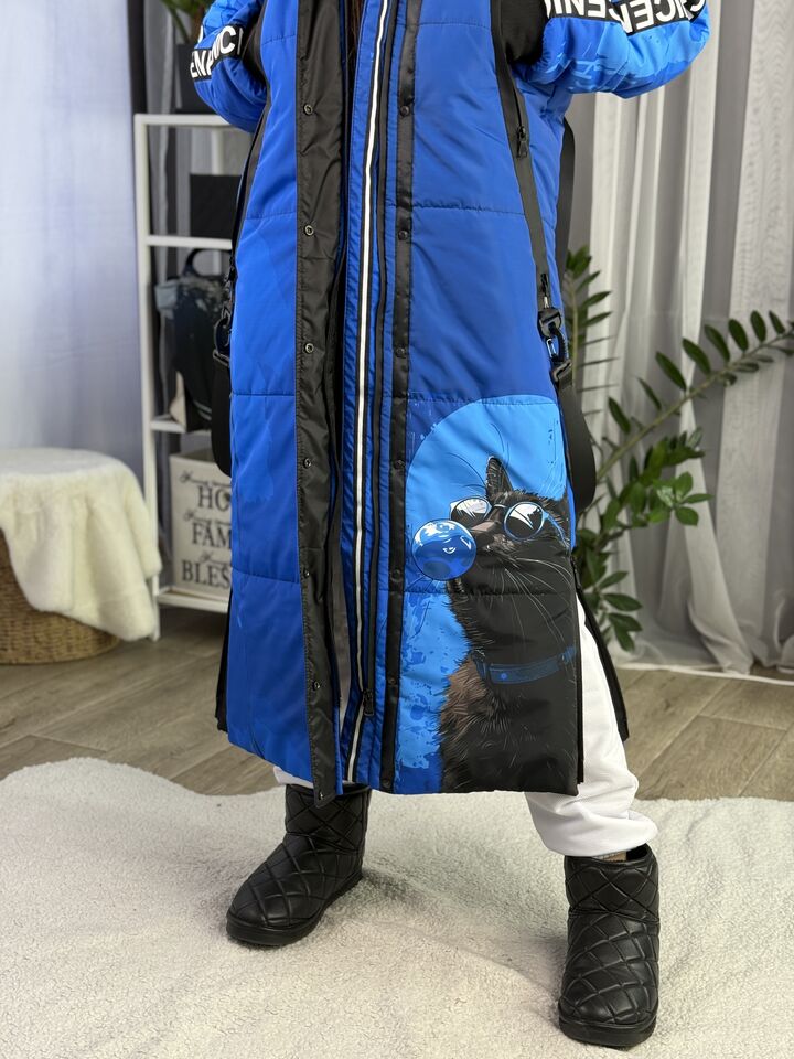 Прямий крій, блискавка двостороння – можна розстібати знизу, зверху планка із кнопками, рукава регланом, на манжетах, капюшон з’ємний: на кнопочках, є бокові розрізи, на блискавках, можна розстібати для зручності при хотьбі, є кишені по 2шт з обох сторін, всі блискавки прорезинені – захищають від дощу та снігу. Декорована стрічкою, яка застібається біля кишень, можна використовувати як пасок. Довжина 127 см, довжина рукава по зовнішньому шву від горловини 77 см, температурний режим до -20 градусів.
