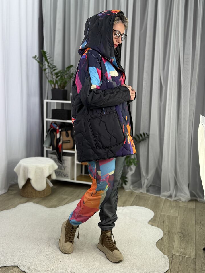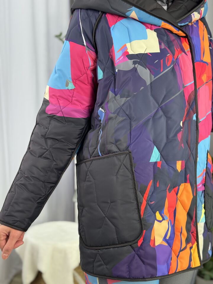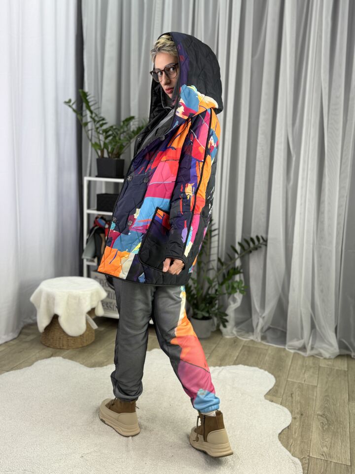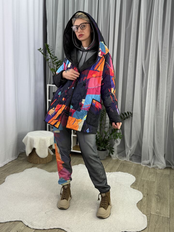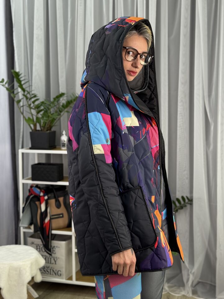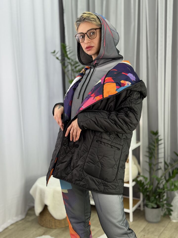 Прямого крою, зручна посадка на будь-який тип фігури, простьобане з обох боків, двостороннє: одна сторона — чорна, інша — у яскравому принті на вибір, функціональні кишені з обох боків, капюшон вшитий, об’ємний, застібається на кнопки, за потребою, можна зробити на стрічках, довжина виробу: 75 см, довжина рукава від горловини: 72 см, єврозима, температурний режим: до -10°C.