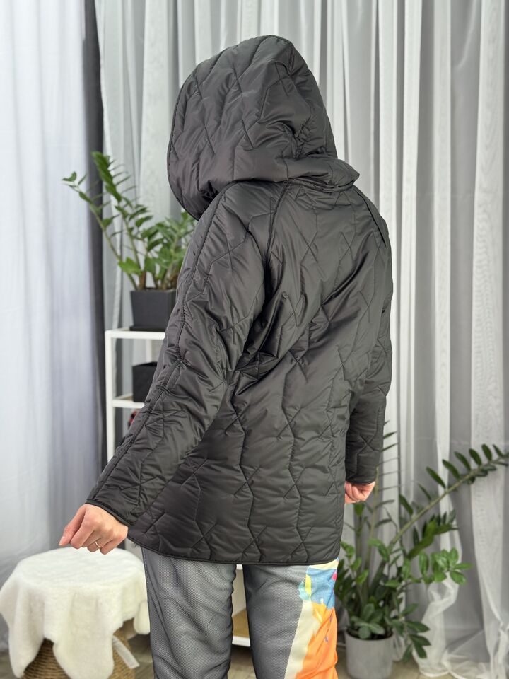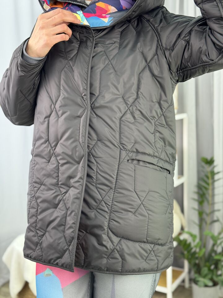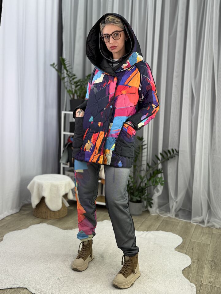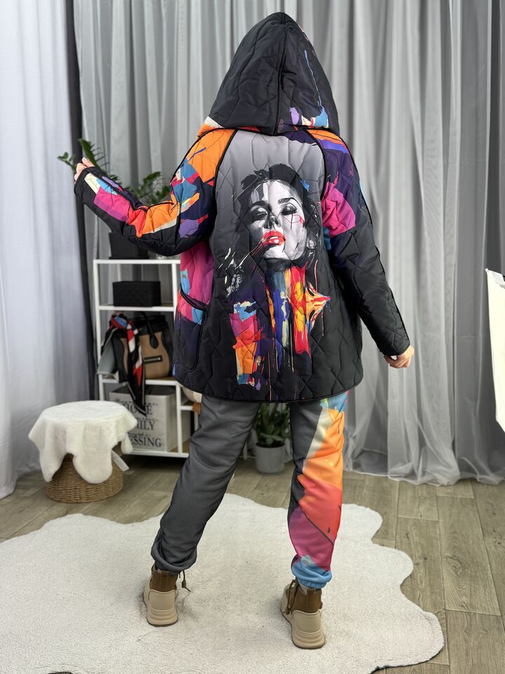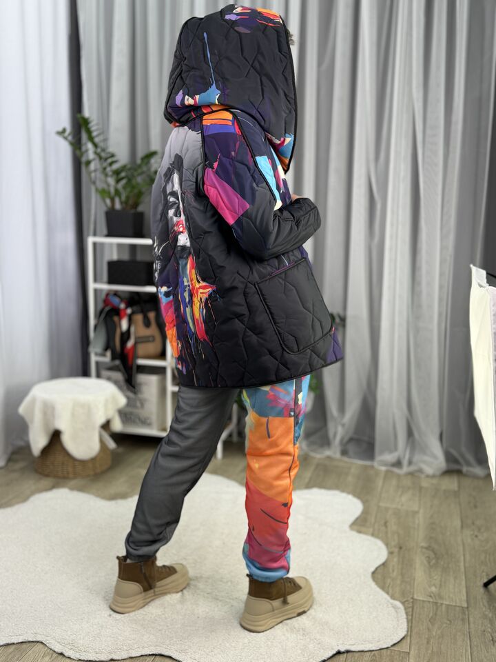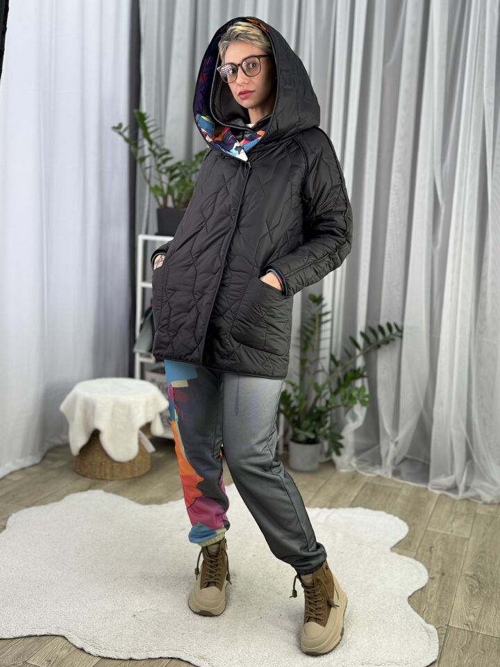 Прямого крою, зручна посадка на будь-який тип фігури, простьобане з обох боків, двостороннє: одна сторона — чорна, інша — у яскравому принті на вибір, функціональні кишені з обох боків, капюшон вшитий, об’ємний, застібається на кнопки, за потребою, можна зробити на стрічках, довжина виробу: 75 см, довжина рукава від горловини: 72 см, єврозима, температурний режим: до -10°C.
