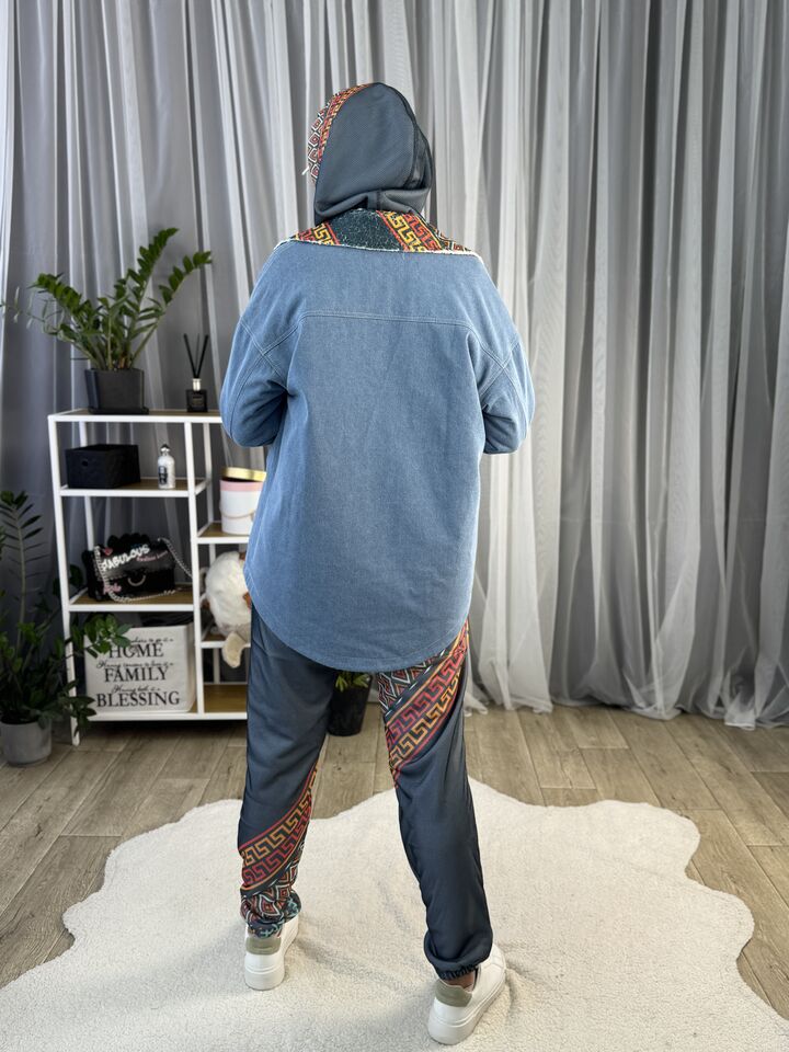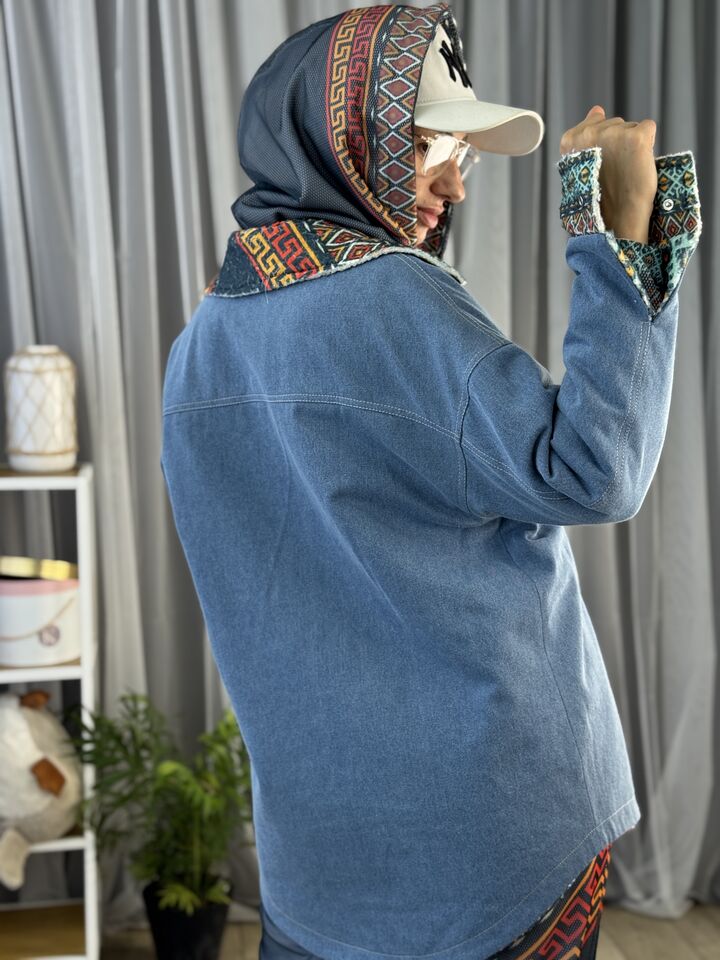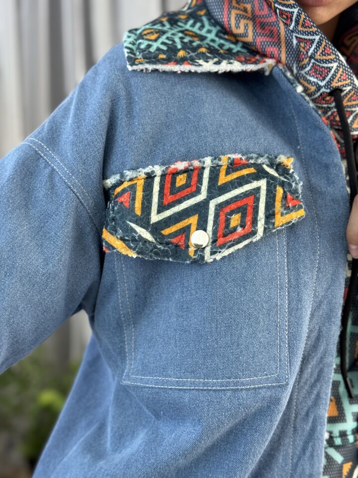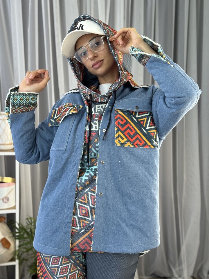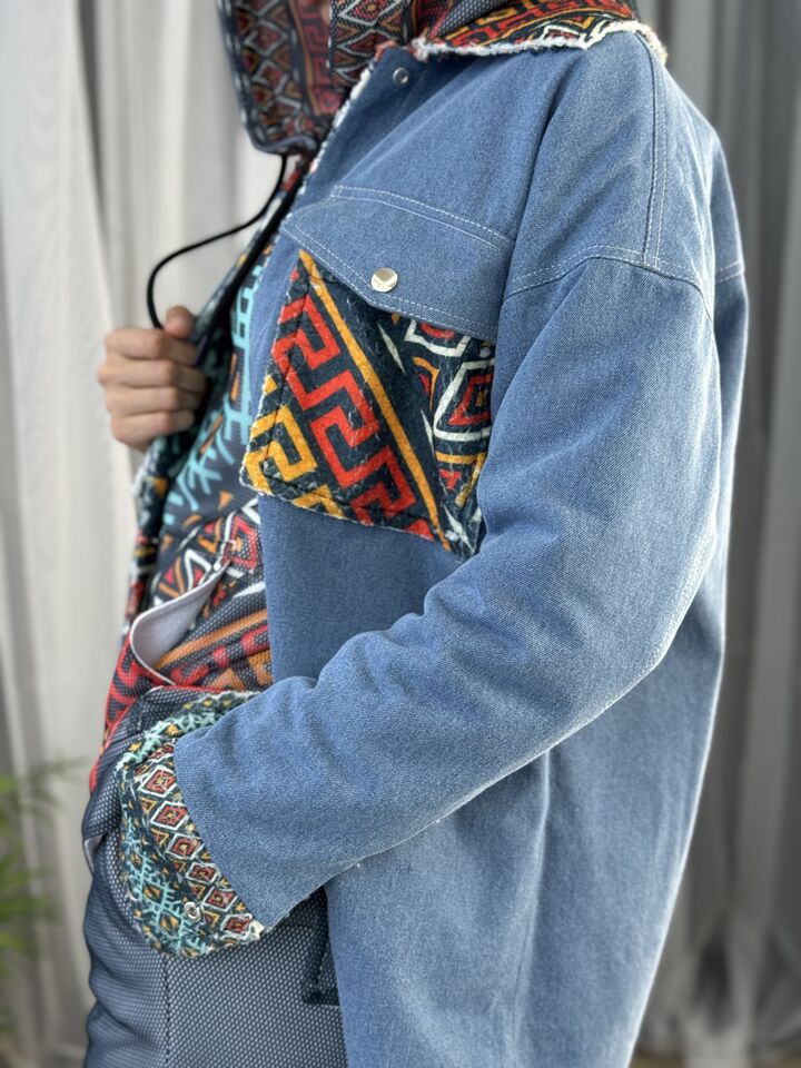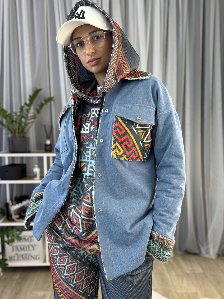 Джинсова жіноча куртка із хутром теді, двостороння, з орнаментом