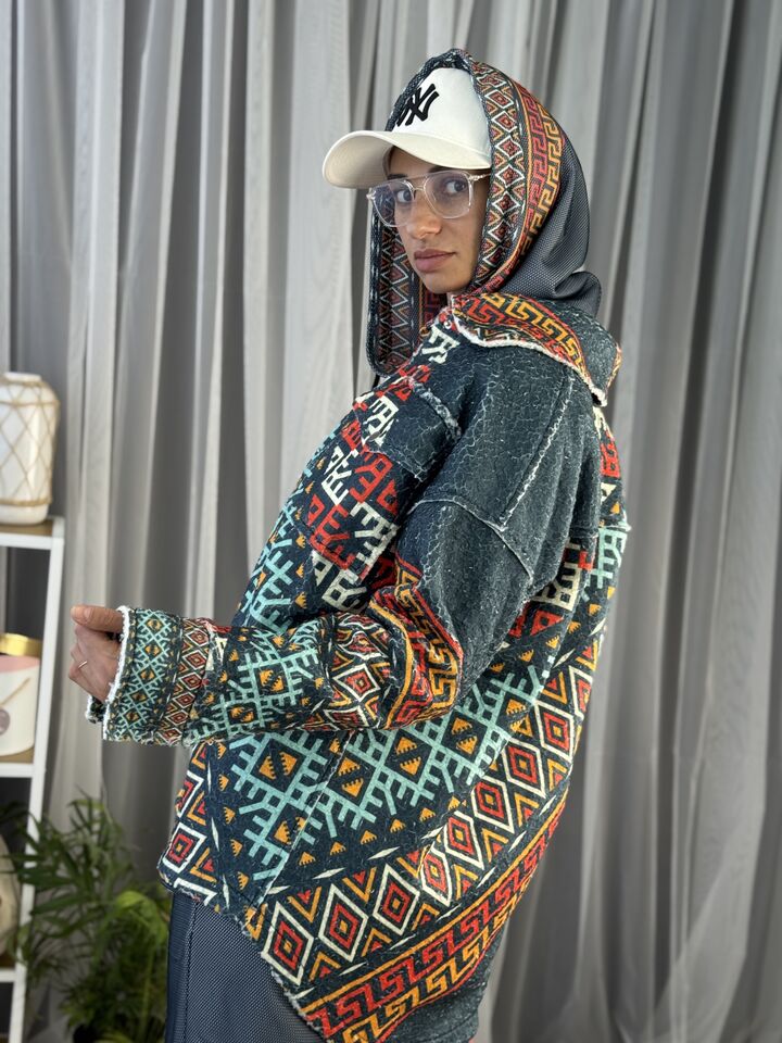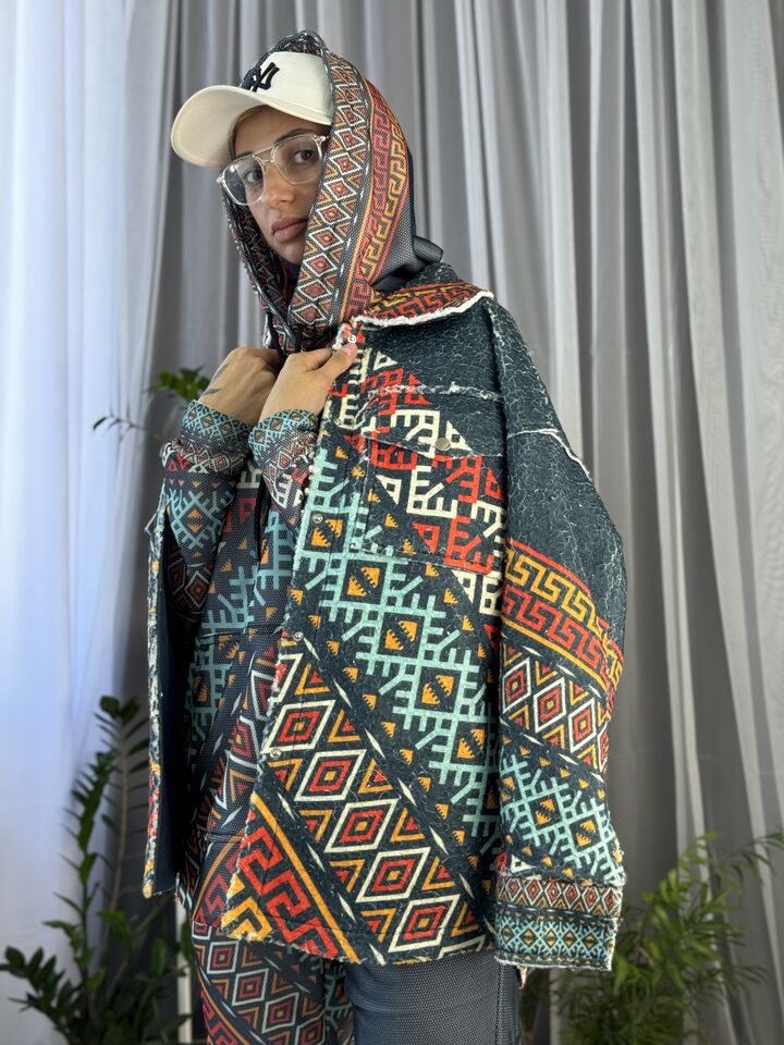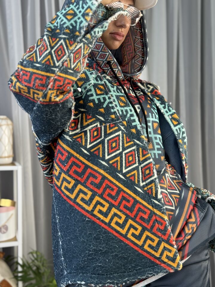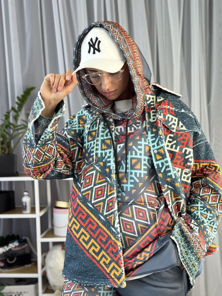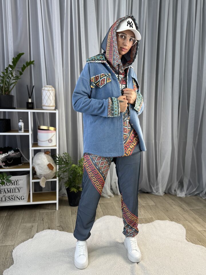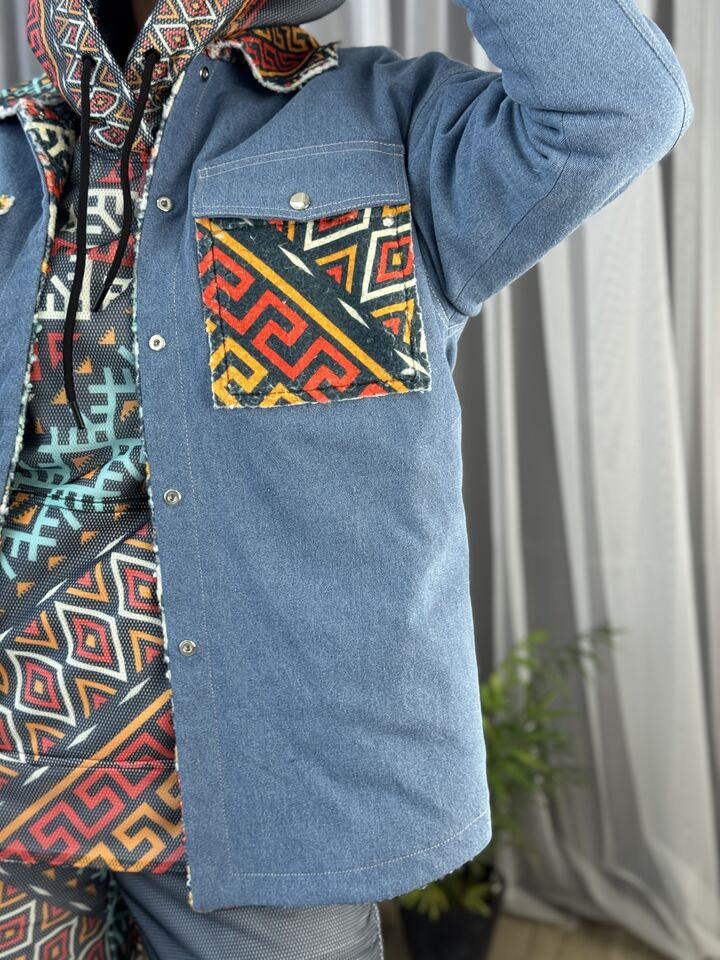 Джинсова жіноча куртка із хутром теді, двостороння, з орнаментом