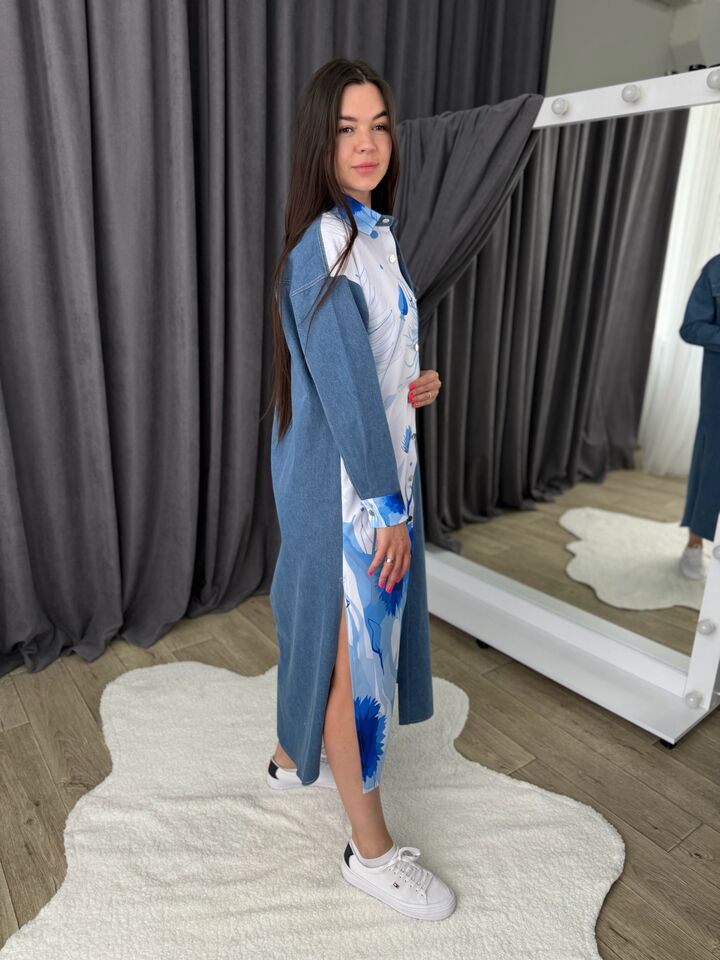 Джинсова сукня-сорочка з авторською вставкою з габардину — це стильна гра на контрастах: базовий денім і яскравий дизайнерський принт створюють сучасний, унікальний образ. Ця модель поєднує в собі практичність сорочки й виразність сукні, ідеально підходячи для міського ритму.