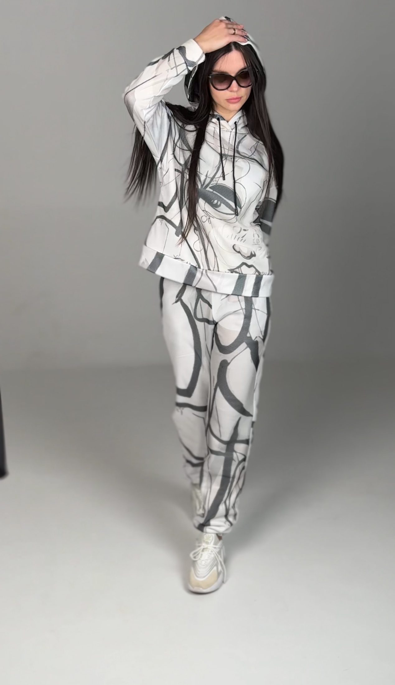 Худі вільного крою із капюшоном, кишені є, плечовий шов спущений, довжина по спинці – 70 см, довжина рукава від горловини — 73 см. Фасон штанів  – джогери із еластичною резинкою знизу, є кишені, довжина по зовнішньому шву від поясу 105 см.