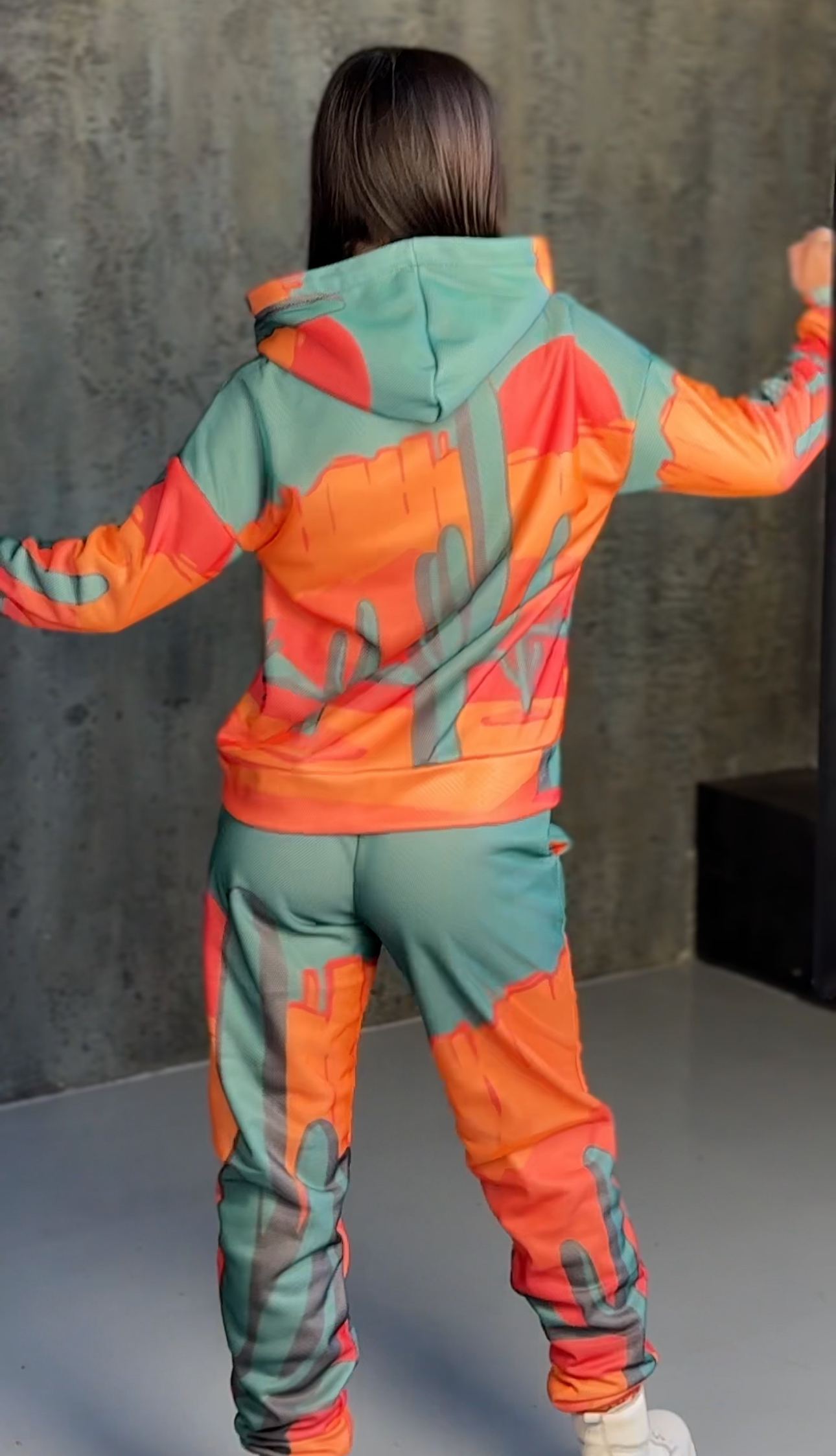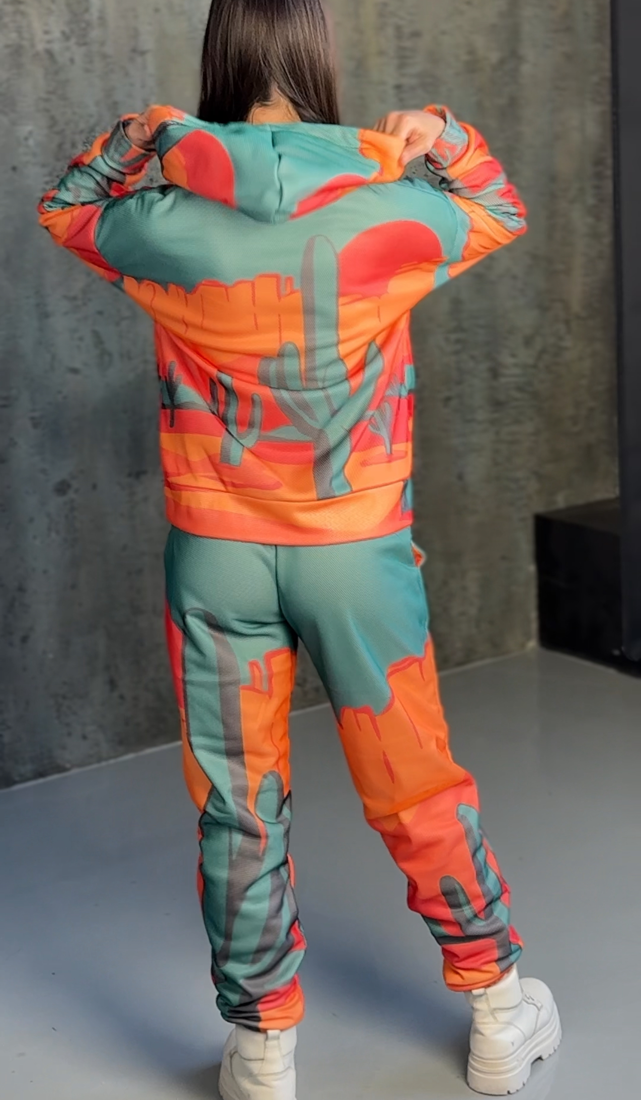 Худі вільного крою із капюшоном, кишені є, плечовий шов спущений, довжина по спинці – 70 см, довжина рукава від горловини — 73 см. Фасон штанів – джогери із еластичною резинкою знизу, є кишені, довжина по зовнішньому шву від поясу 105 см.