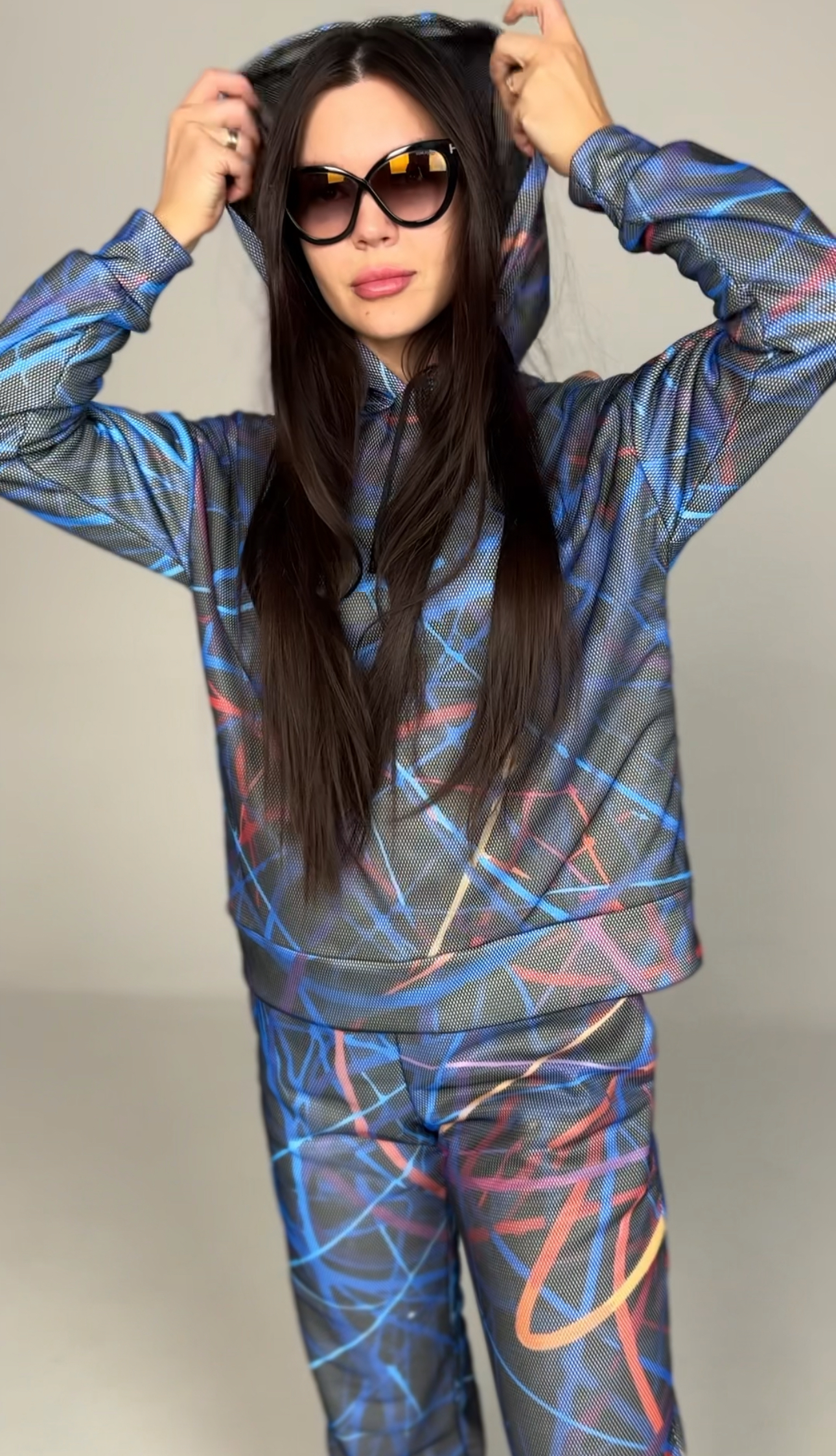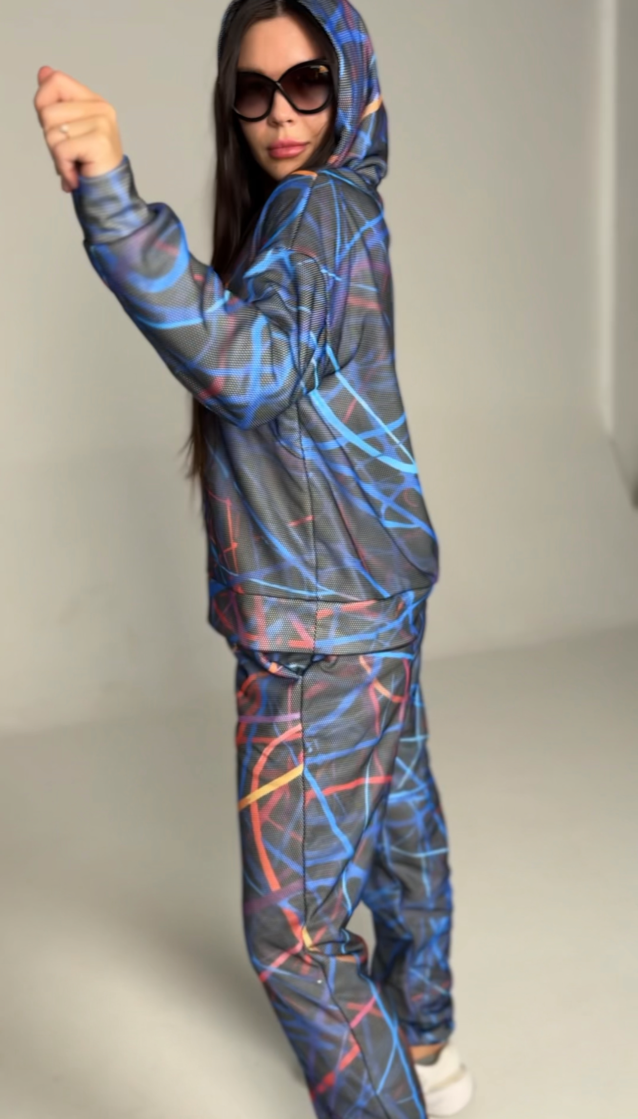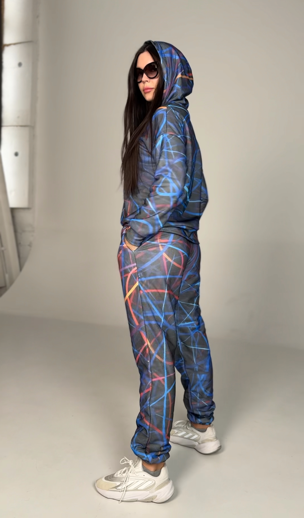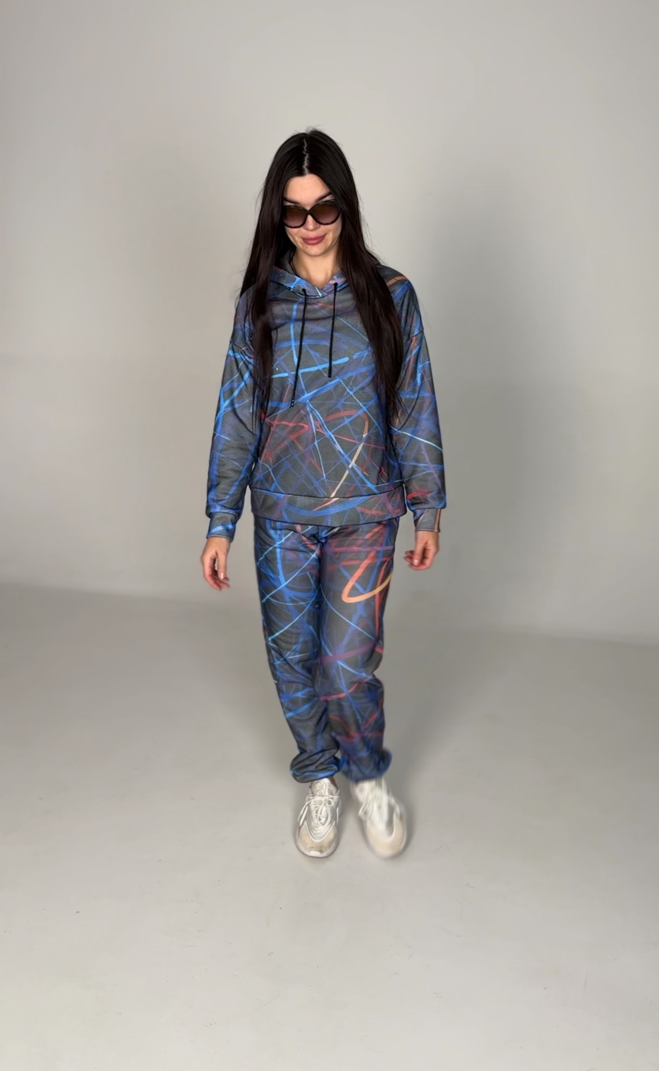 Худі вільного крою із капюшоном, кишені є, плечовий шов спущений, довжина по спинці – 70 см, довжина рукава від горловини — 73 см. Фасон штанів  – джогери із еластичною резинкою знизу, є кишені, довжина по зовнішньому шву від поясу 105 см.