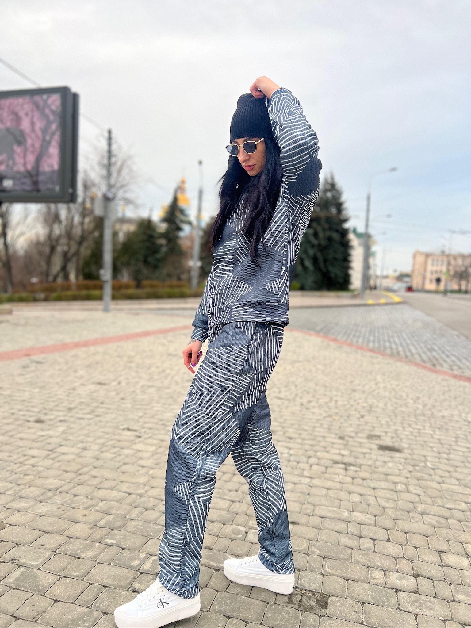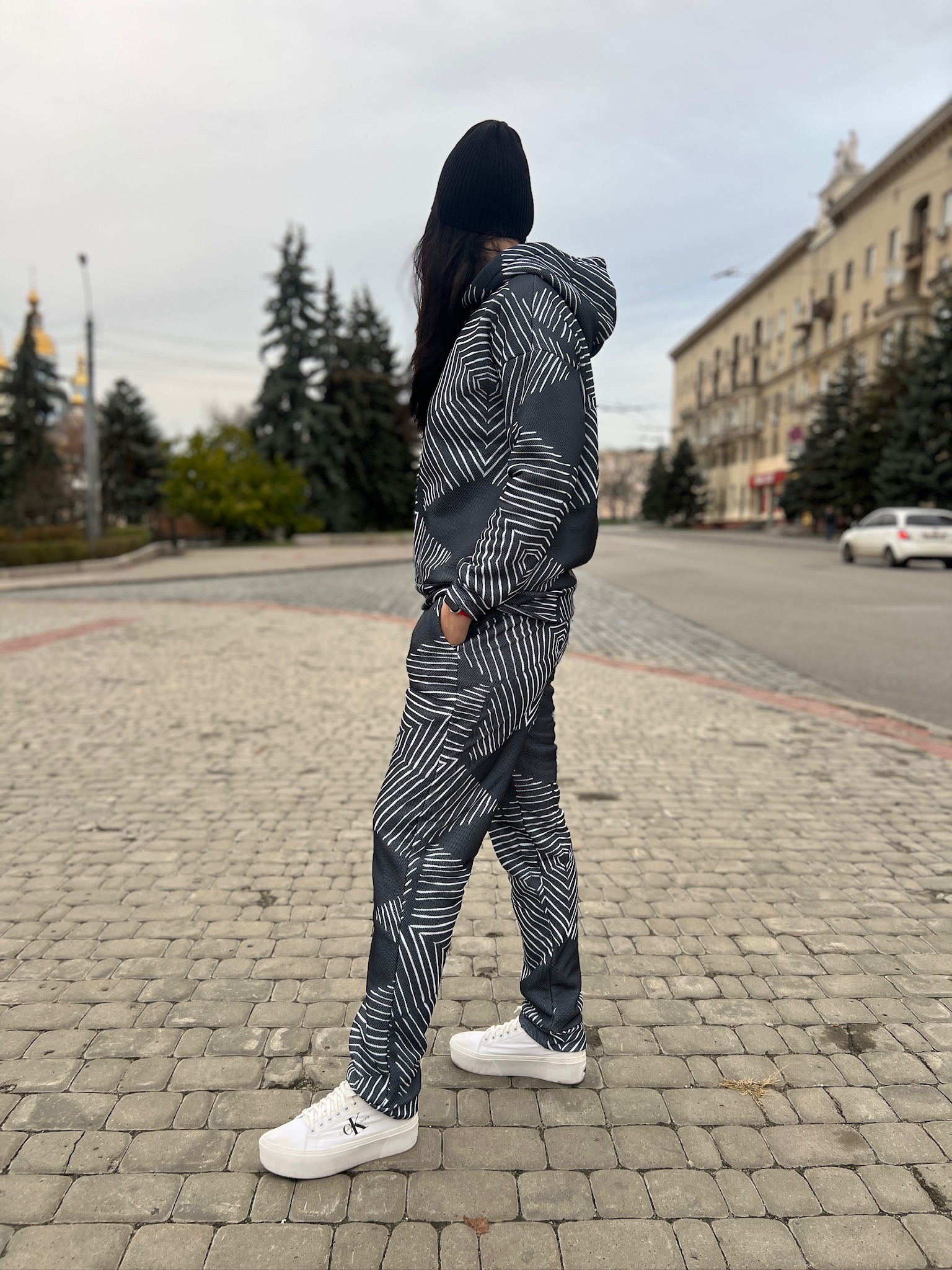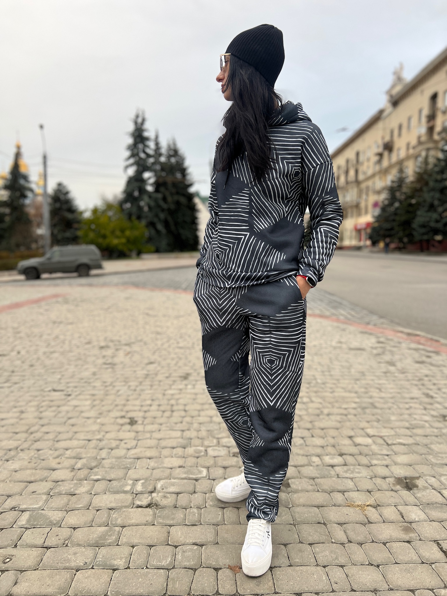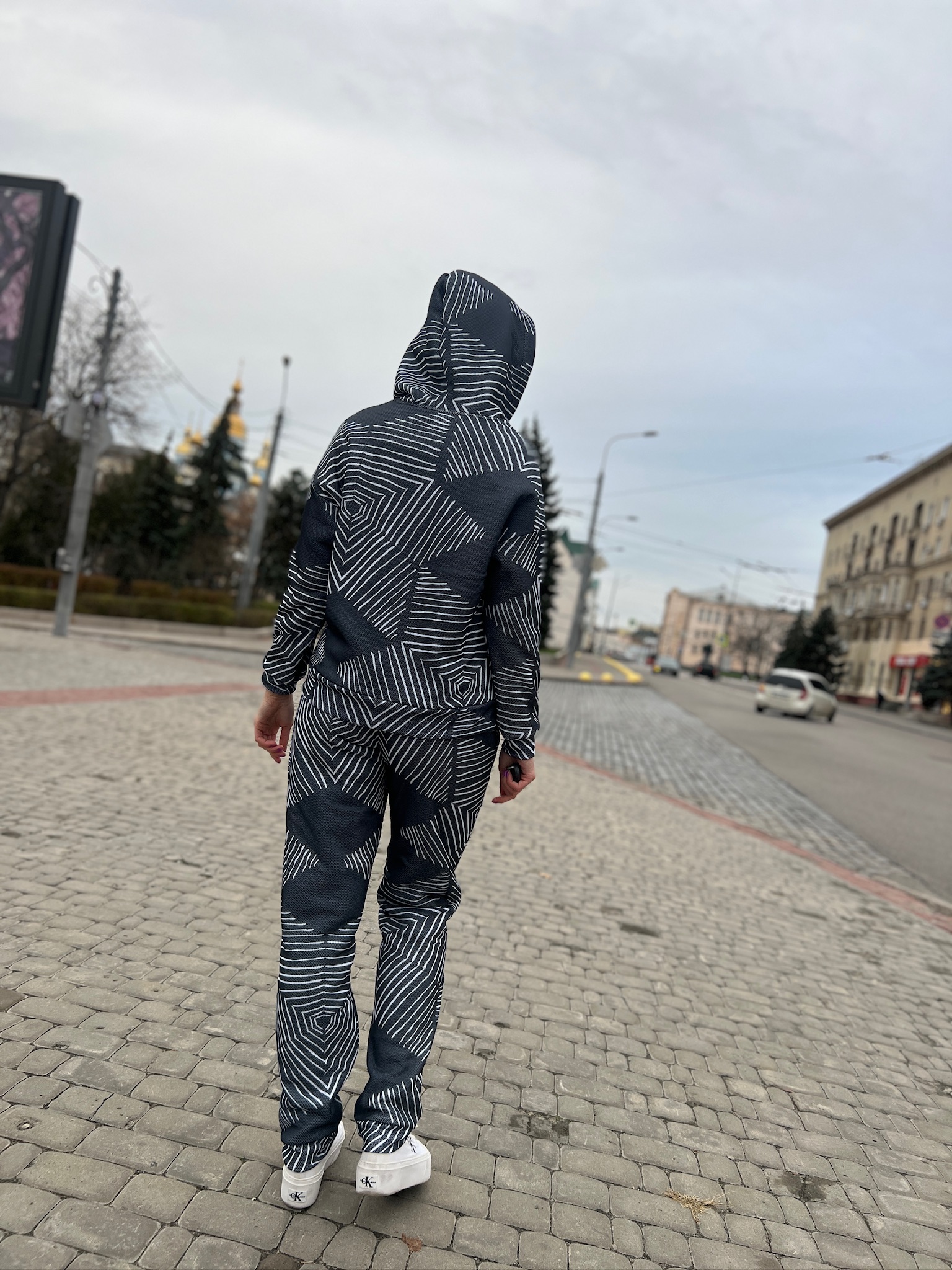 Худі вільного крою із капюшоном, кишені є, плечовий шов спущений, довжина по спинці – 70 см, довжина рукава від горловини — 73 см. Фасон штанів  – джогери із еластичною резинкою знизу, є кишені, довжина по зовнішньому шву від поясу 105 см.