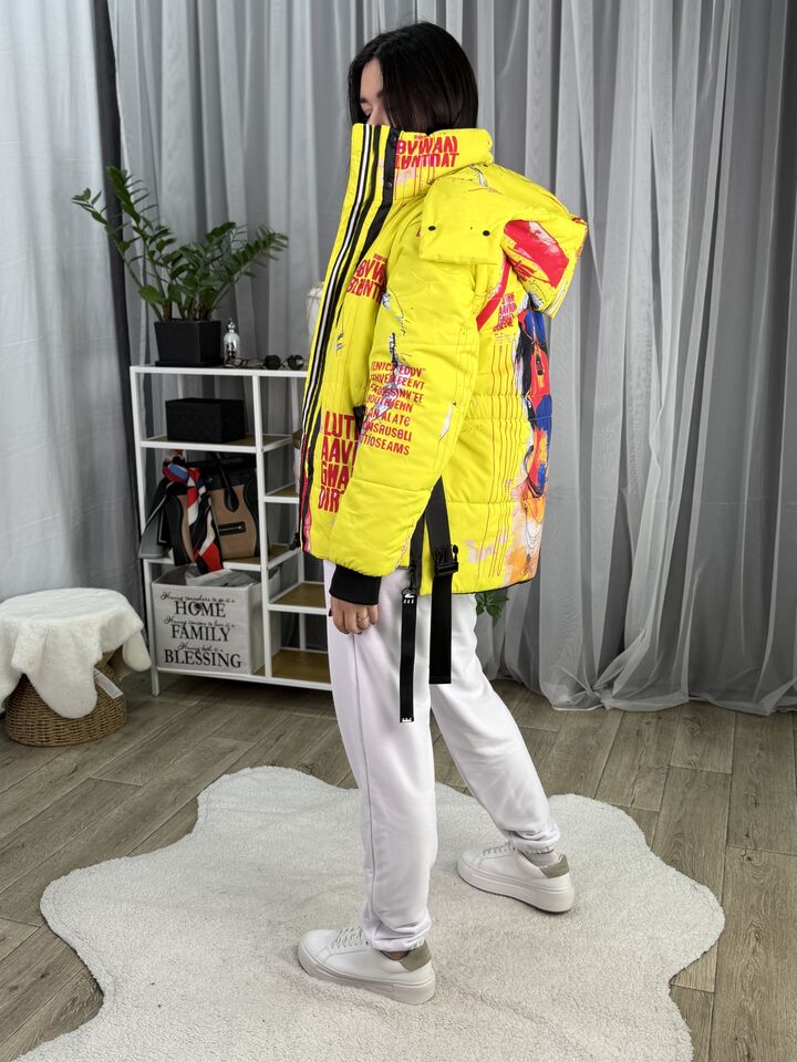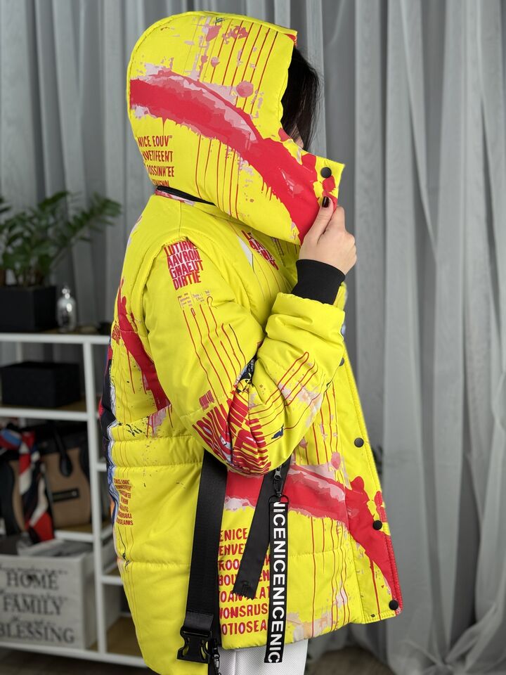 Прямий крій, блискавка двостороння – можна розстібати знизу, зверху планка із кнопками, рукава, на манжетах та відстібаються, капюшон – з’ємний, є бокові розрізи, на блискавках, можна розстібати для зручності при хотьбі, є кишені, пояс у комплекті, який підкреслює талію, всі блискавки прорезинені – захищають від дощу та снігу.  Довжина по переду 64 см, по спинці -74 см, довжина рукава 65 см по зовнішньому шву від плечового шву, це єврозима, температурний режим до -5 градусів.