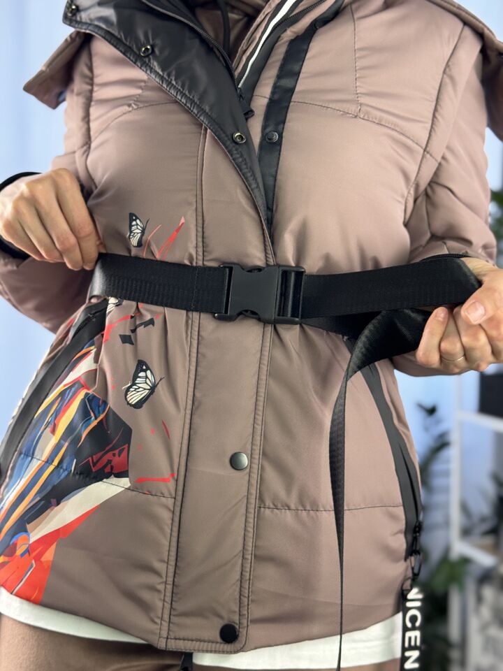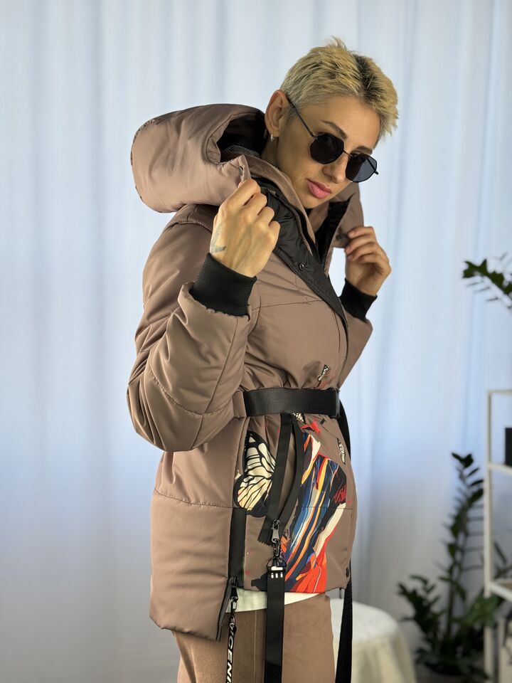 Прямий крій, блискавка двостороння – можна розстібати знизу, зверху планка із кнопками, рукава, на манжетах та відстібаються, капюшон – з’ємний, є бокові розрізи, на блискавках, можна розстібати для зручності при хотьбі, є кишені, пояс у комплекті, який підкреслює талію, всі блискавки прорезинені – захищають від дощу та снігу.  Довжина по переду 64 см, по спинці -74 см, довжина рукава 65 см по зовнішньому шву від плечового шву, це єврозима, температурний режим до -5 градусів.