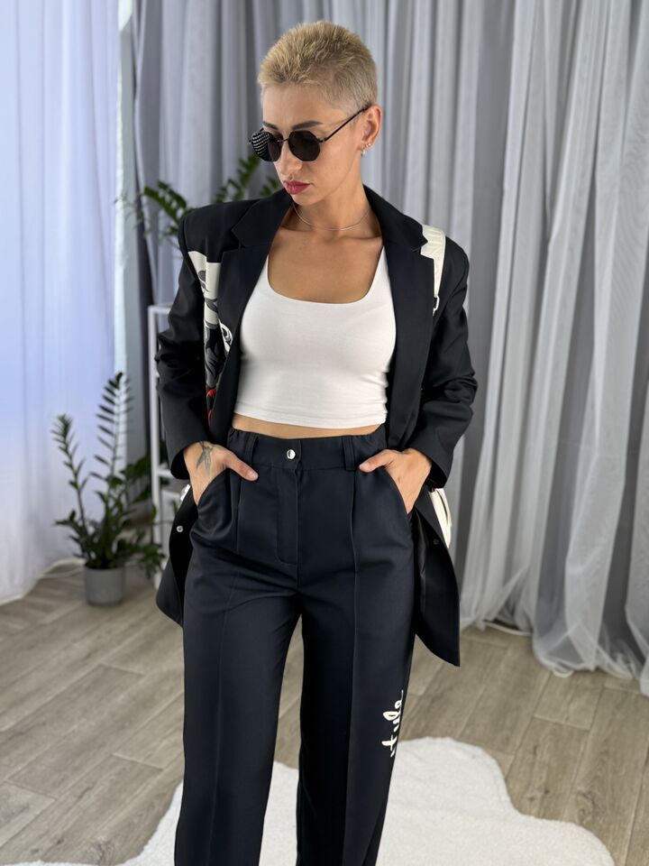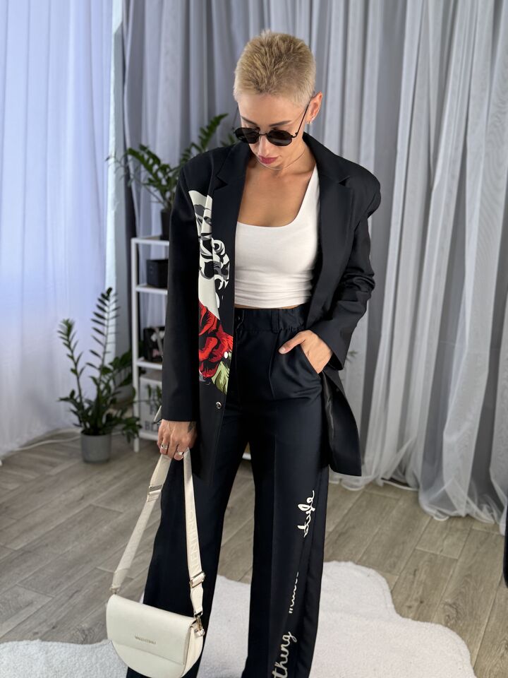 Жіночий брючний костюм, чорний із трояндою