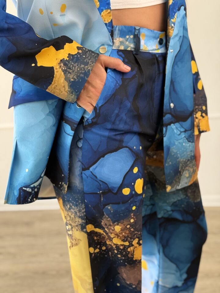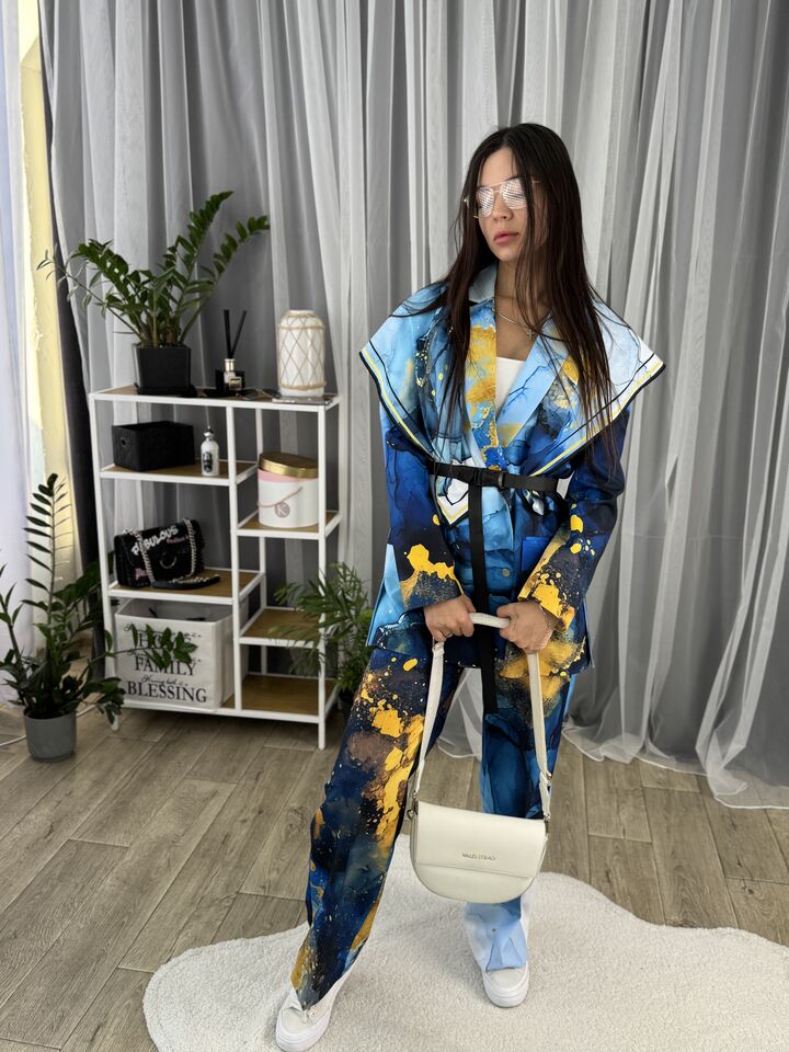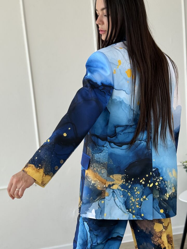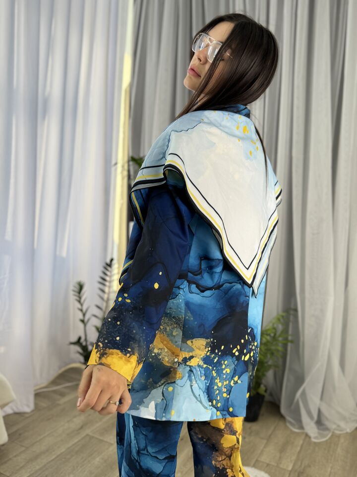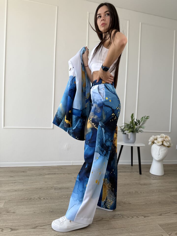 Жіночий костюм з авторським принтом — це сучасна класика з акцентом на стиль і комфорт. Складається з жакета вільного крою та брюк прямого силуету. Завдяки силуету oversize і продуманим деталям, комплект підходить як для ділового образу, так і для кежуал-виходів.