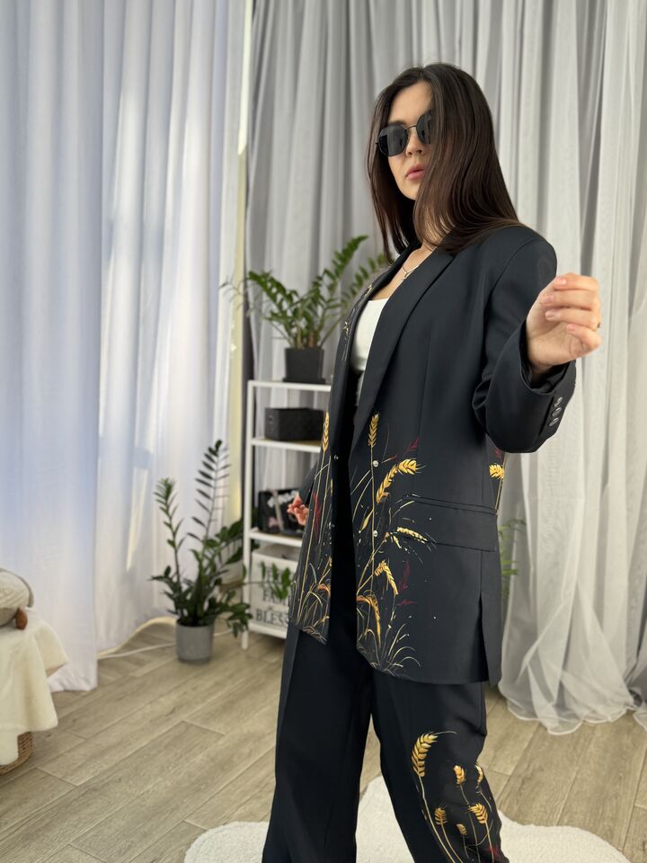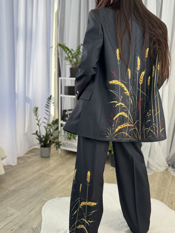 Жіночий брючний костюм, чорний із колосками