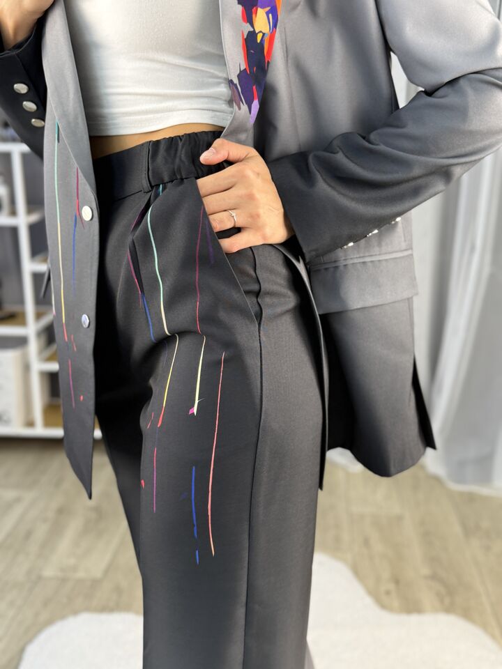 Жіночий костюм з авторським принтом — це сучасна класика з акцентом на стиль і комфорт. Складається з жакета вільного крою та брюк прямого силуету. Завдяки силуету oversize і продуманим деталям, комплект підходить як для ділового образу, так і для кежуал-виходів.
