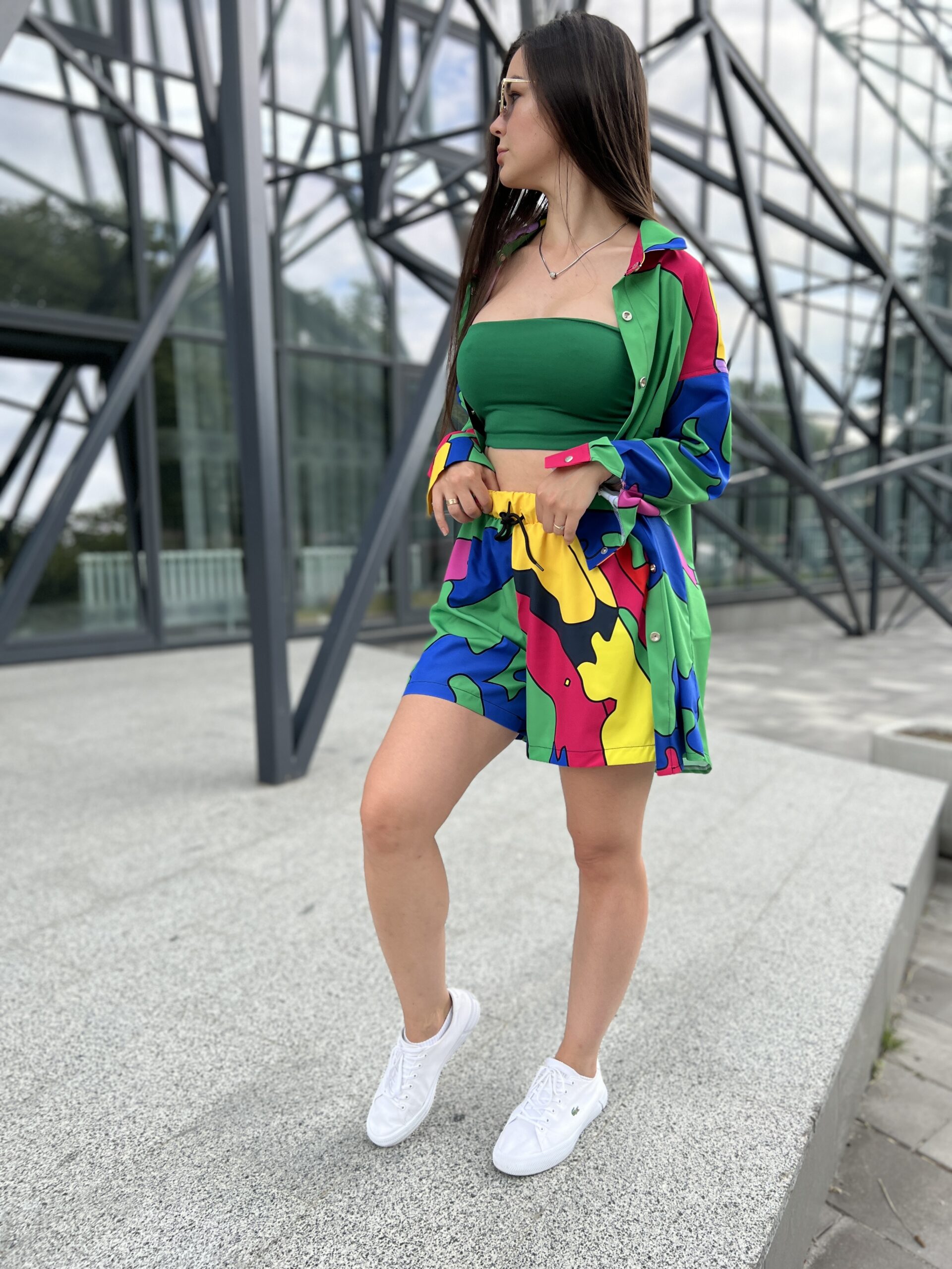 Літній костюм із сорочки та шортів — поєднання легкості, комфорту й актуального дизайну. Ідеально підходить для міських прогулянок, подорожей, відпочинку на природі або стильного повсякденного образу.