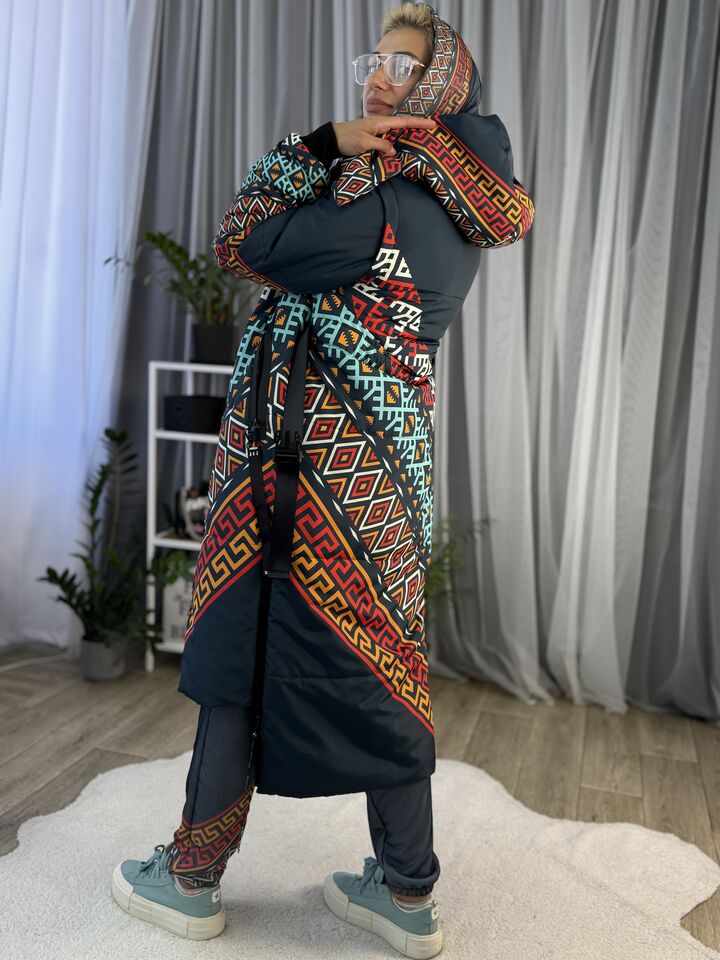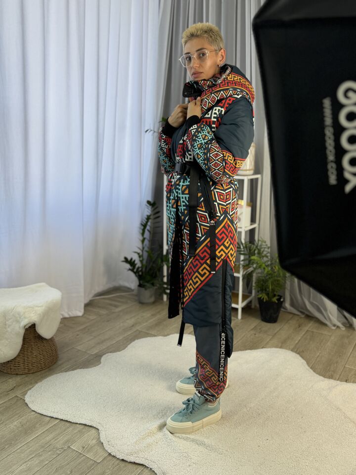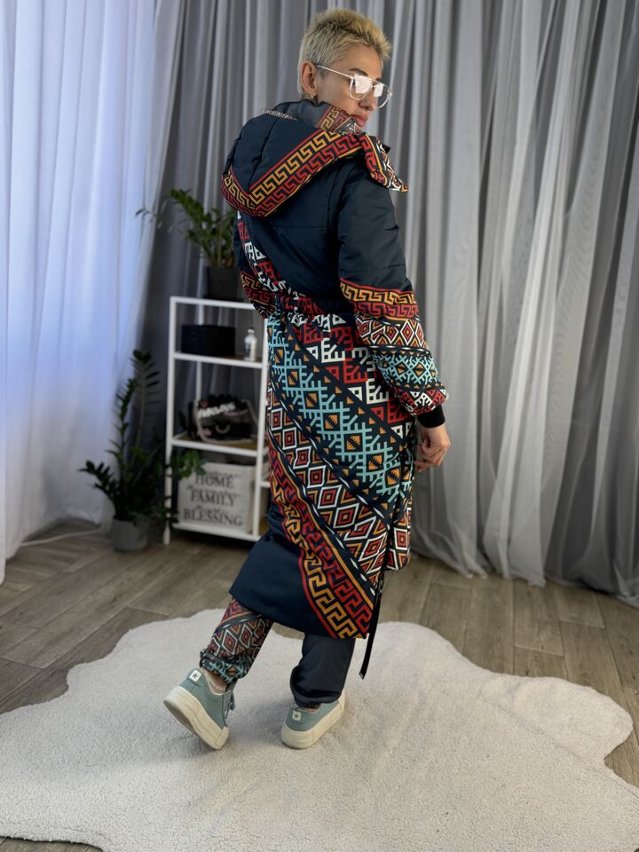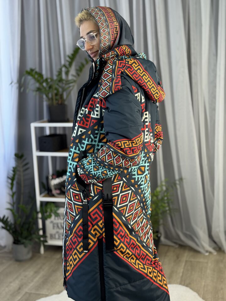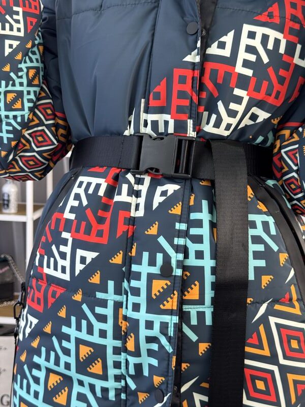 Прямий крій, блискавка двостороння – можна розстібати знизу, зверху планка із кнопками, рукава, на манжетах та відстібаються, капюшон – з’ємний, є бокові розрізи, на блискавках, можна розстібати для зручності при хотьбі, є кишені, пояс у комплекті, який підкреслює талію, всі блискавки прорезинені – захищають від дощу та снігу.  Довжина по переду 114 см, по спинці -132 см, довжина рукава 65 см по зовнішньому шву від плечового шву, це єврозима, температурний режим до -10 градусів.