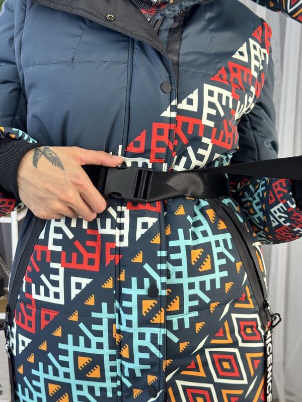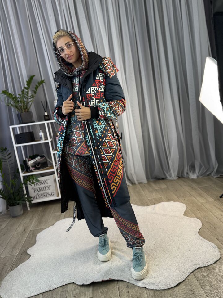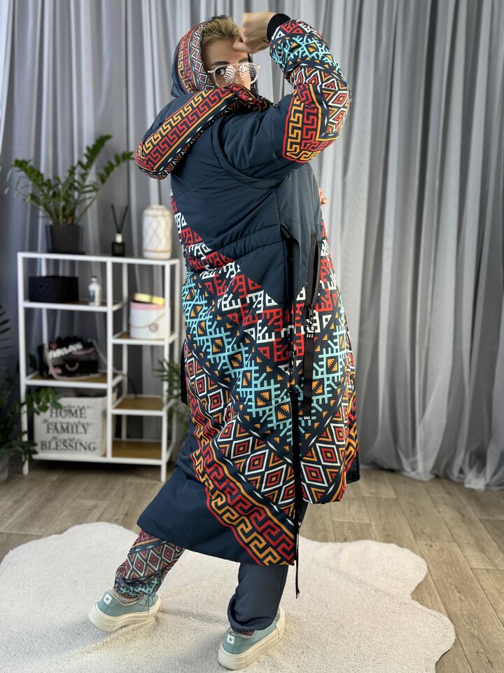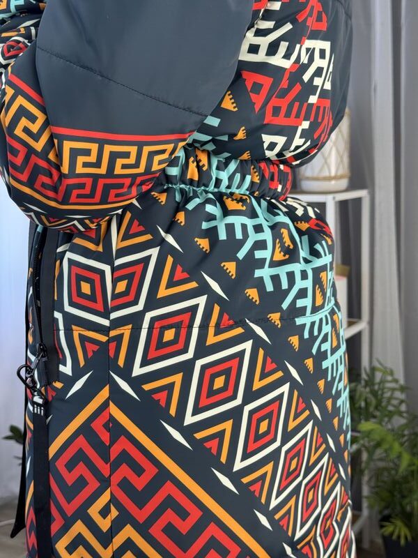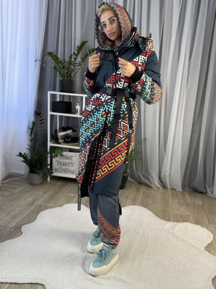 Прямий крій, блискавка двостороння – можна розстібати знизу, зверху планка із кнопками, рукава, на манжетах та відстібаються, капюшон – з’ємний, є бокові розрізи, на блискавках, можна розстібати для зручності при хотьбі, є кишені, пояс у комплекті, який підкреслює талію, всі блискавки прорезинені – захищають від дощу та снігу.  Довжина по переду 114 см, по спинці -132 см, довжина рукава 65 см по зовнішньому шву від плечового шву, це єврозима, температурний режим до -10 градусів.