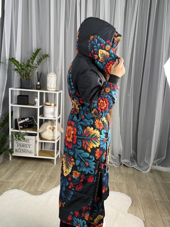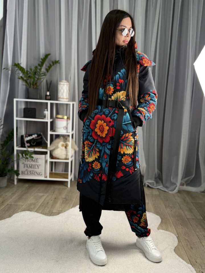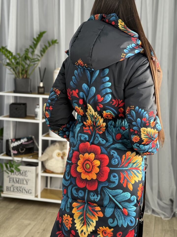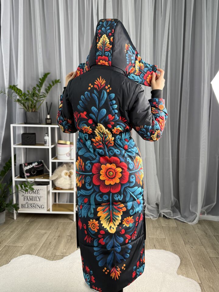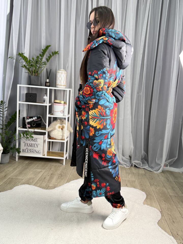 Прямий крій, блискавка двостороння – можна розстібати знизу, зверху планка із кнопками, рукава, на манжетах та відстібаються, капюшон – з’ємний, є бокові розрізи, на блискавках, можна розстібати для зручності при хотьбі, є кишені, пояс у комплекті, який підкреслює талію, всі блискавки прорезинені – захищають від дощу та снігу.  Довжина по переду 114 см, по спинці -132 см, довжина рукава 65 см по зовнішньому шву від плечового шву, це єврозима, температурний режим до -10 градусів.