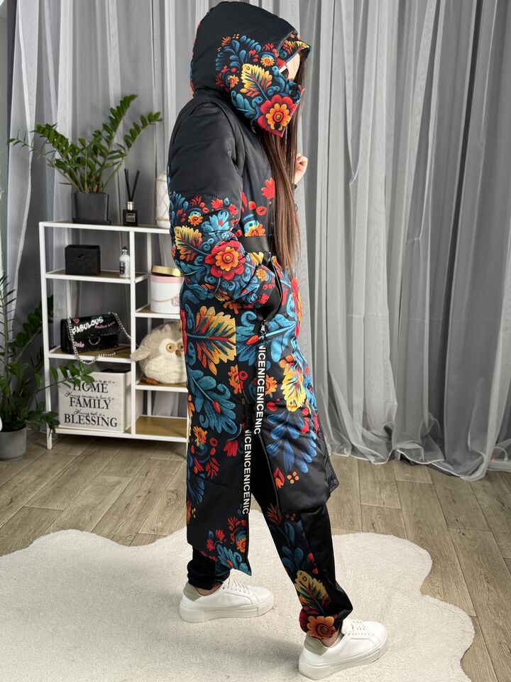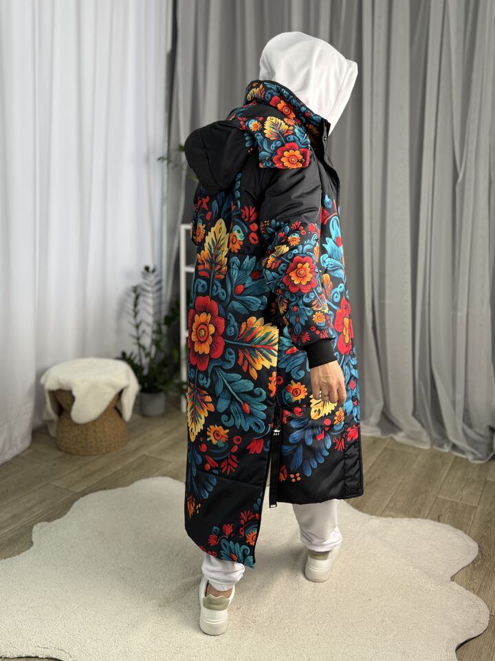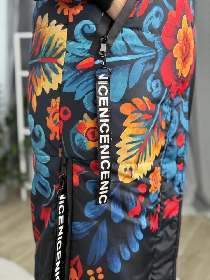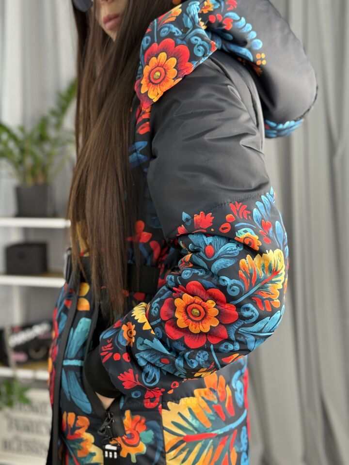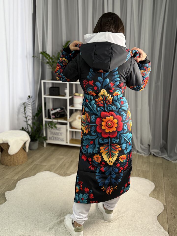 Прямий крій, блискавка двостороння – можна розстібати знизу, зверху планка із кнопками, рукава, на манжетах та відстібаються, капюшон – з’ємний, є бокові розрізи, на блискавках, можна розстібати для зручності при хотьбі, є кишені, пояс у комплекті, який підкреслює талію, всі блискавки прорезинені – захищають від дощу та снігу.  Довжина по переду 114 см, по спинці -132 см, довжина рукава 65 см по зовнішньому шву від плечового шву, це єврозима, температурний режим до -10 градусів.