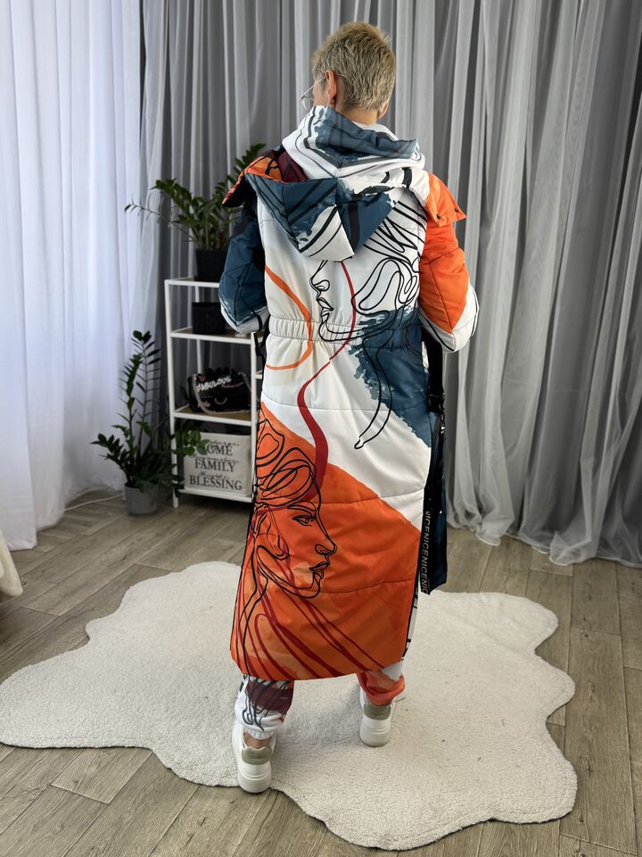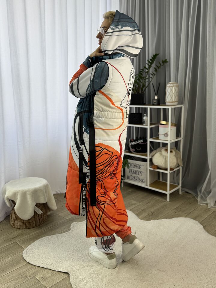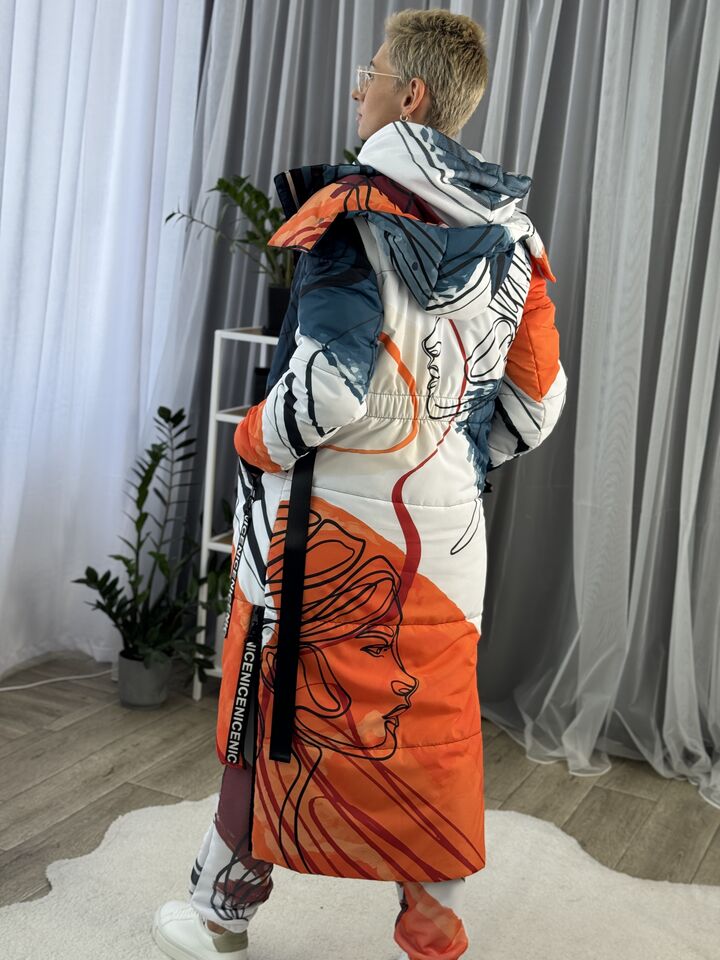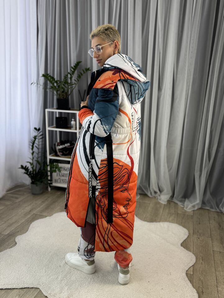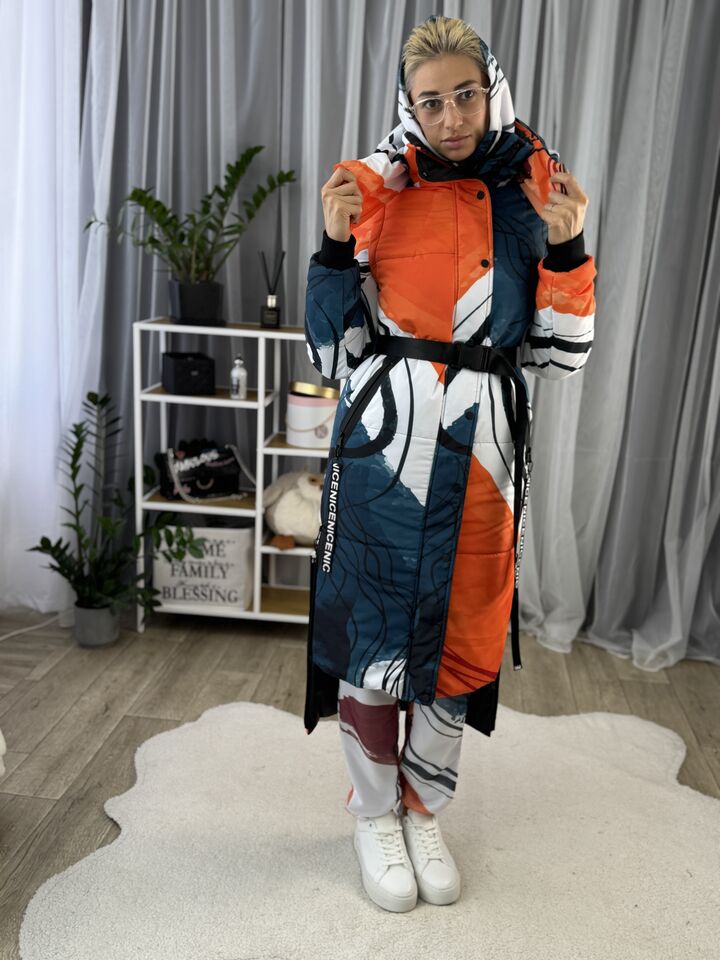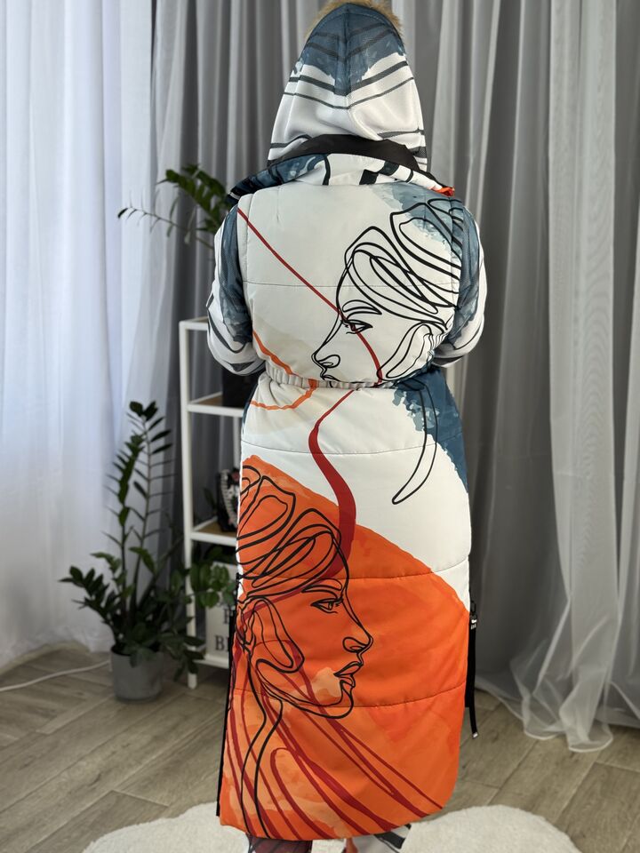 Прямий крій, блискавка двостороння – можна розстібати знизу, зверху планка із кнопками, рукава, на манжетах та відстібаються, капюшон – з’ємний, є бокові розрізи, на блискавках, можна розстібати для зручності при хотьбі, є кишені, пояс у комплекті, який підкреслює талію, всі блискавки прорезинені – захищають від дощу та снігу.  Довжина по переду 114 см, по спинці -132 см, довжина рукава 65 см по зовнішньому шву від плечового шву, це єврозима, температурний режим до -10 градусів.