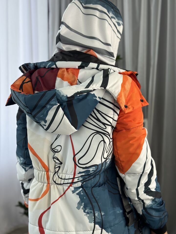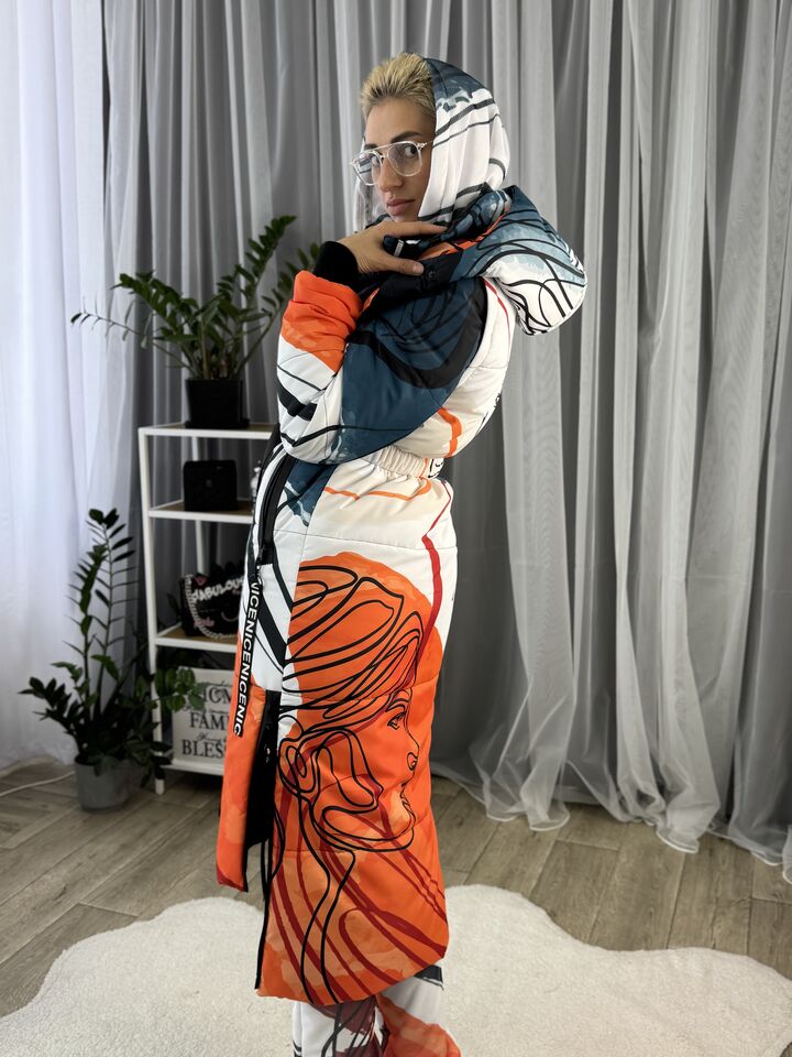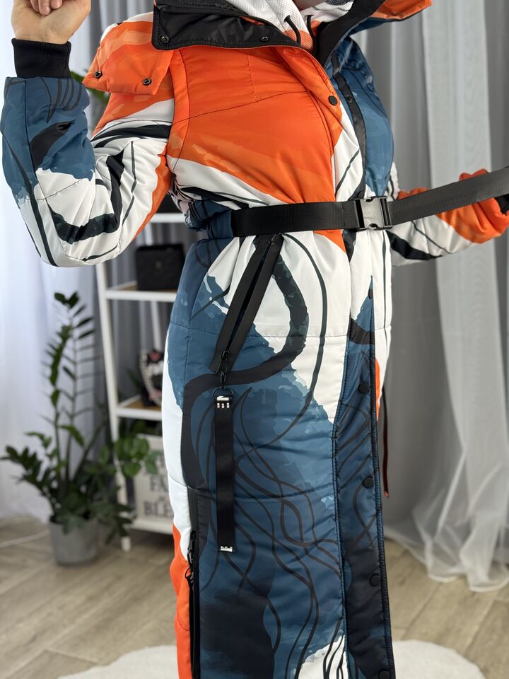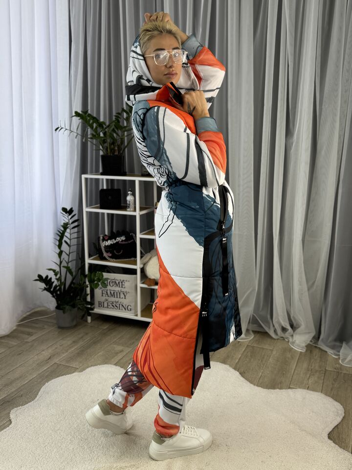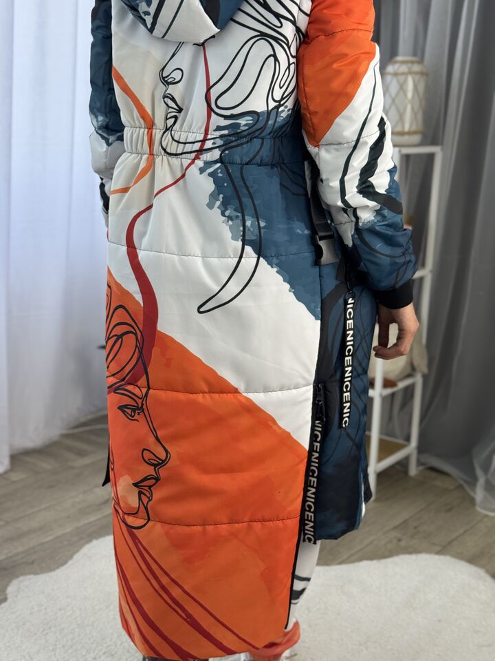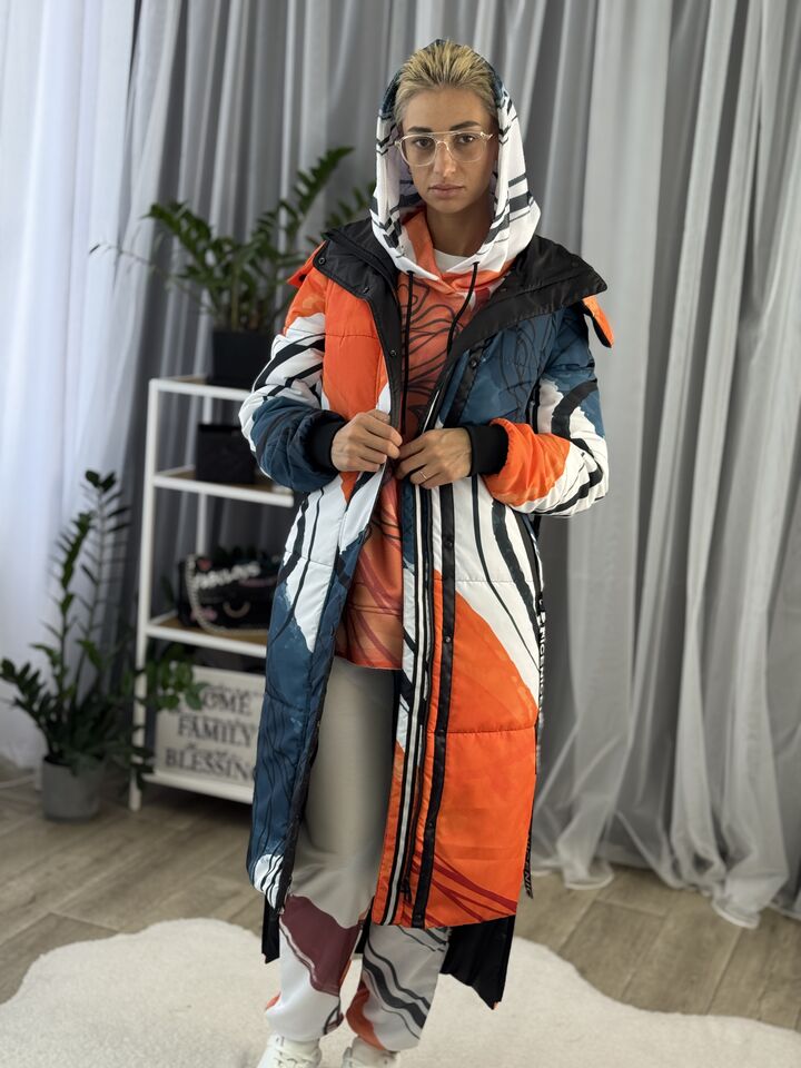 Прямий крій, блискавка двостороння – можна розстібати знизу, зверху планка із кнопками, рукава, на манжетах та відстібаються, капюшон – з’ємний, є бокові розрізи, на блискавках, можна розстібати для зручності при хотьбі, є кишені, пояс у комплекті, який підкреслює талію, всі блискавки прорезинені – захищають від дощу та снігу.  Довжина по переду 114 см, по спинці -132 см, довжина рукава 65 см по зовнішньому шву від плечового шву, це єврозима, температурний режим до -10 градусів.