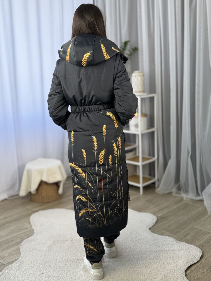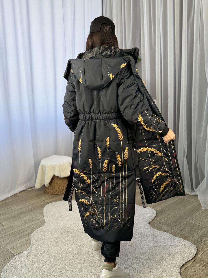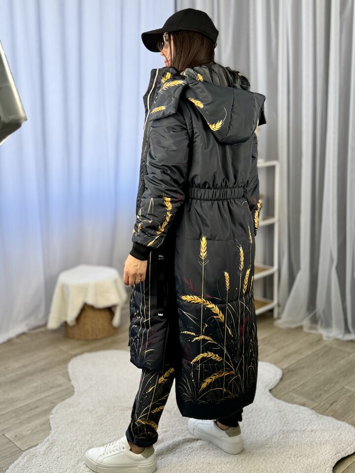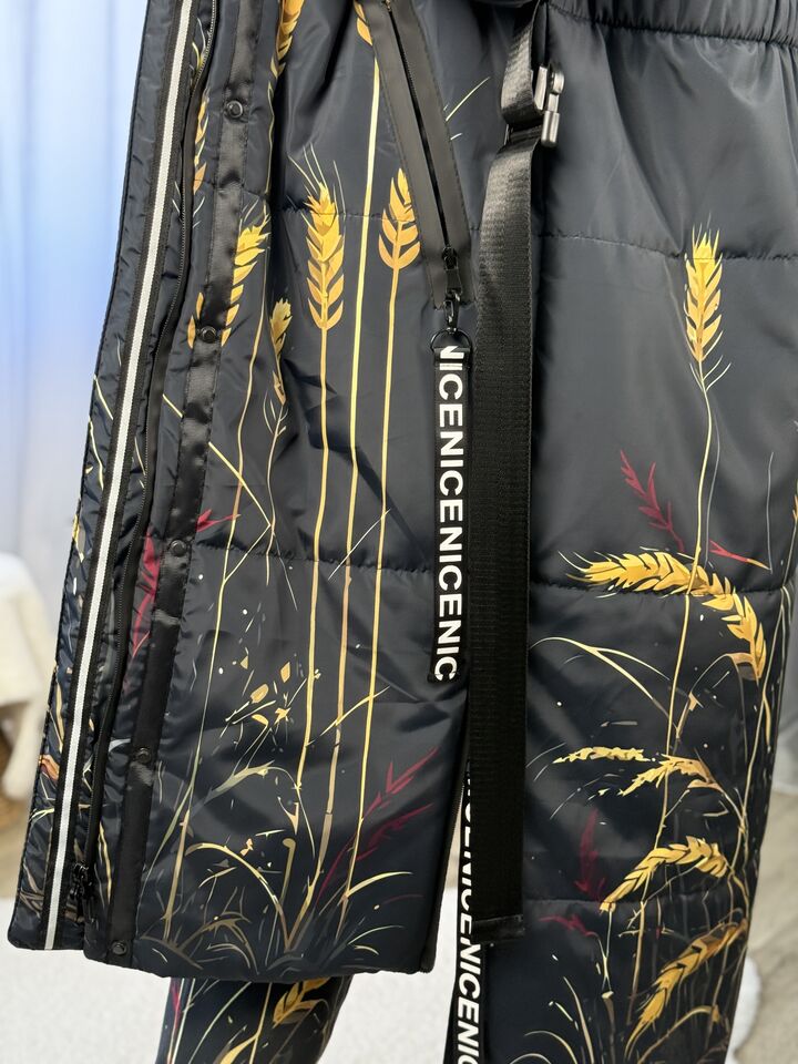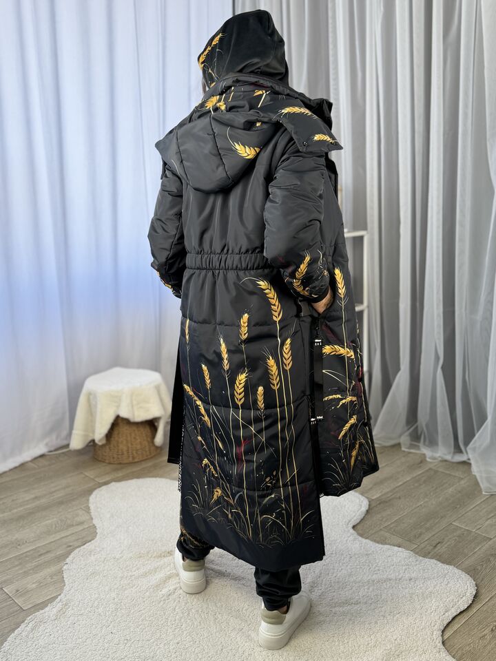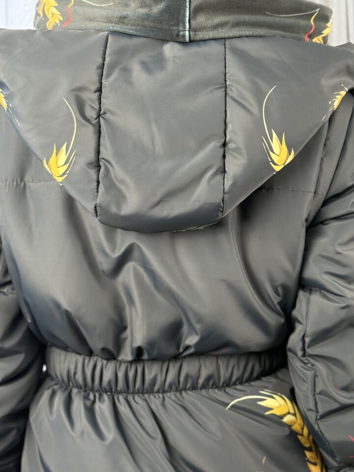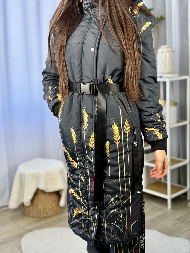 Прямий крій, блискавка двостороння – можна розстібати знизу, зверху планка із кнопками, рукава, на манжетах та відстібаються, капюшон – з’ємний, є бокові розрізи, на блискавках, можна розстібати для зручності при хотьбі, є кишені, пояс у комплекті, який підкреслює талію, всі блискавки прорезинені – захищають від дощу та снігу. Довжина по переду 114 см, по спинці -132 см, довжина рукава 65 см по зовнішньому шву від плечового шву, це єврозима, температурний режим до -10 градусів.