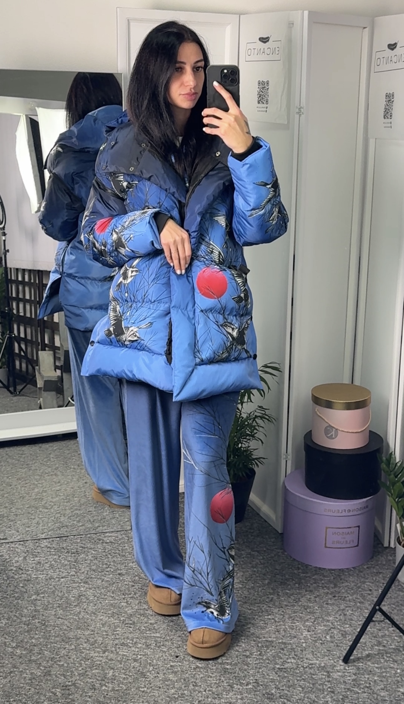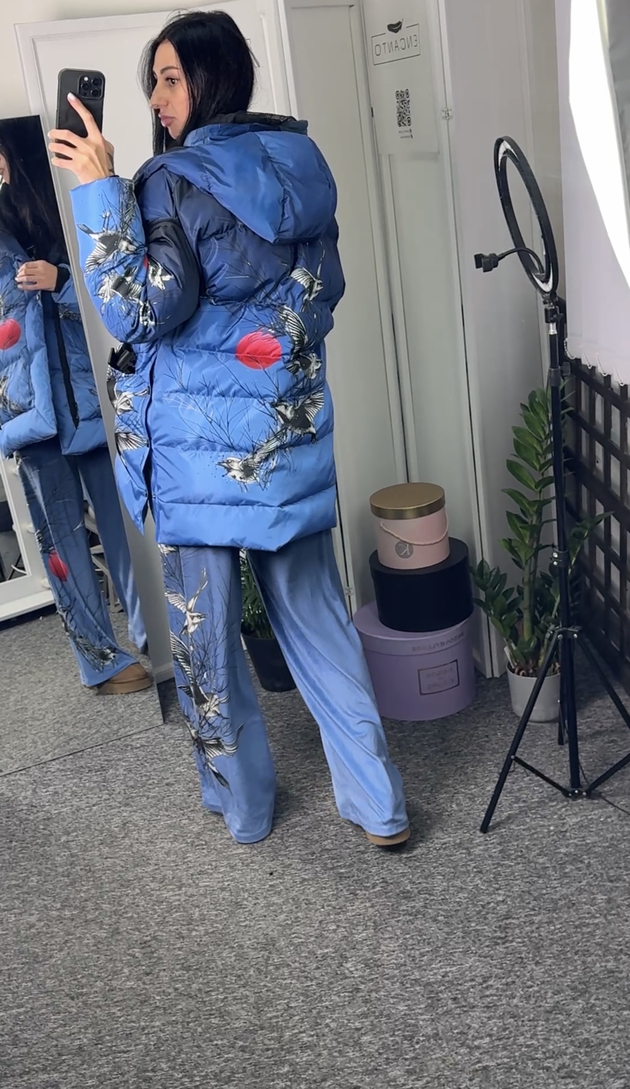 Прямий крій, застібується на блискавці, поверх блискавки планка з кнопками, рукава відстібуються на блискавці, є приховані манжети, капюшон вшитий, з обох боків є розрізи – на кнопках, кишені з обох боків, пасок у комплекті.