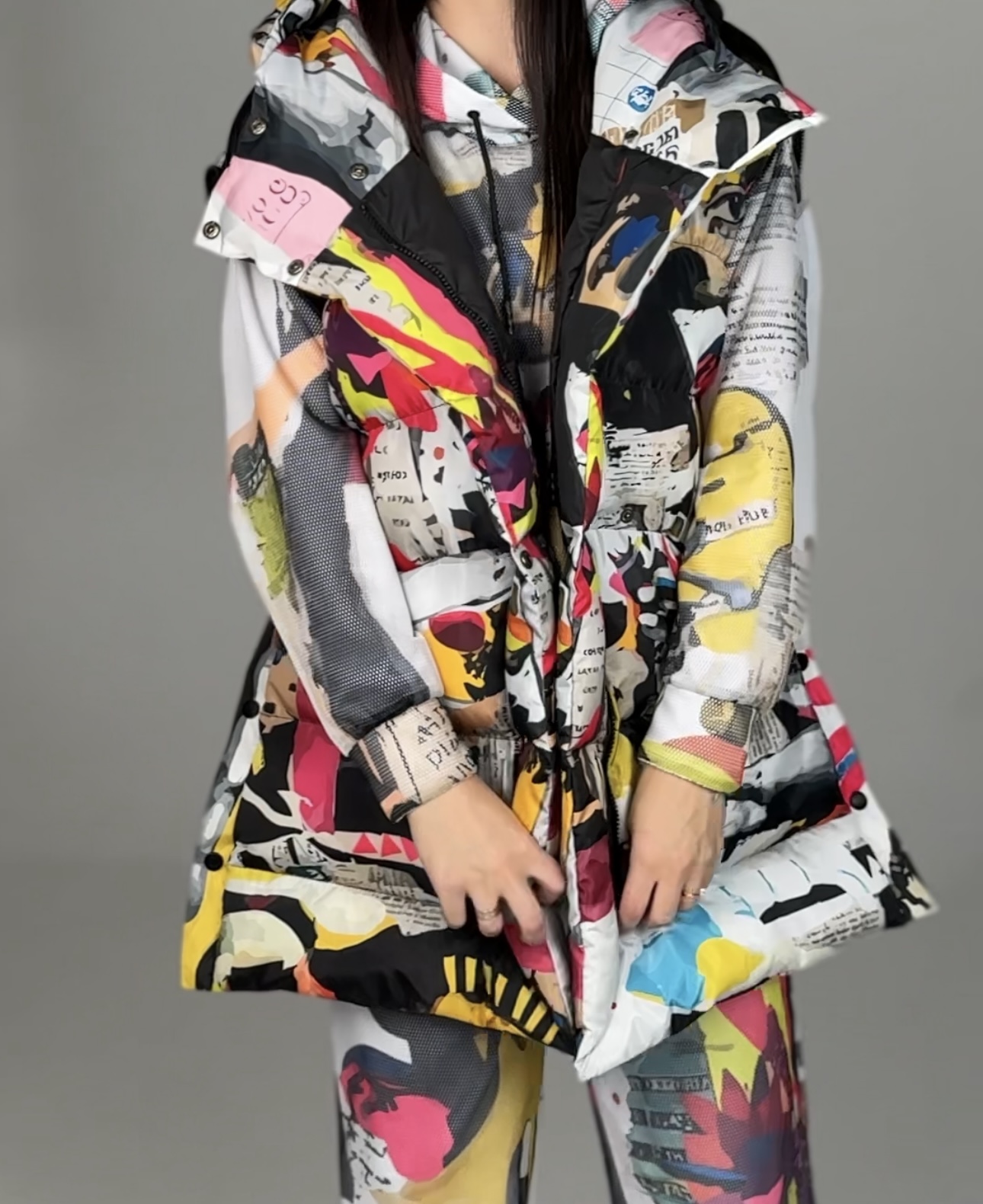 Прямий крій, застібується на блискавці, поверх блискавки планка з кнопками, рукава відстібуються на блискавці, є приховані манжети, капюшон вшитий, з обох боків є розрізи – на кнопках, кишені з обох боків, пасок у комплекті.