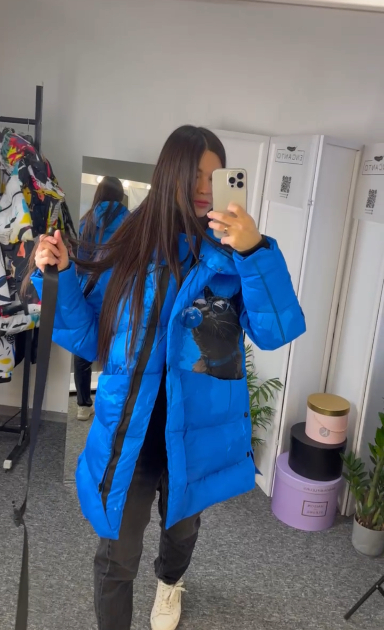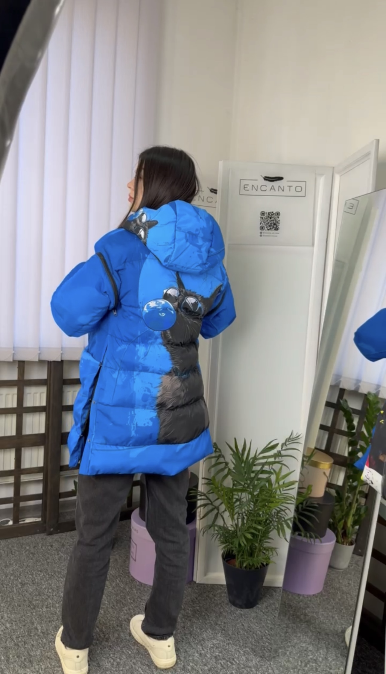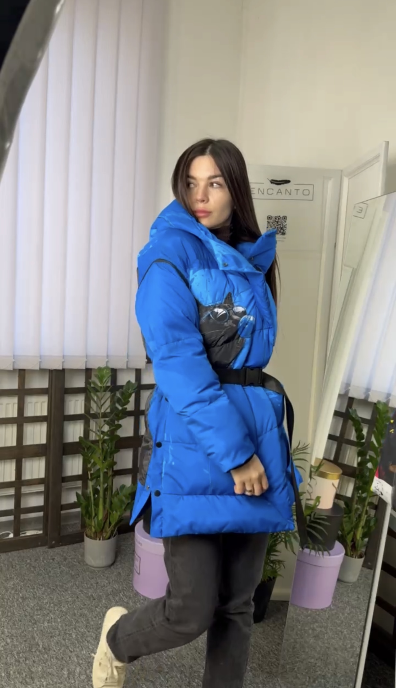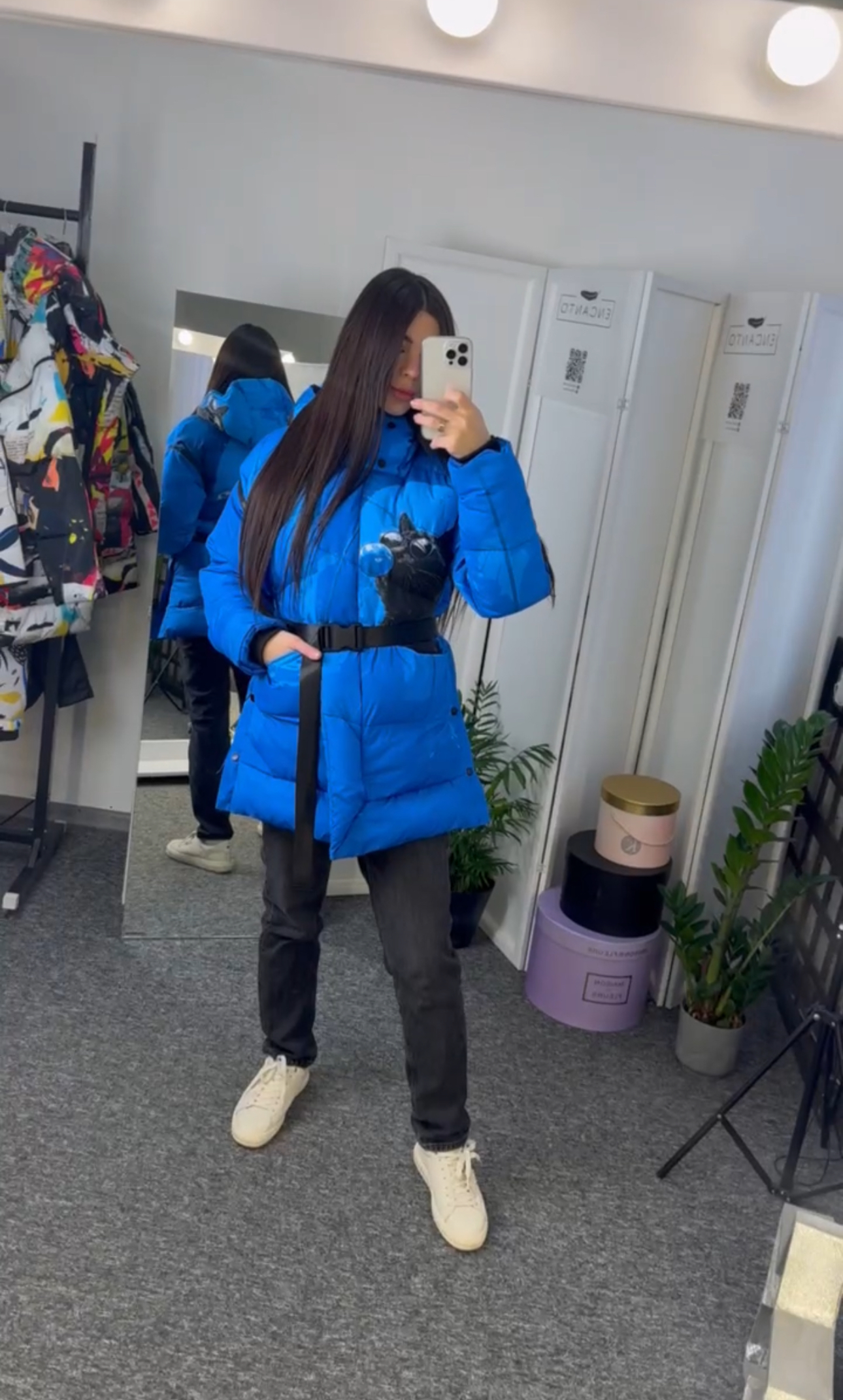 Прямий крій, застібується на блискавці, поверх блискавки планка з кнопками, рукава відстібуються на блискавці, є приховані манжети, капюшон вшитий, з обох боків є розрізи – на кнопках, кишені з обох боків, пасок у комплекті.
