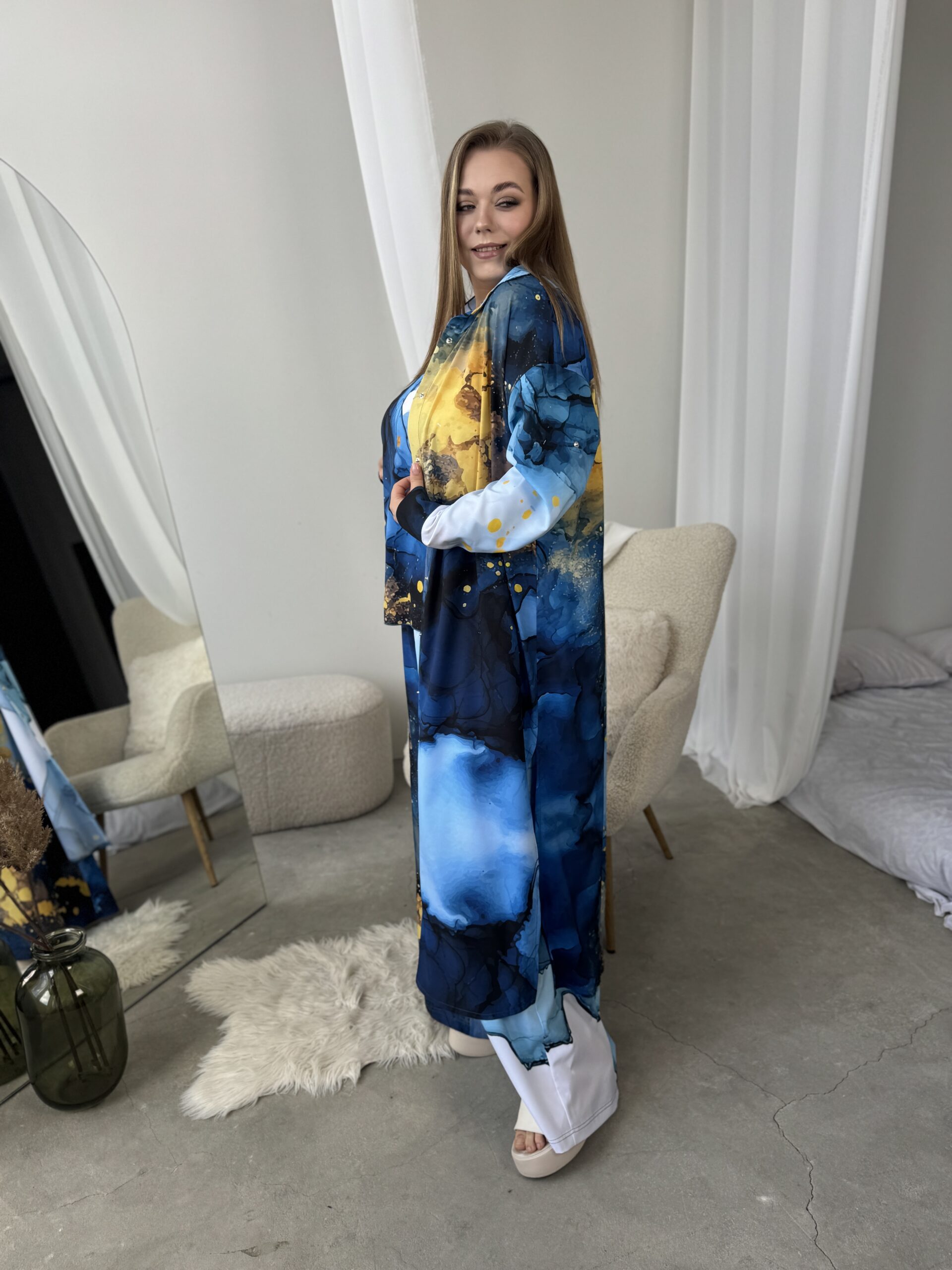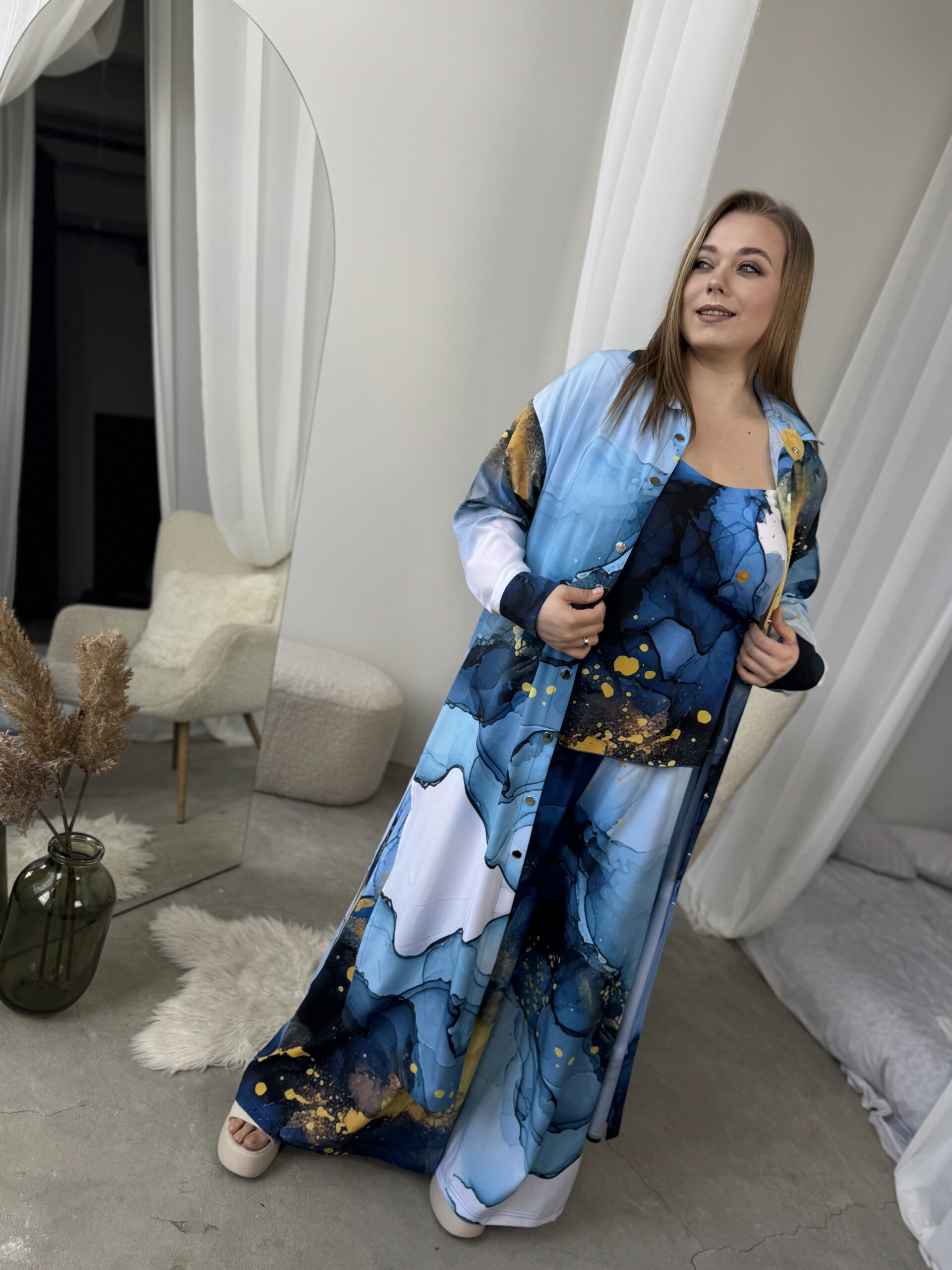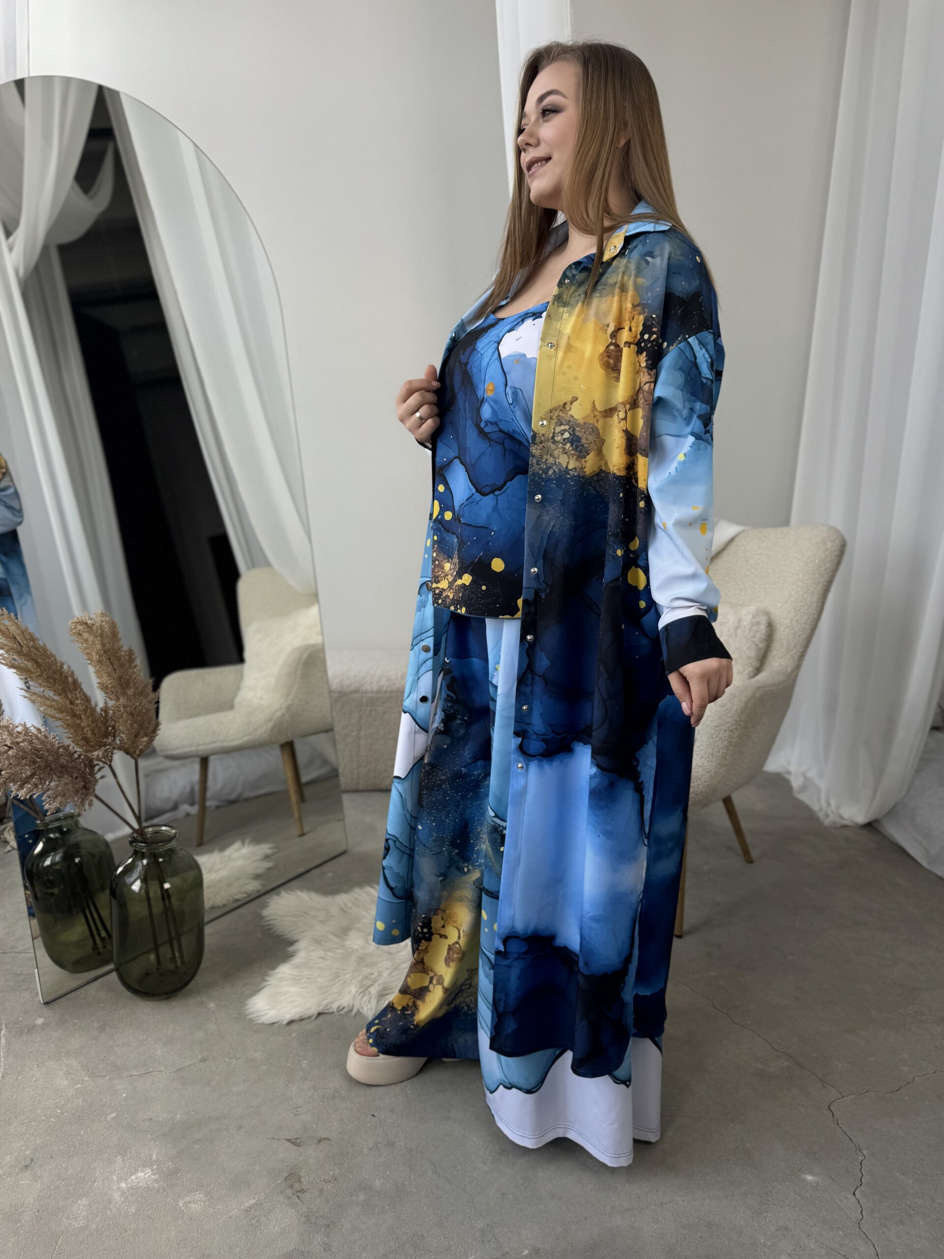 Унікальний жіночий комплект, що складається з брюк, майки на регульованих бретелях і довгої сорочки. Це не просто одяг — це три варіанти стильних образів в одному комплекті: