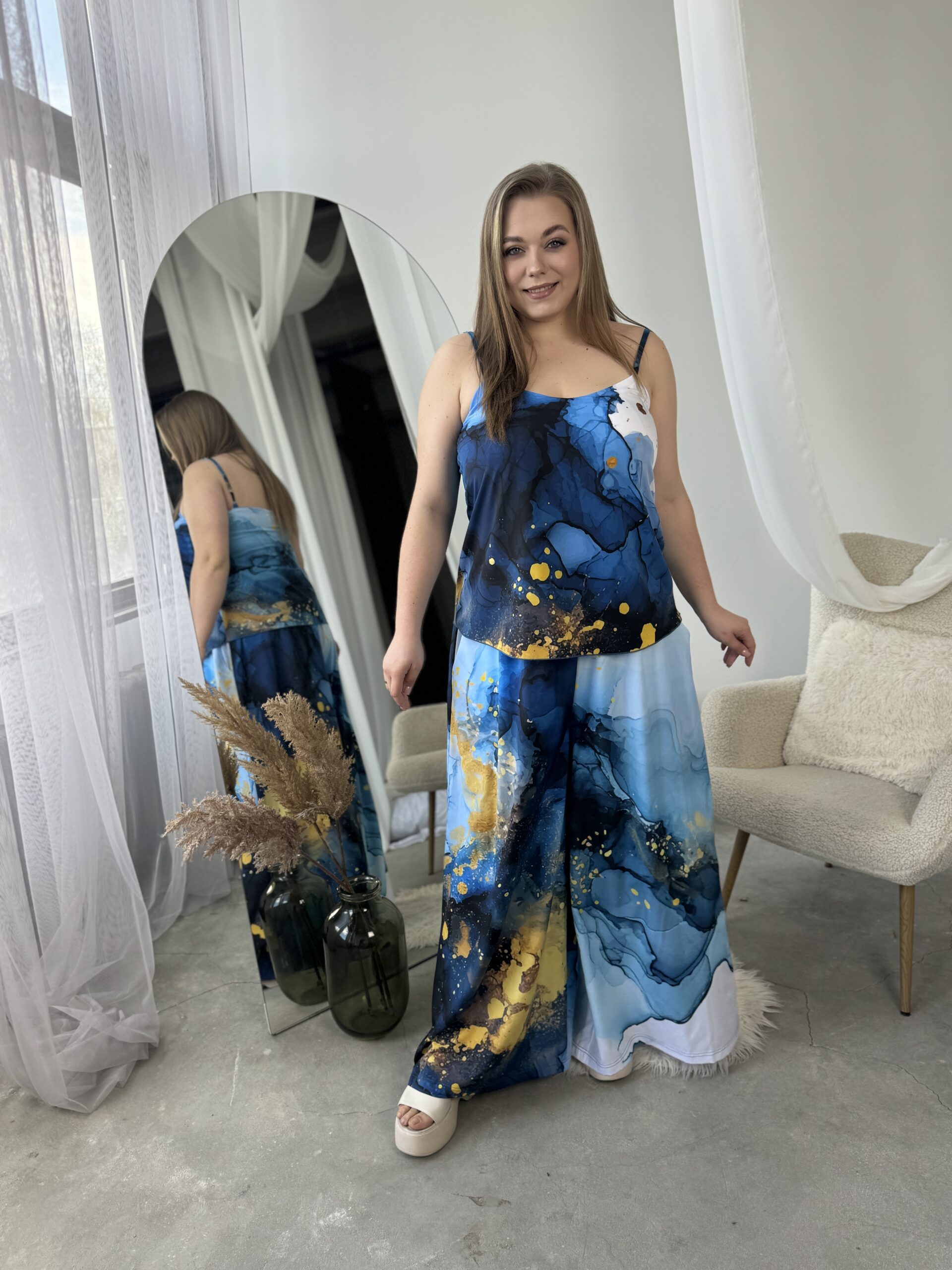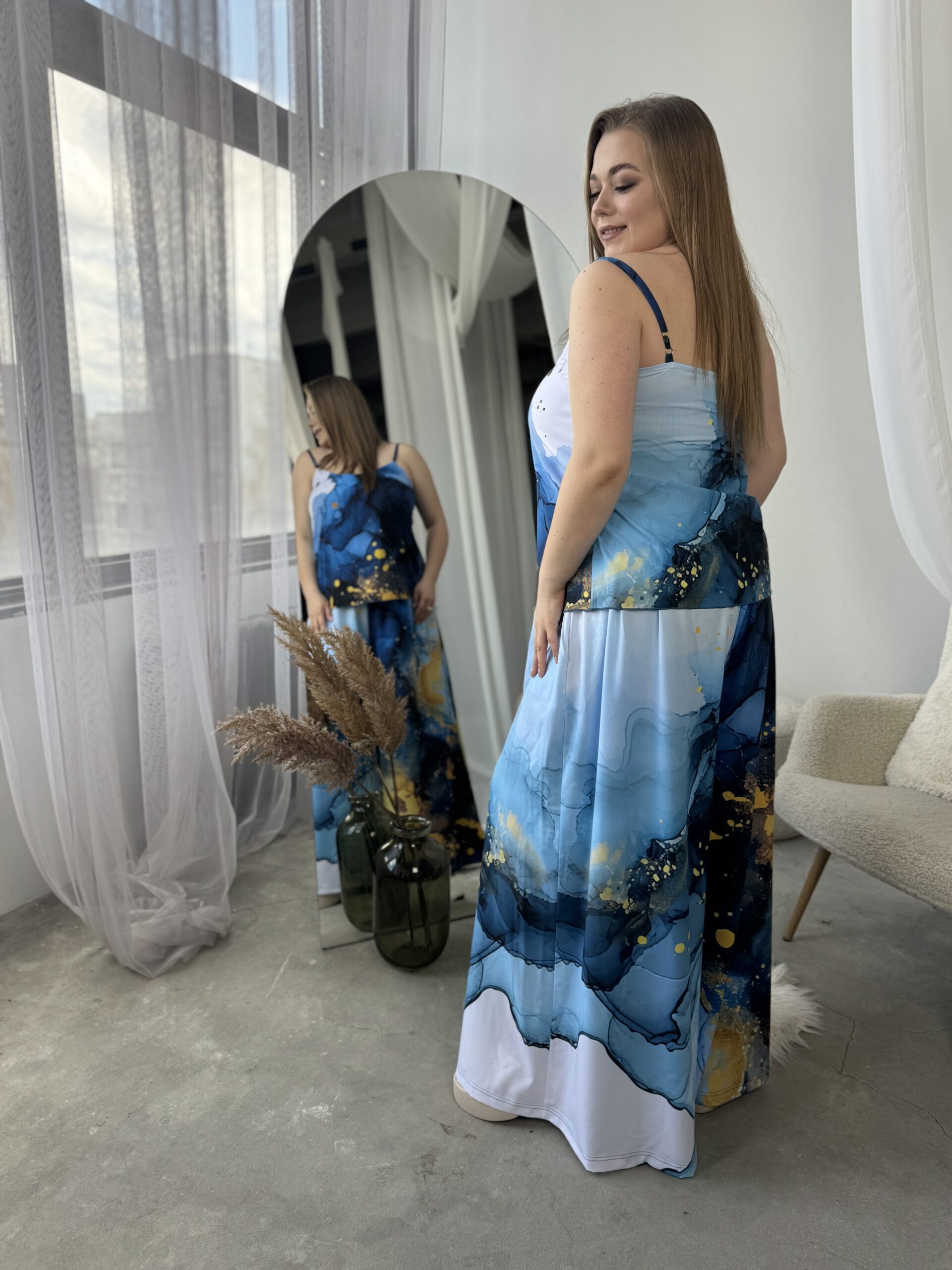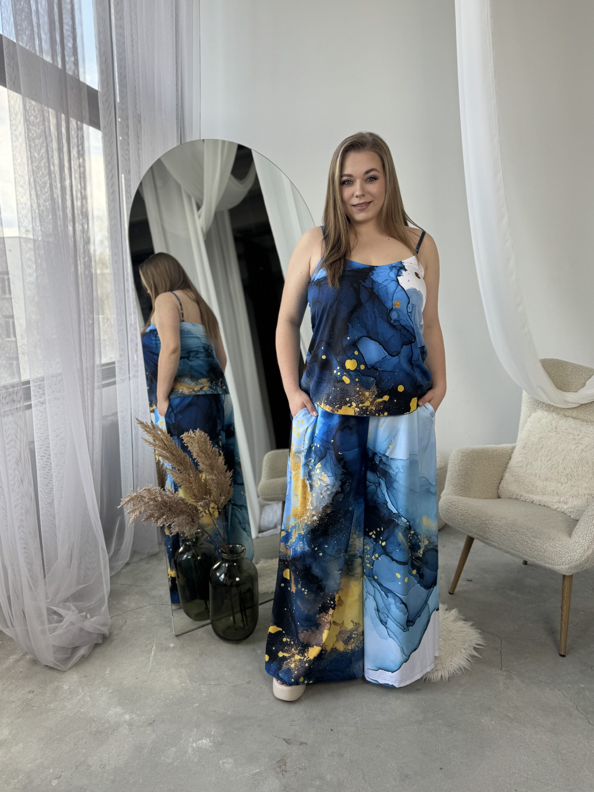 Унікальний жіночий комплект, що складається з брюк, майки на регульованих бретелях і довгої сорочки. Це не просто одяг — це три варіанти стильних образів в одному комплекті: