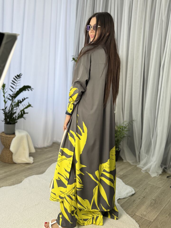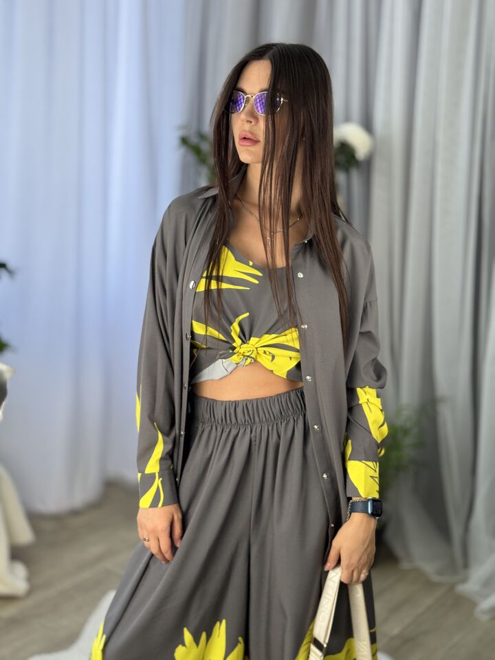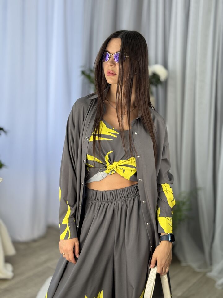 Унікальний жіночий комплект, що складається з брюк, майки на регульованих бретелях і довгої сорочки. Це не просто одяг — це три варіанти стильних образів в одному комплекті: