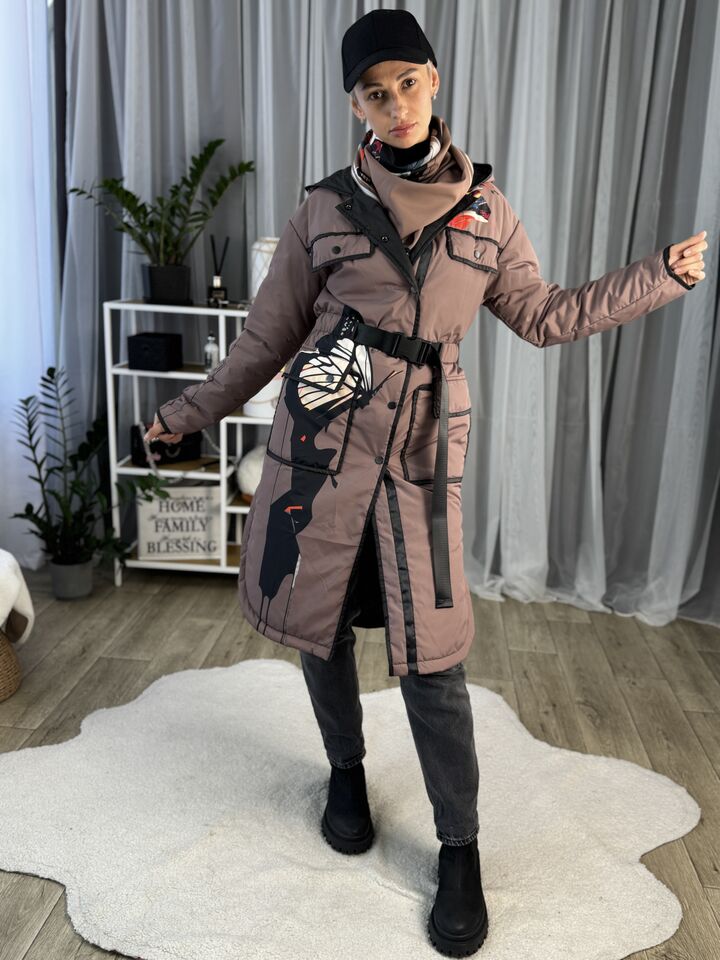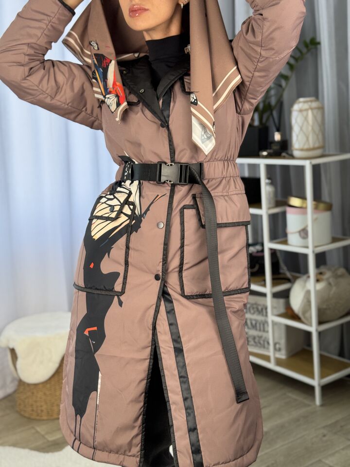 Прямий крій, застібка: на кнопках, пояс у комплекті — підкреслює талію або створює більш вільний образ, капюшон: вшитий, захищає від вітру, кишені: накладені, зручні для щоденного використання, бічні розрізи — забезпечують комфорт і свободу рухів, спущене плече — додає легкості силуету, довжина виробу: 114–118 см (залежно від розміру), довжина рукава: 65 см — можна підкочувати, температурний режим: від +15°C до +5°C — ідеальний на весну чи осінь