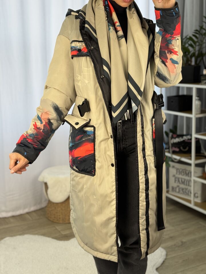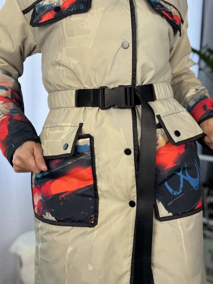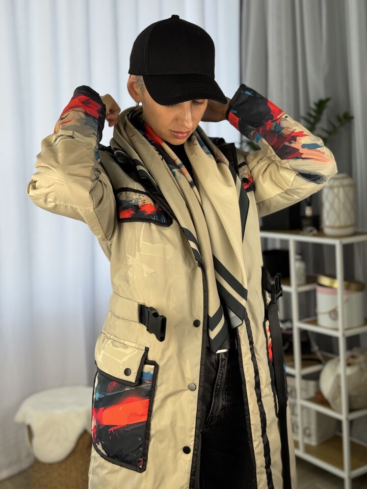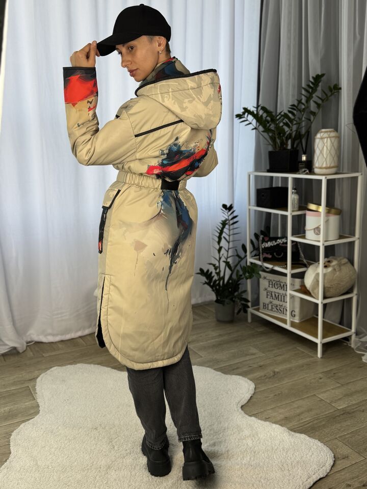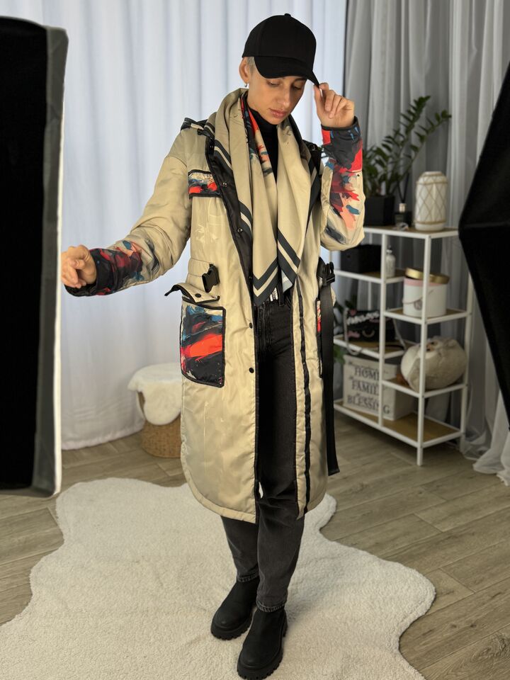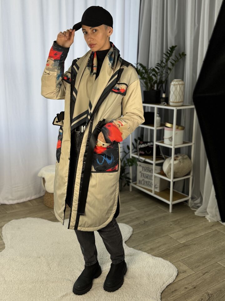 Прямий крій, застібка: на кнопках, пояс у комплекті — підкреслює талію або створює більш вільний образ, капюшон: вшитий, захищає від вітру, кишені: накладені, зручні для щоденного використання, бічні розрізи — забезпечують комфорт і свободу рухів, спущене плече — додає легкості силуету, довжина виробу: 114–118 см (залежно від розміру), довжина рукава: 65 см — можна підкочувати, температурний режим: від +15°C до +5°C — ідеальний на весну чи осінь