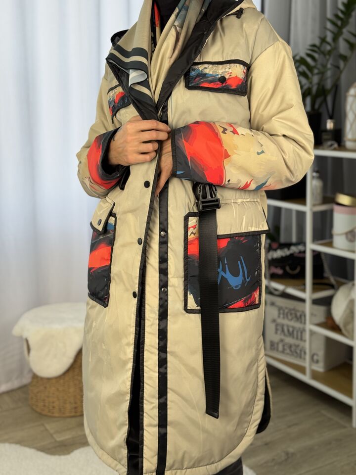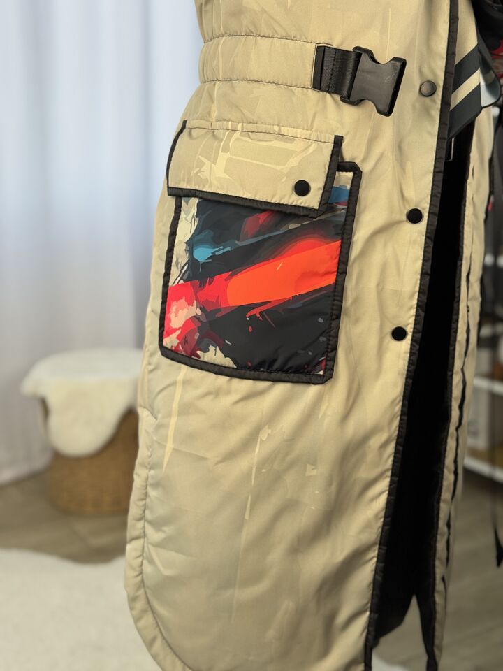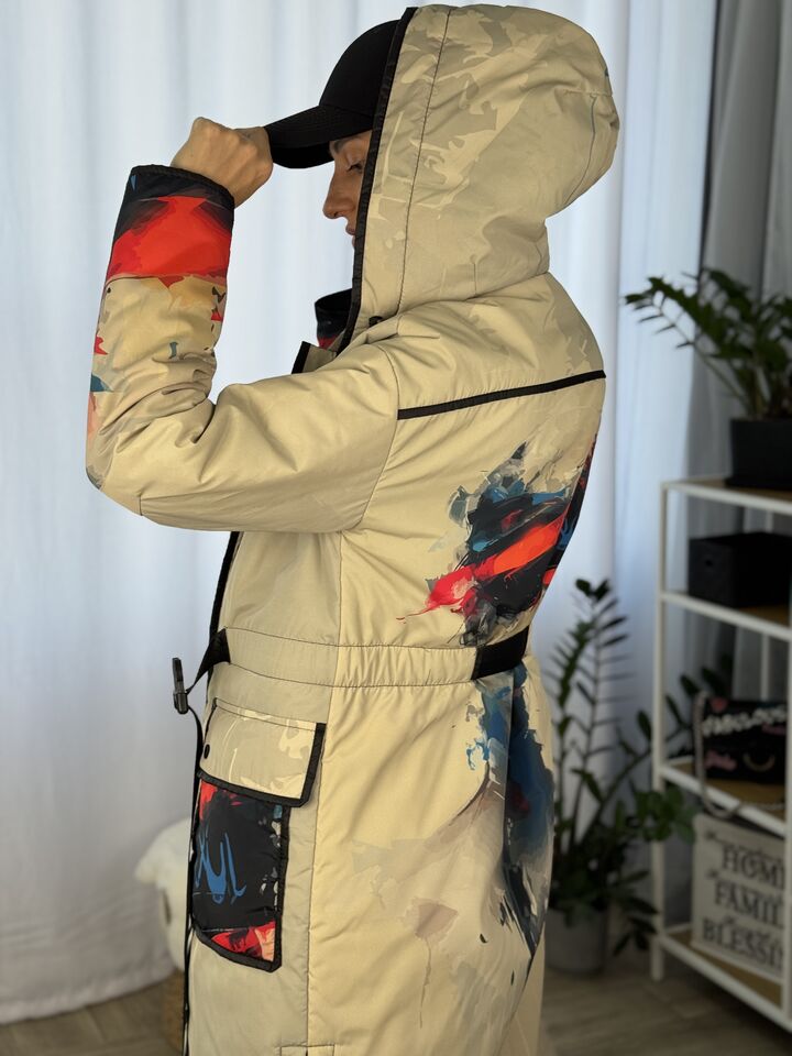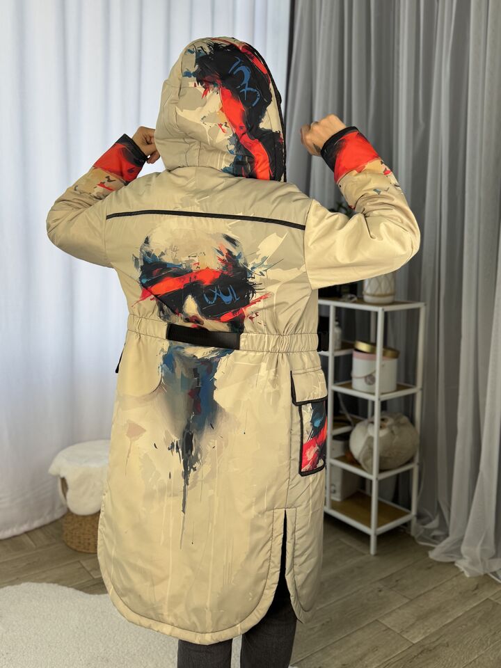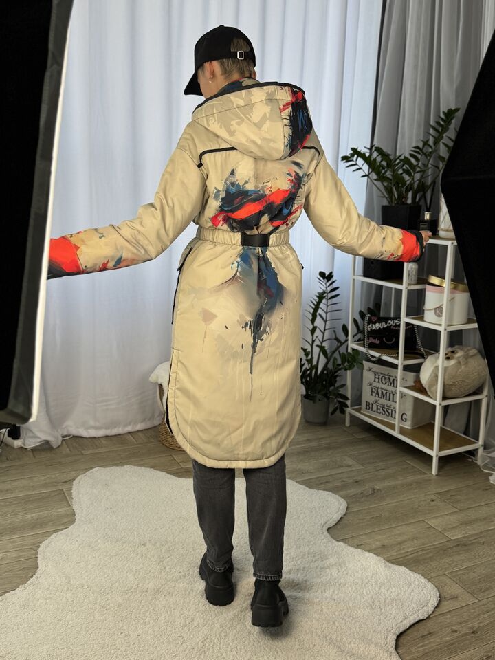 • Матеріал: плащівка • Сезон: весна/осінь (комфорт до +5°C) • Утеплювач: слімтекс 100 г/м² • Капюшон: вшитий • Рукава: спущенний плечовий шов • Довжина: 114 см • Догляд: прання 30°