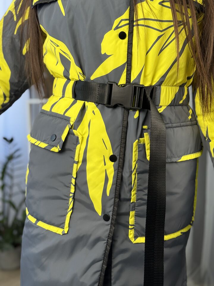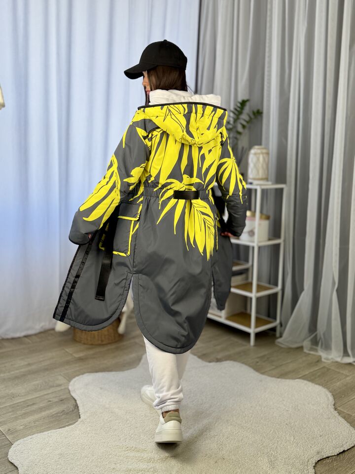 Прямий крій, застібка: на кнопках, пояс у комплекті — підкреслює талію або створює більш вільний образ, капюшон: вшитий, захищає від вітру, кишені: накладені, зручні для щоденного використання, бічні розрізи — забезпечують комфорт і свободу рухів, спущене плече — додає легкості силуету, довжина виробу: 114–118 см (залежно від розміру), довжина рукава: 65 см — можна підкочувати, температурний режим: від +15°C до +5°C — ідеальний на весну чи осінь