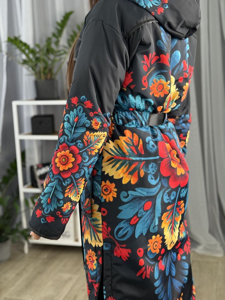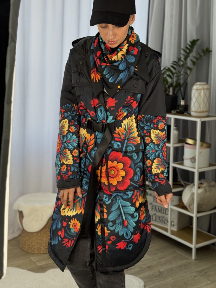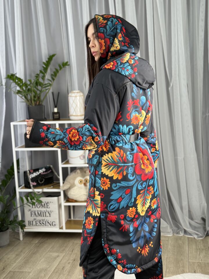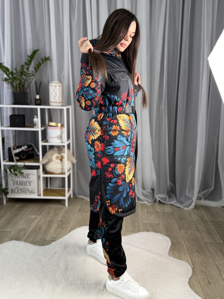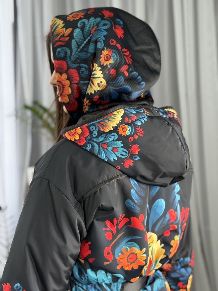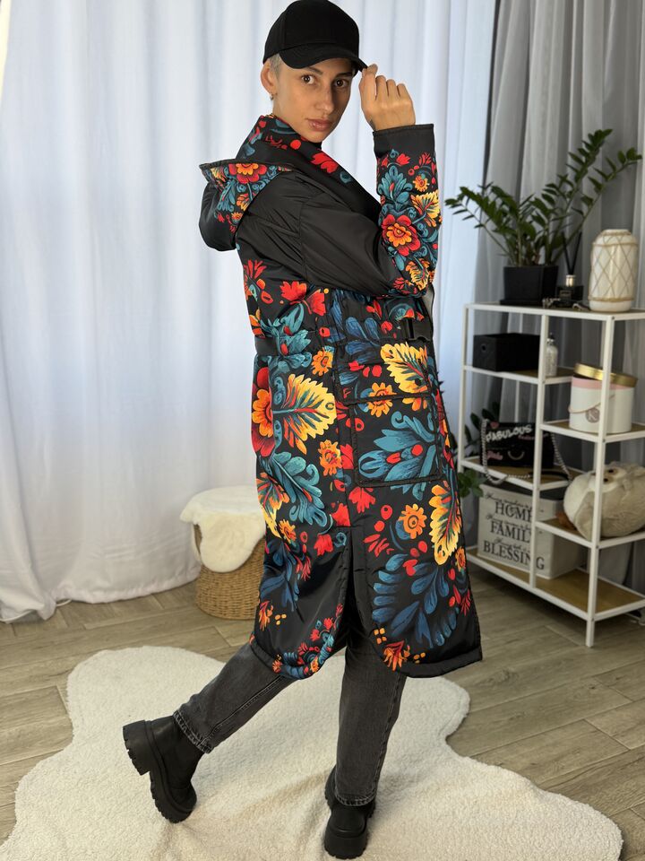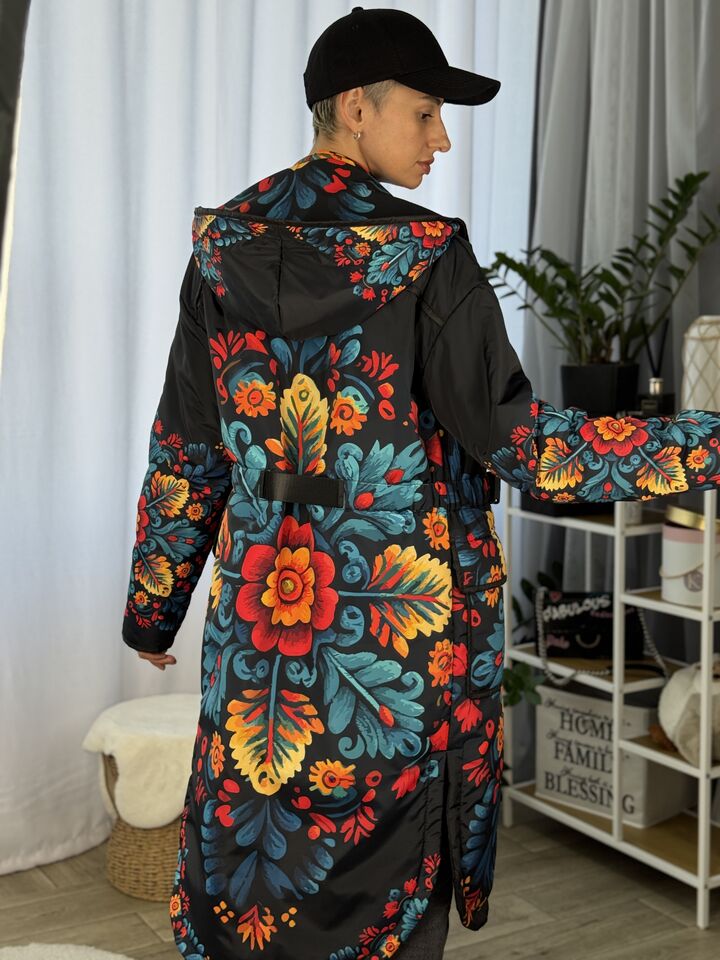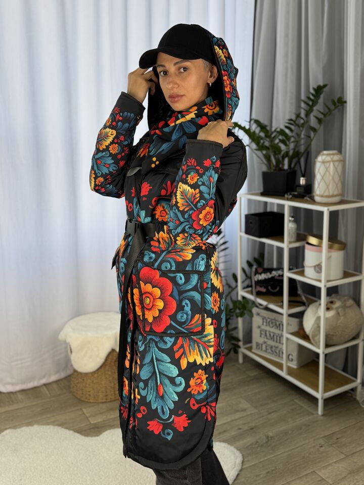 Жіночий плащ осінь/весна, чорний з пертиківським розписом
