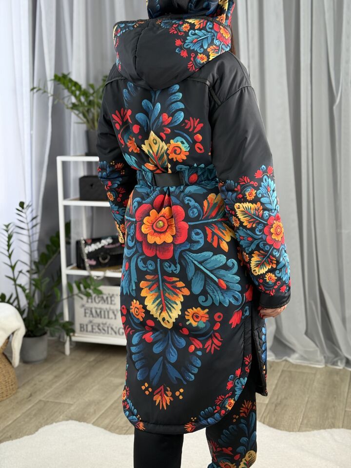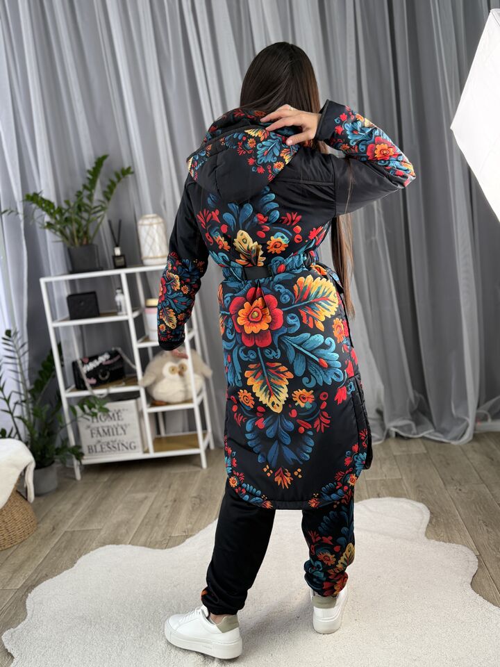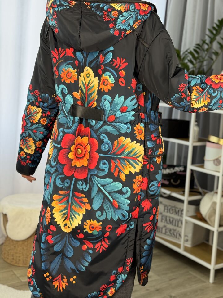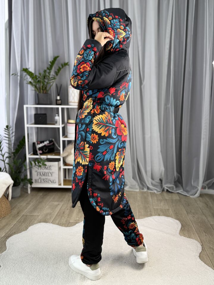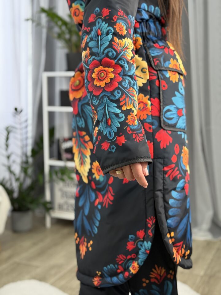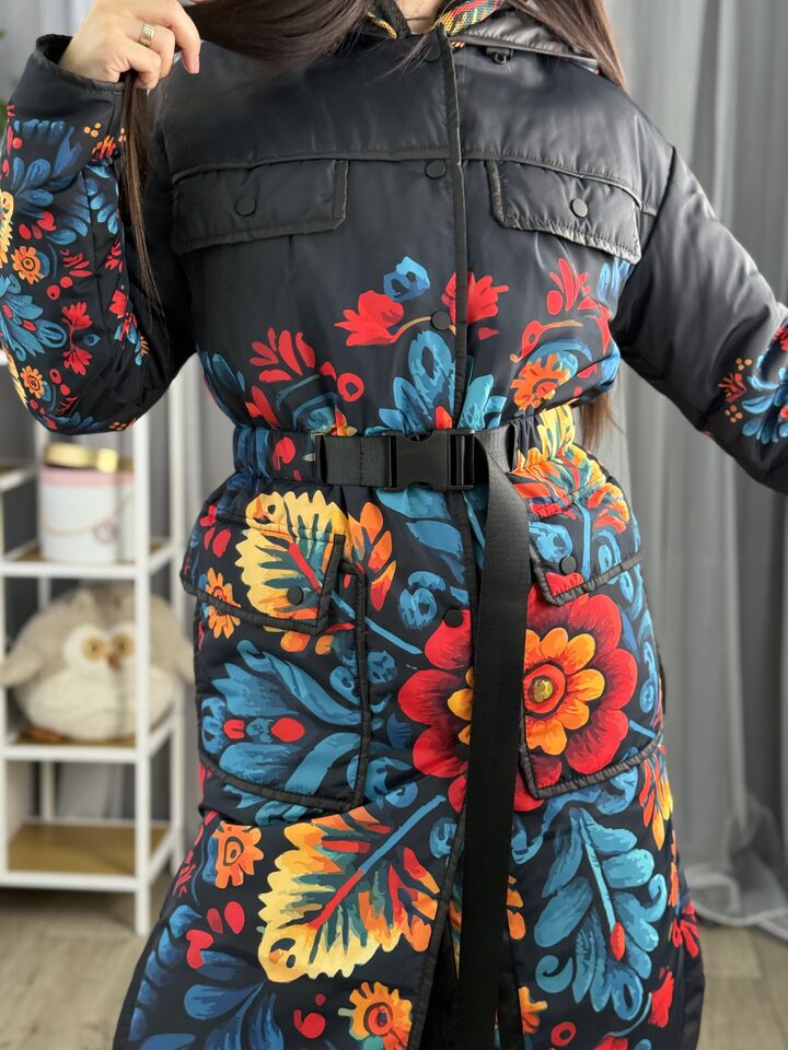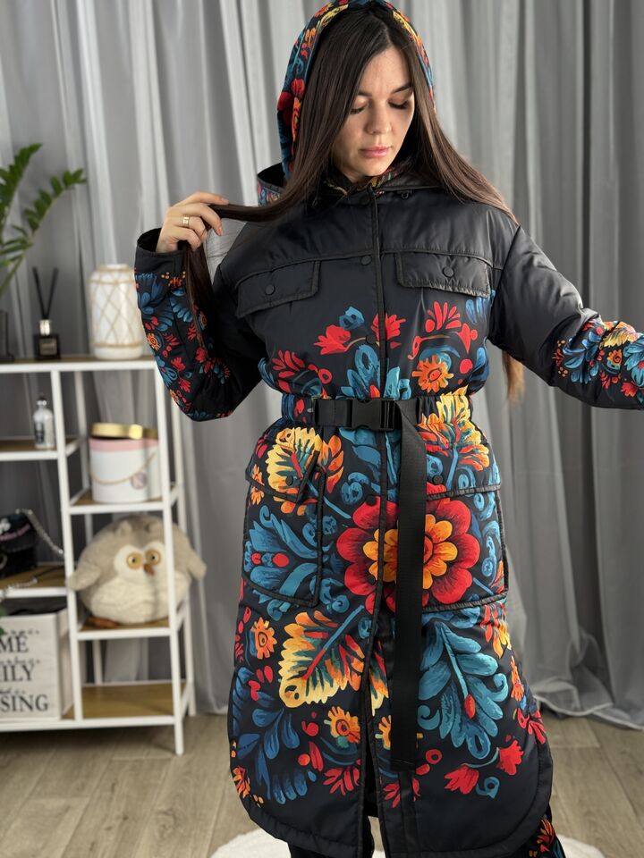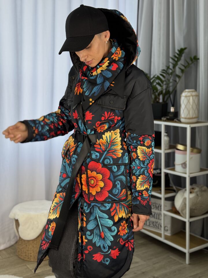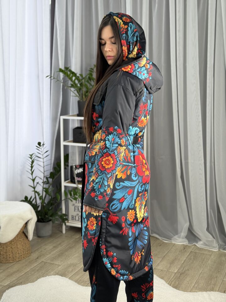 Жіночий плащ осінь/весна, чорний з пертиківським розписом