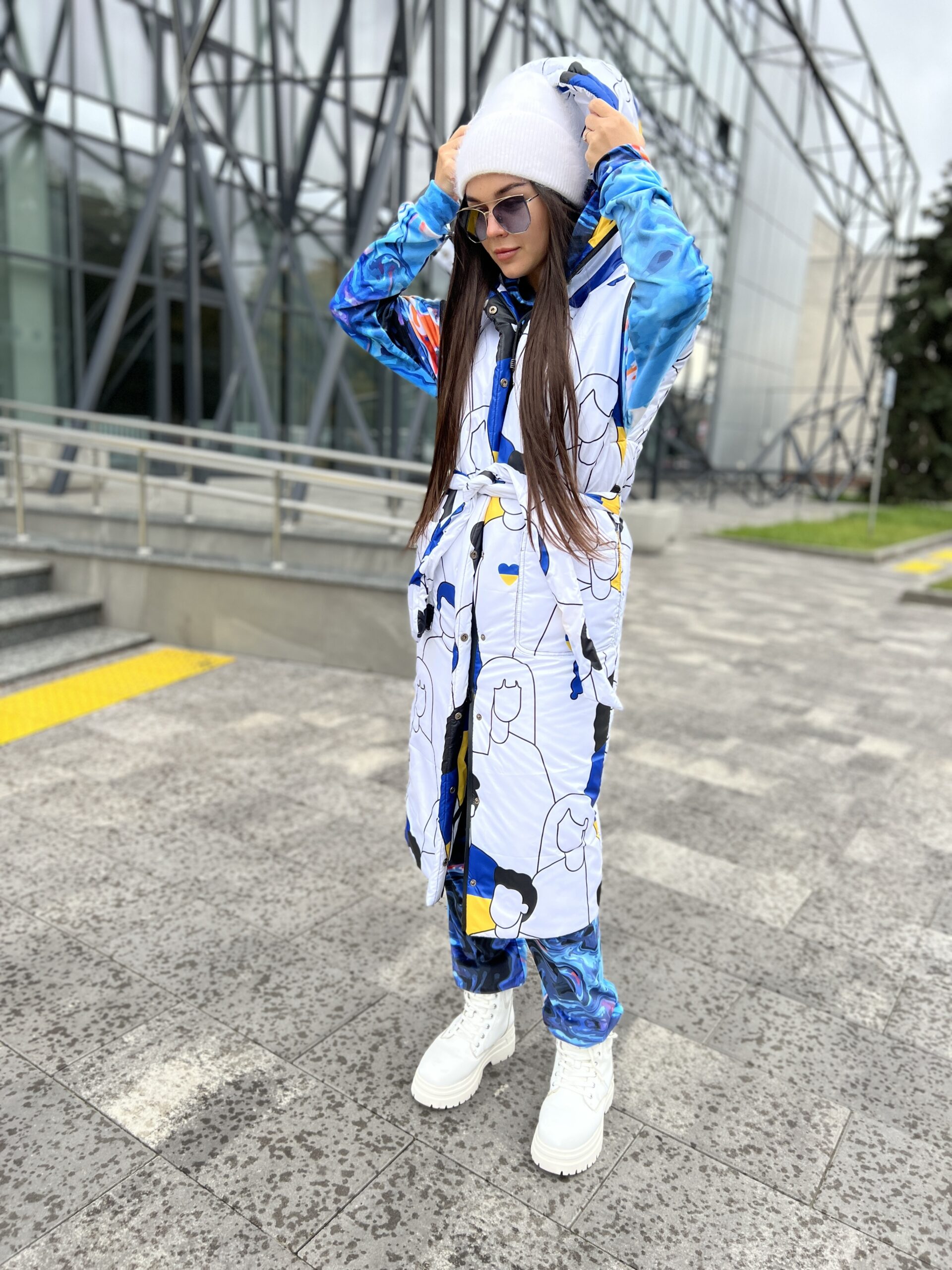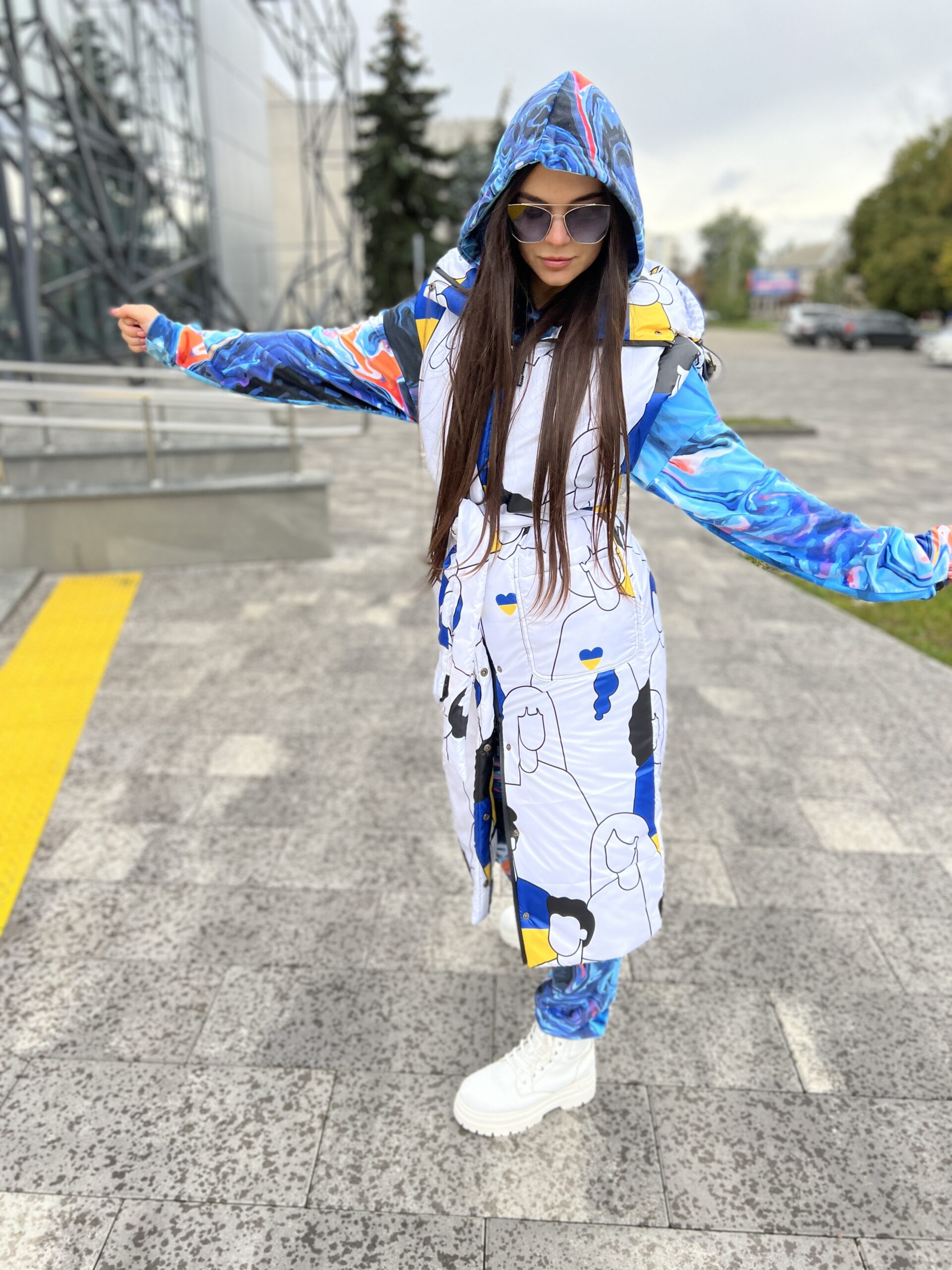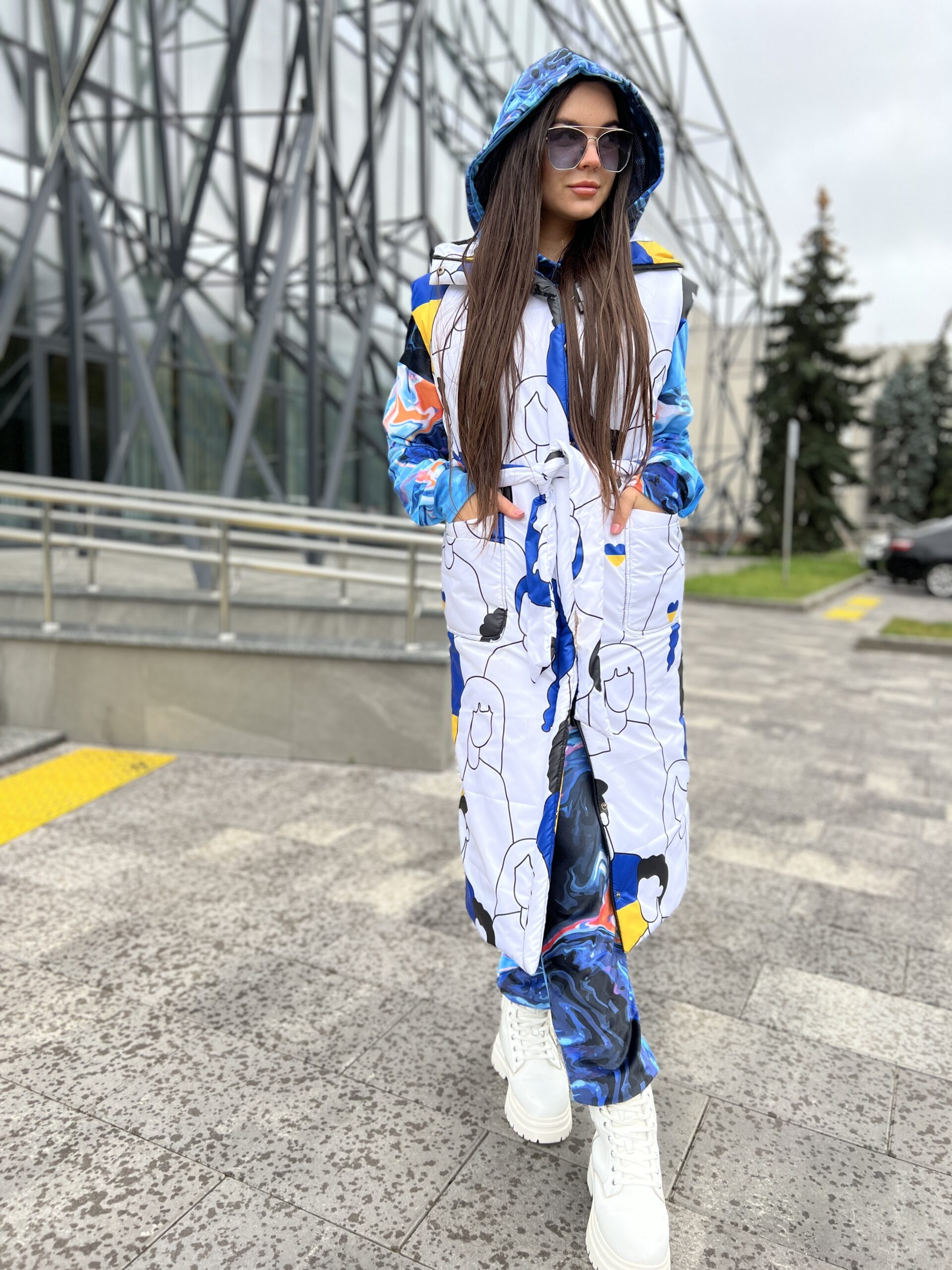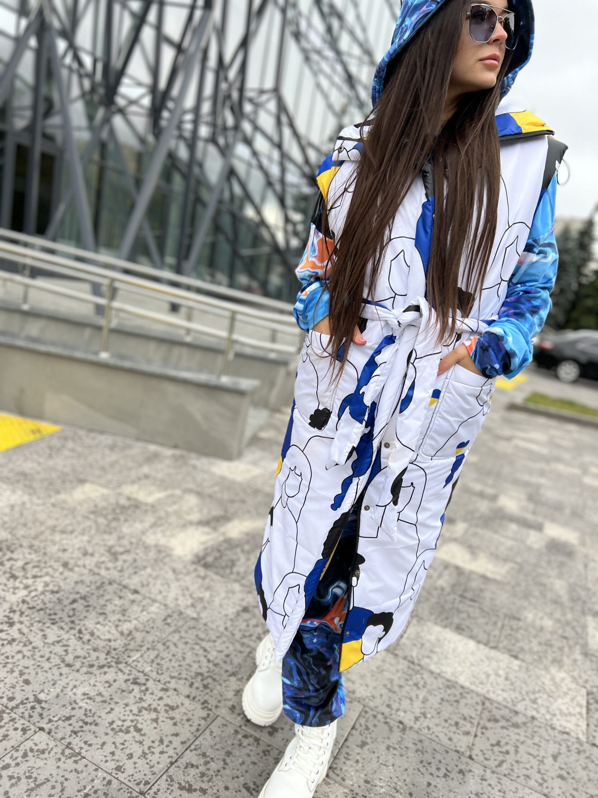 Приталений крій, застібується на блискавці та кнопках, блискавка подвійна – можна розстібнути знизу, накладні кишені, капюшон вшитий, пасок у комплекті.