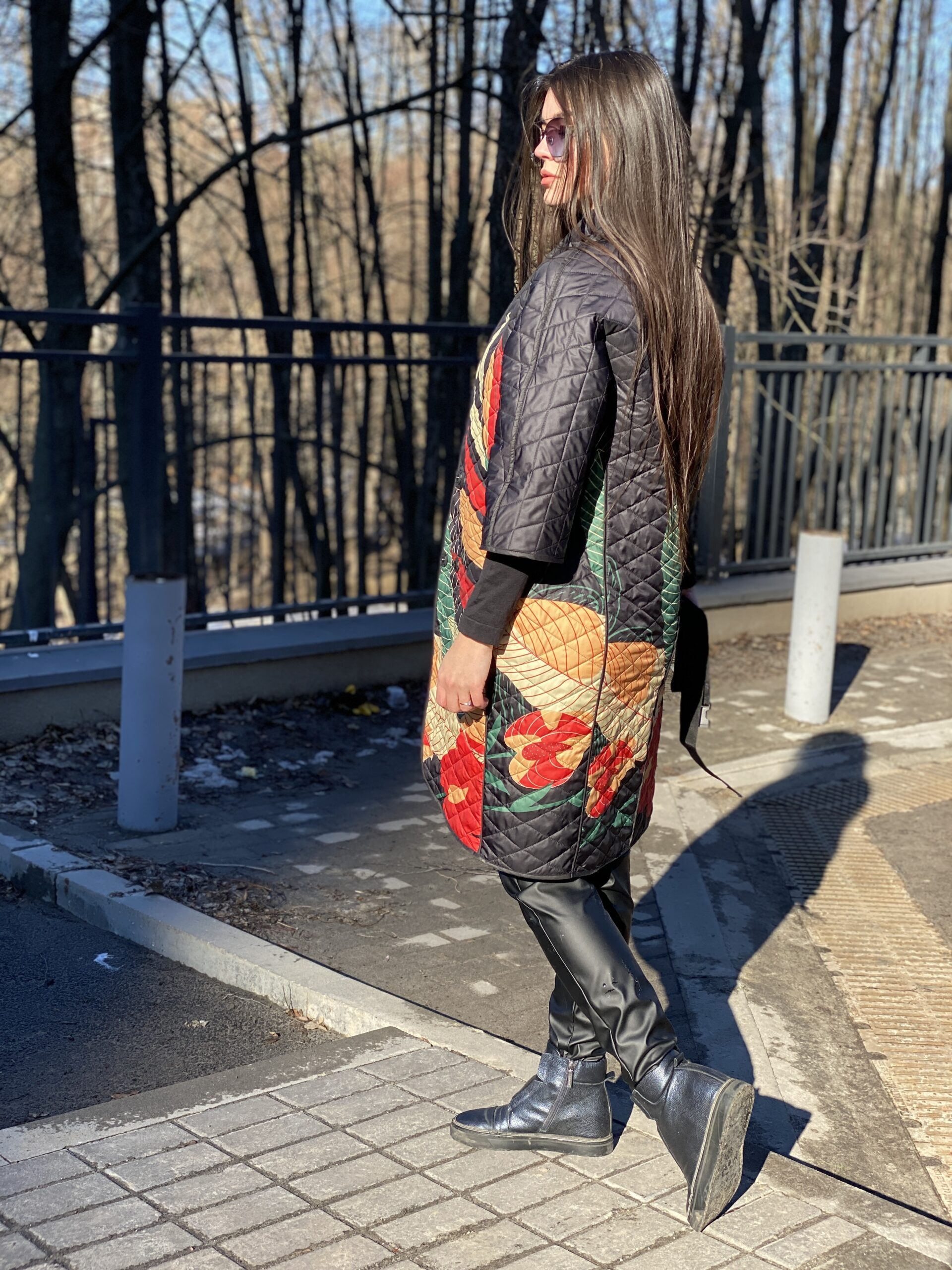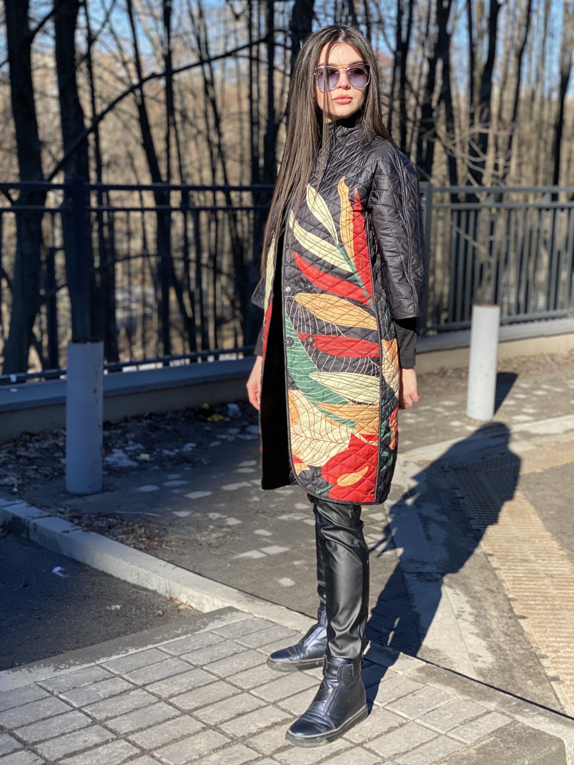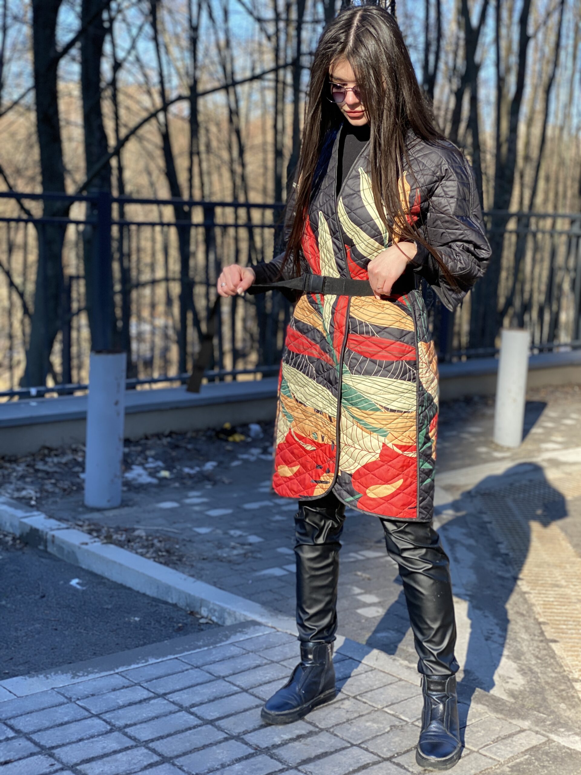 Вільний крій, рукав 3/4, з однієї сторони – яскравий цікавий принт, з іншої – у чорному кольорі, застібується з обох сторін на кнопках, чорний пасок у комплекті, кишені з обох сторін.