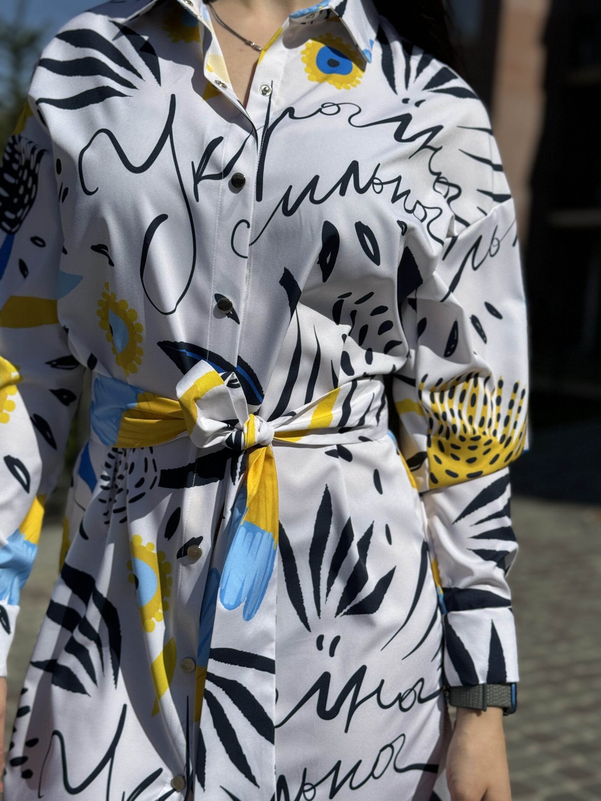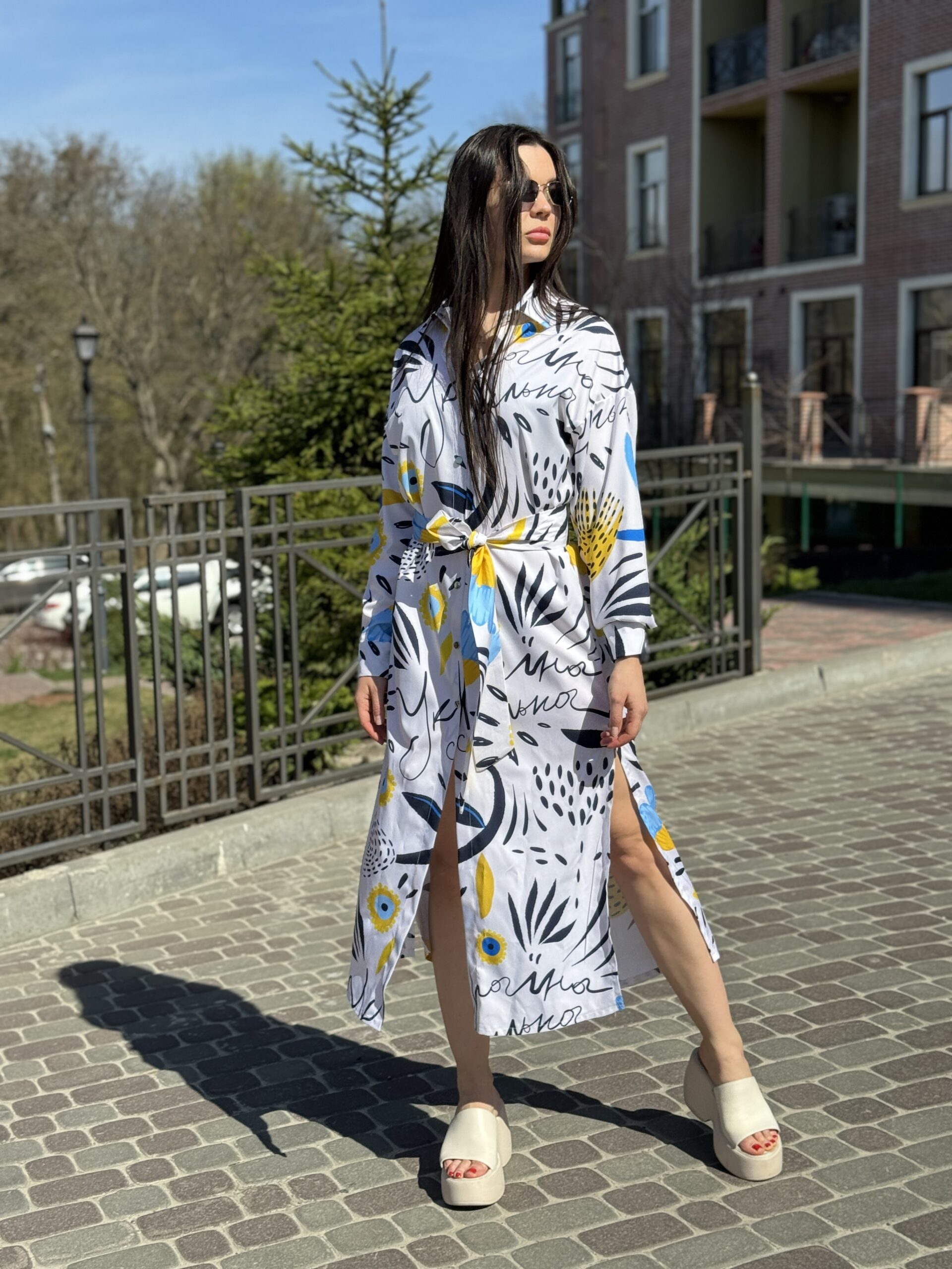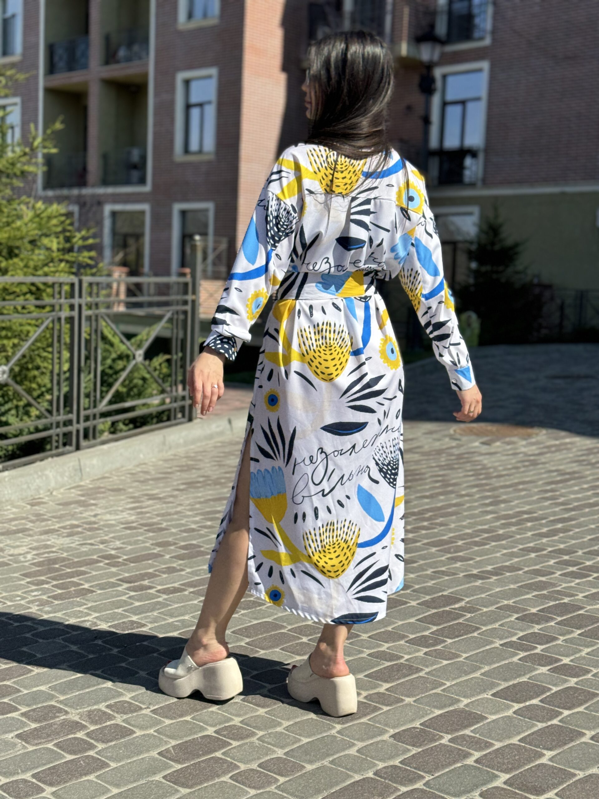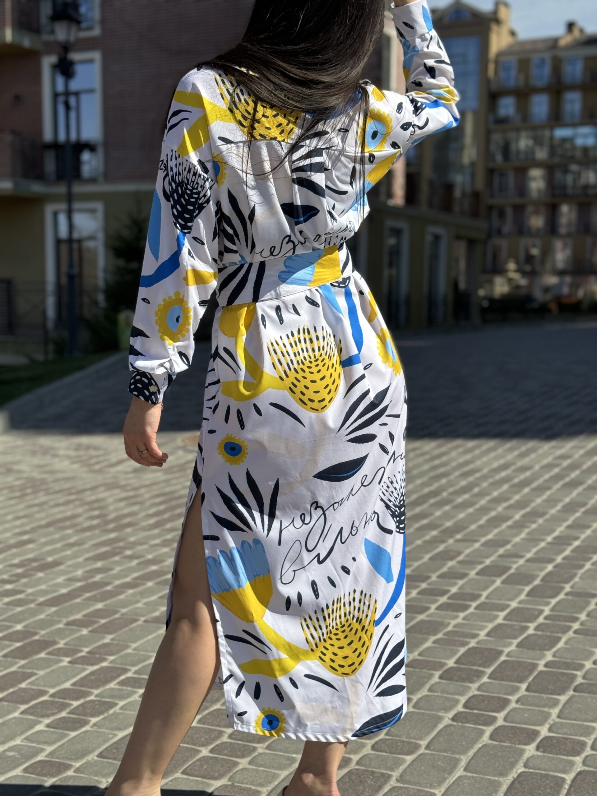 Сукня-сорочка. Довжина по спині від вороту 134 см. Є пасок у комплекті. Рукава підкочуються, є застібка на рукаві. Довжина рукава від вороту 75 см. Плечовий шов спущенний.