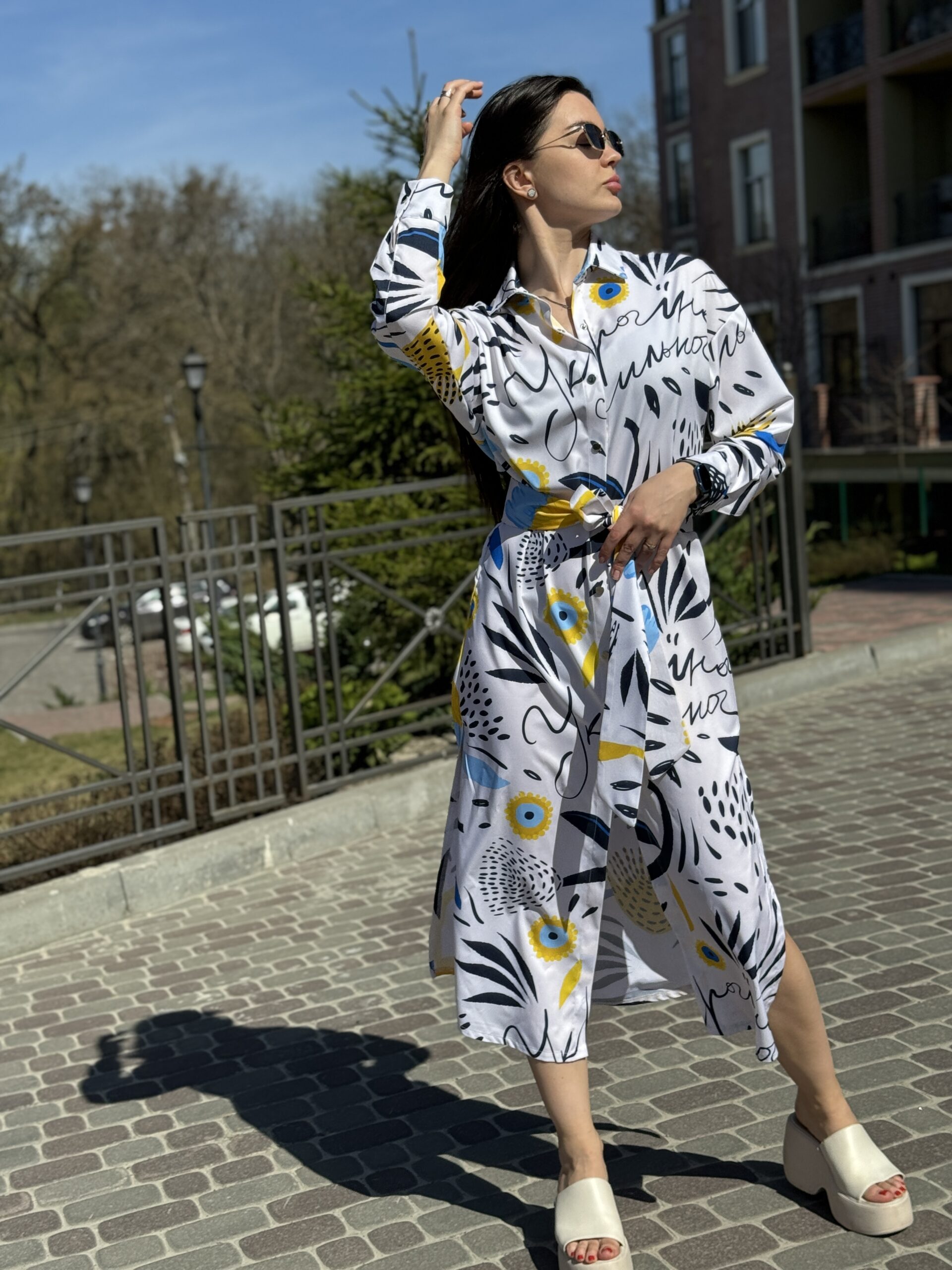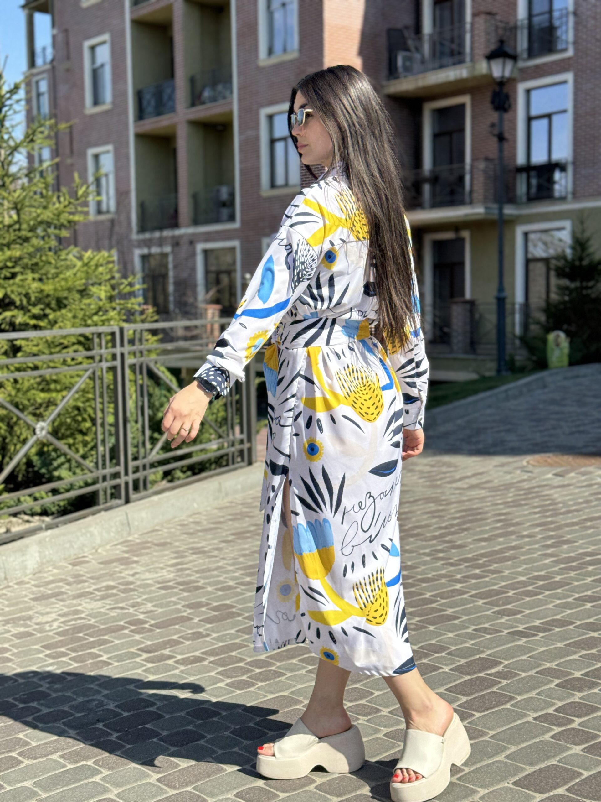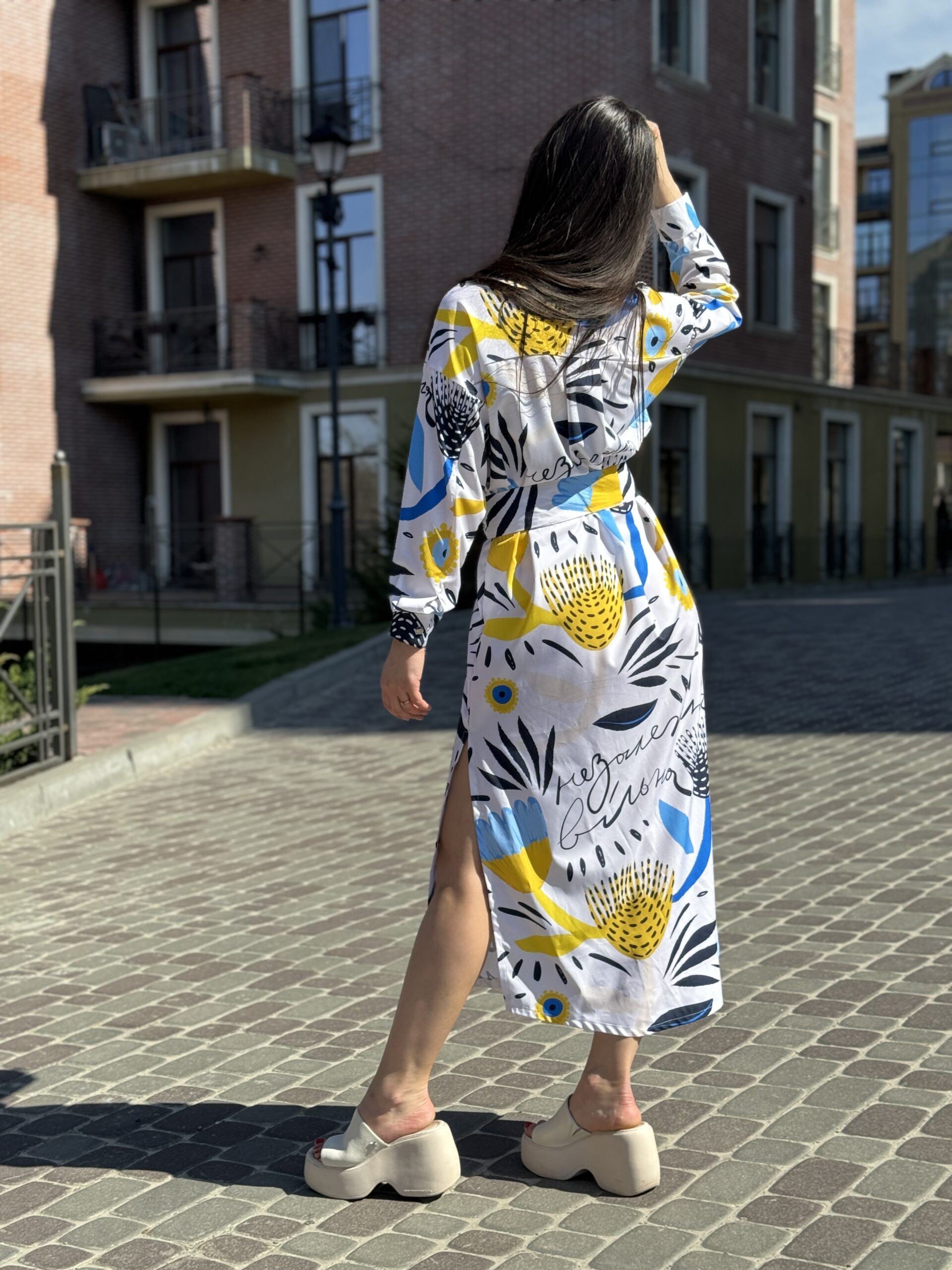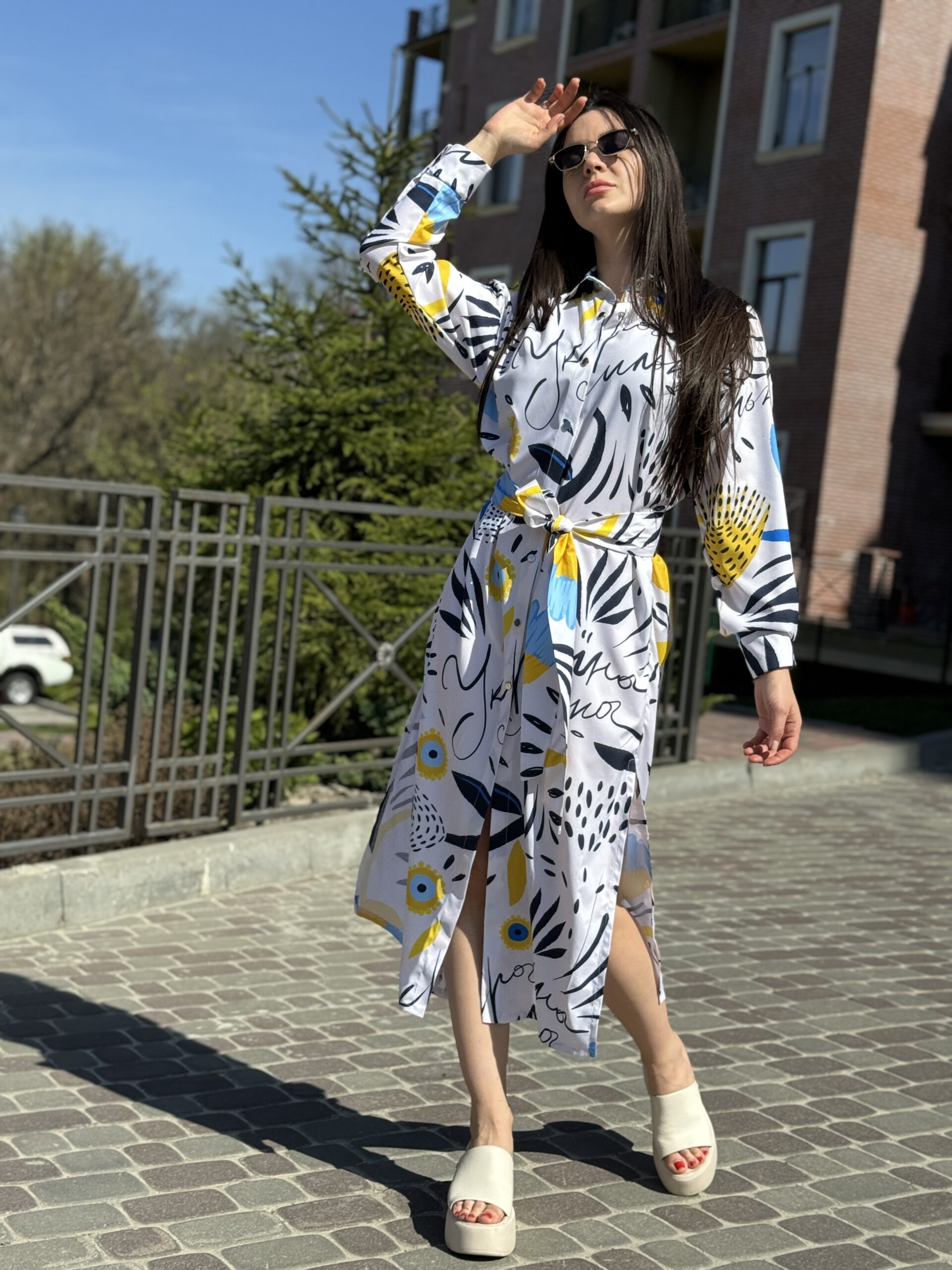 Сукня-сорочка. Довжина по спині від вороту 134 см. Є пасок у комплекті. Рукава підкочуються, є застібка на рукаві. Довжина рукава від вороту 75 см. Плечовий шов спущенний.