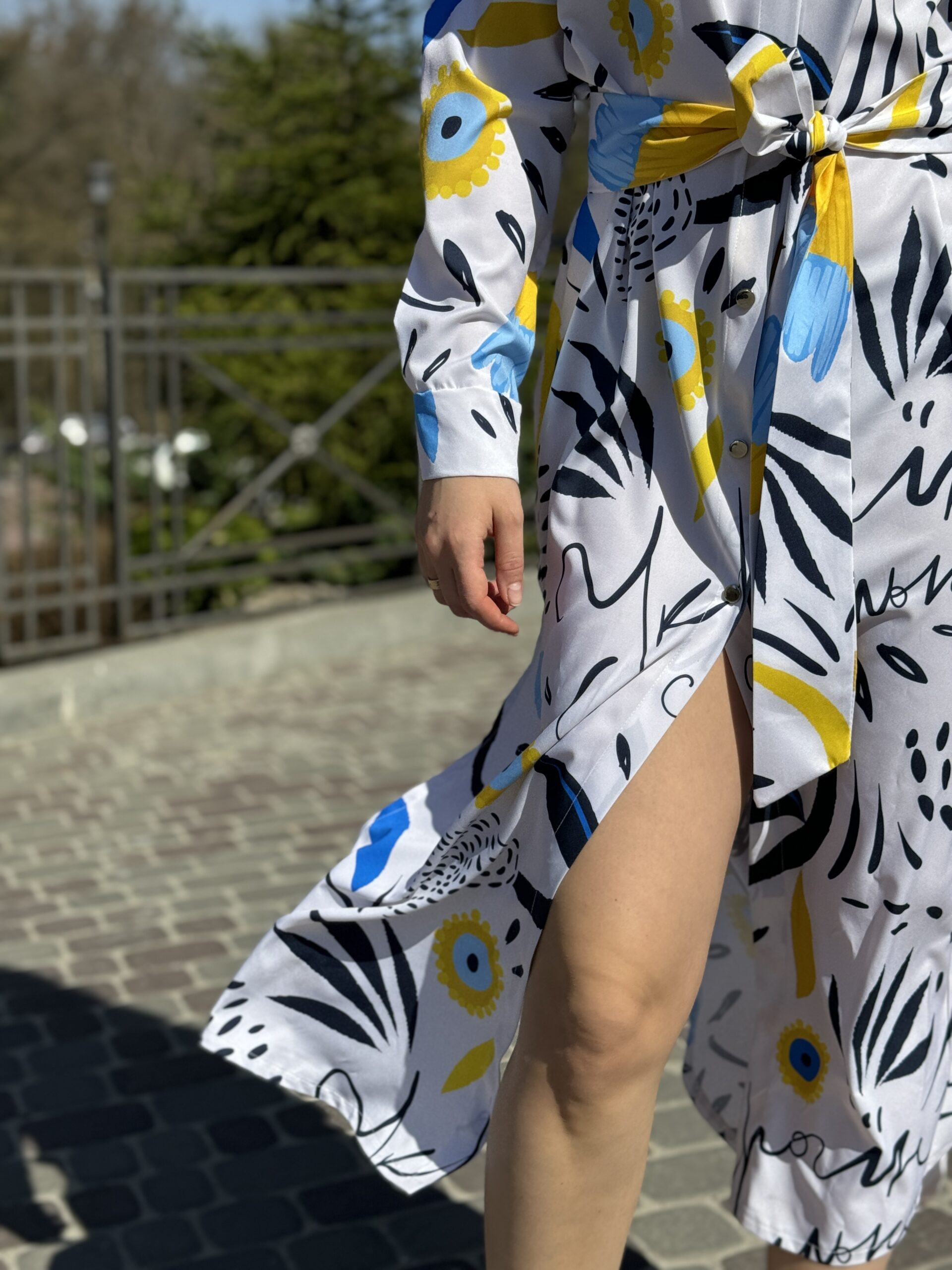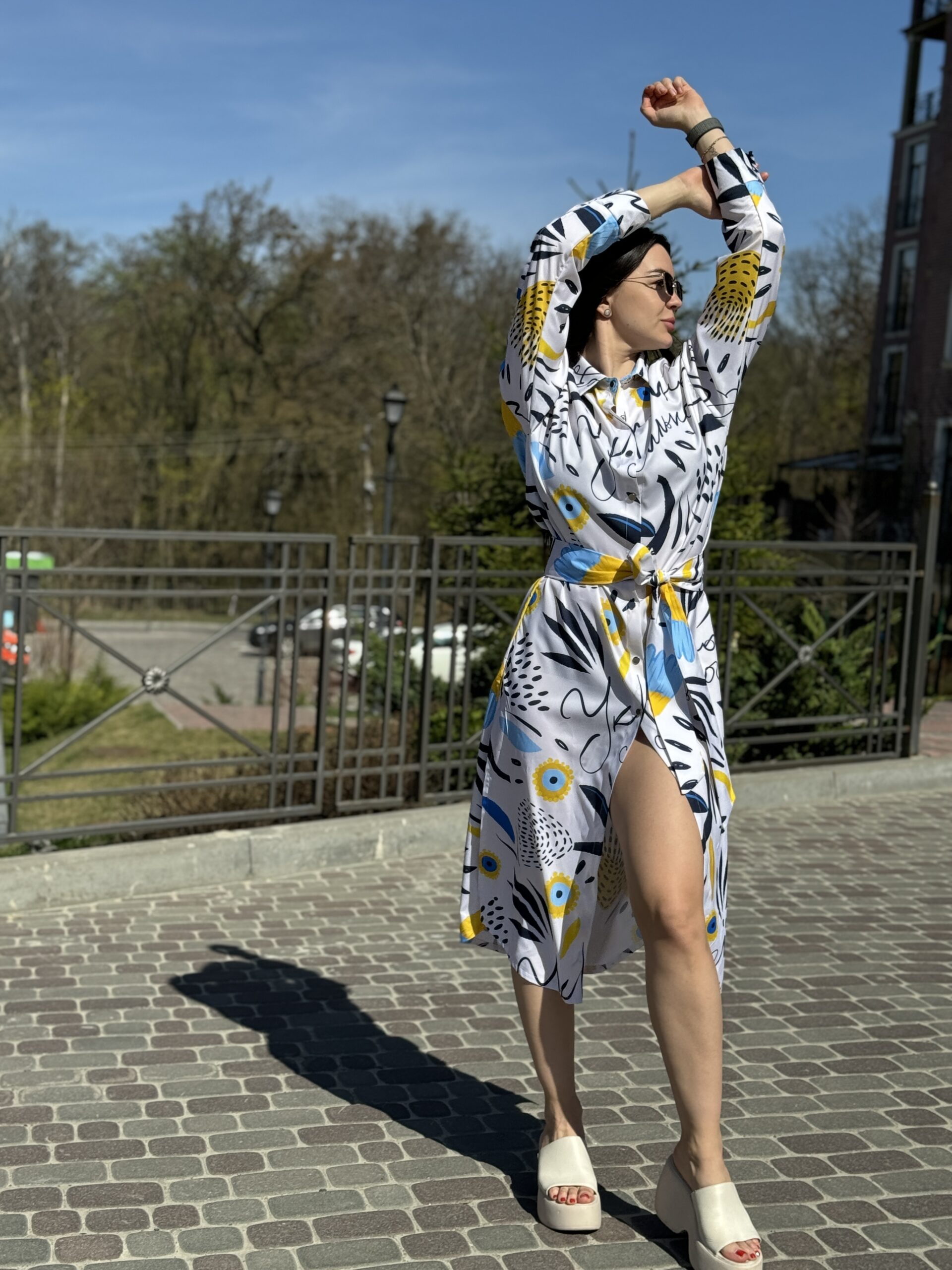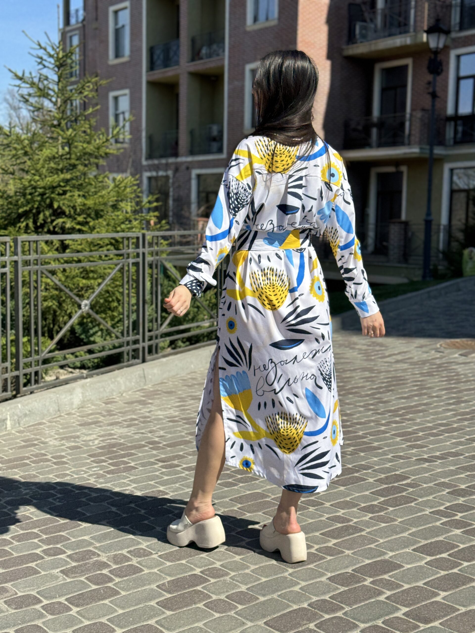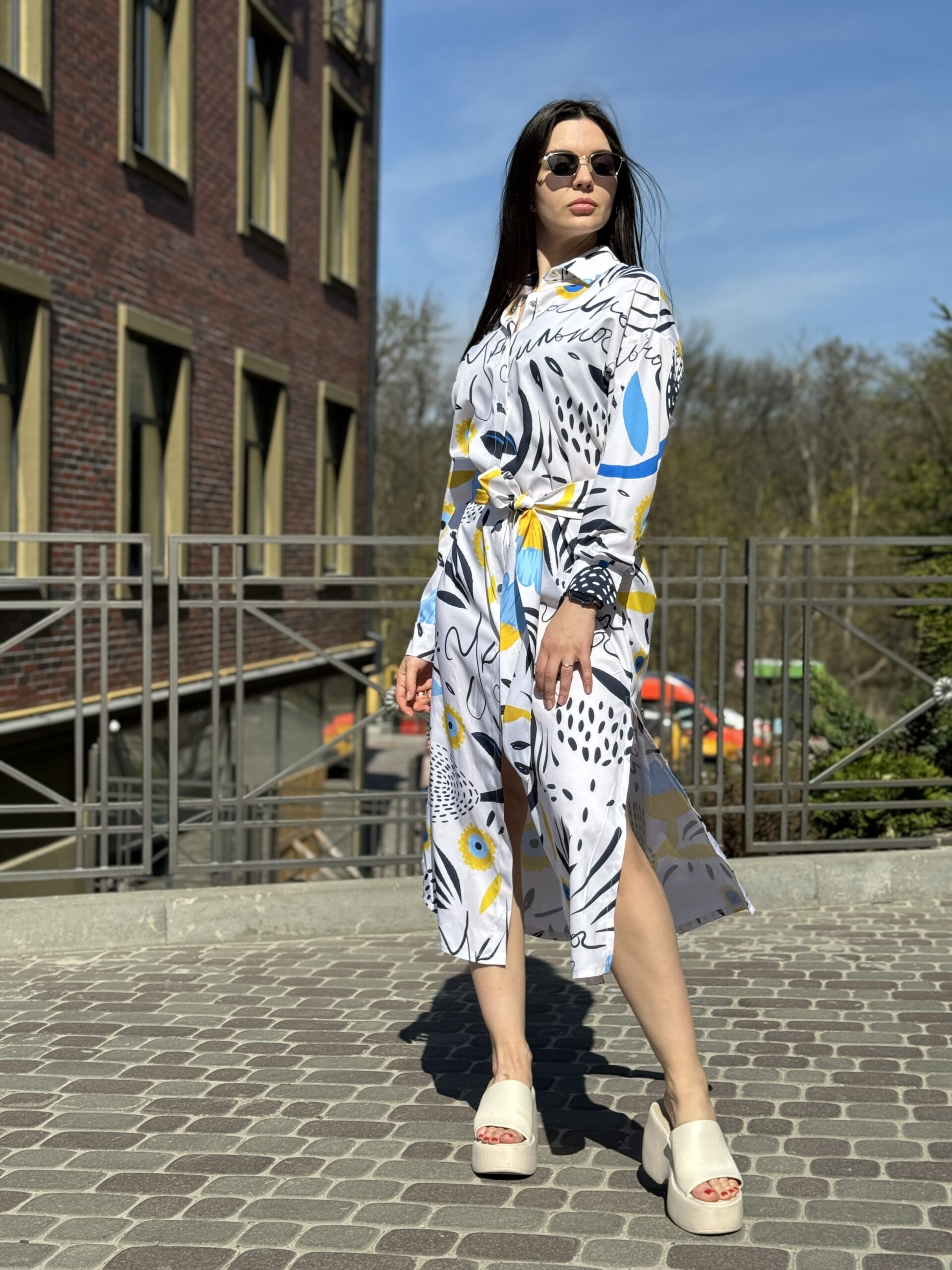 Сукня-сорочка. Довжина по спині від вороту 134 см. Є пасок у комплекті. Рукава підкочуються, є застібка на рукаві. Довжина рукава від вороту 75 см. Плечовий шов спущенний.