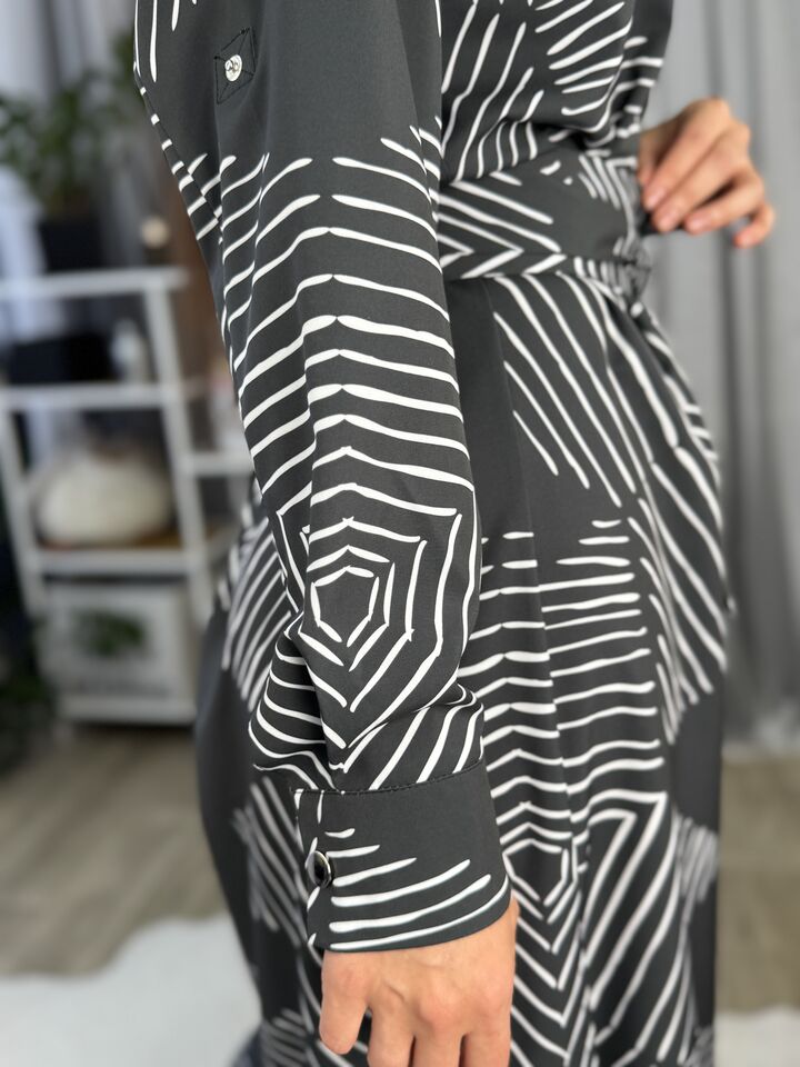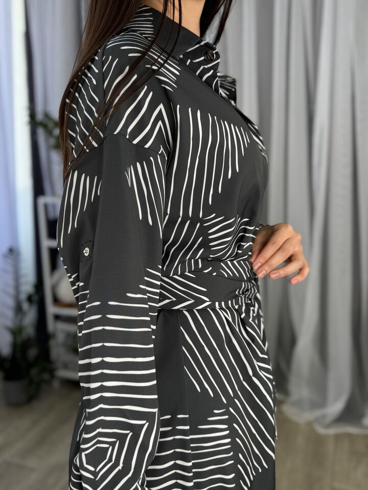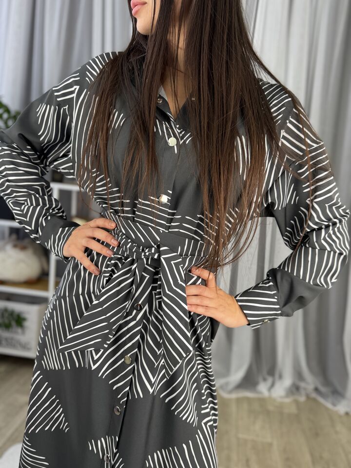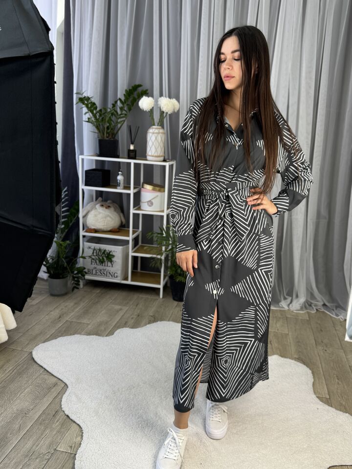 Сукня – сорочка, довга із поясом, сіра з геометричним принтом