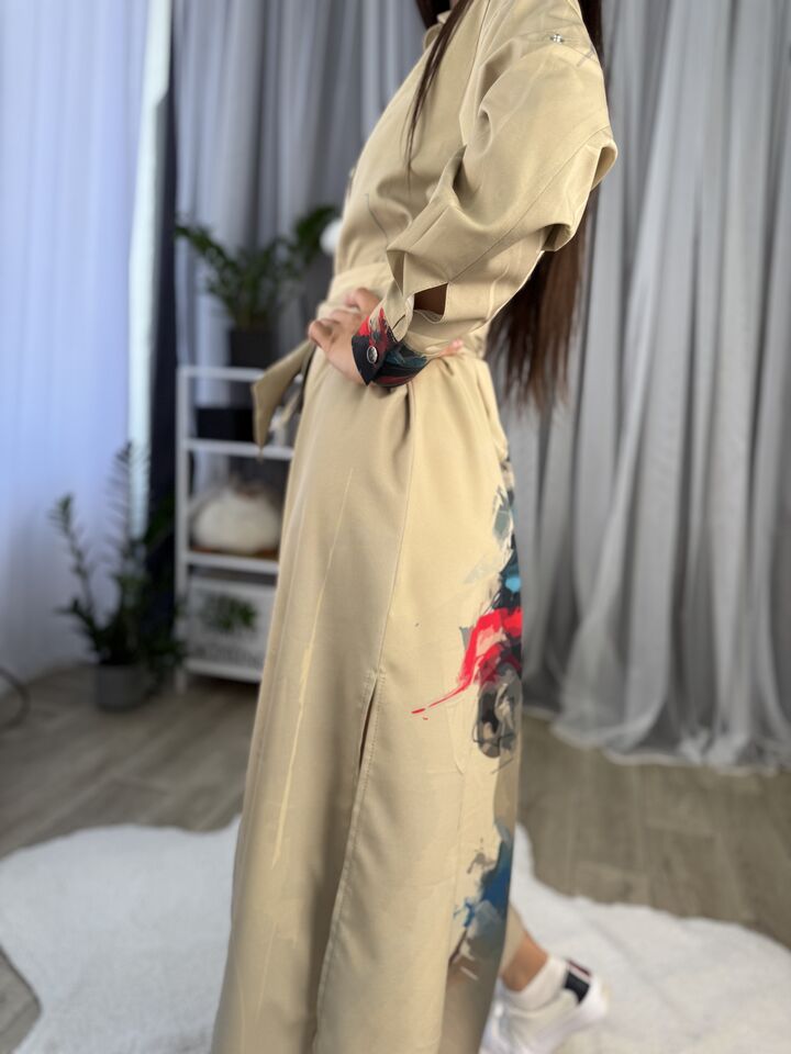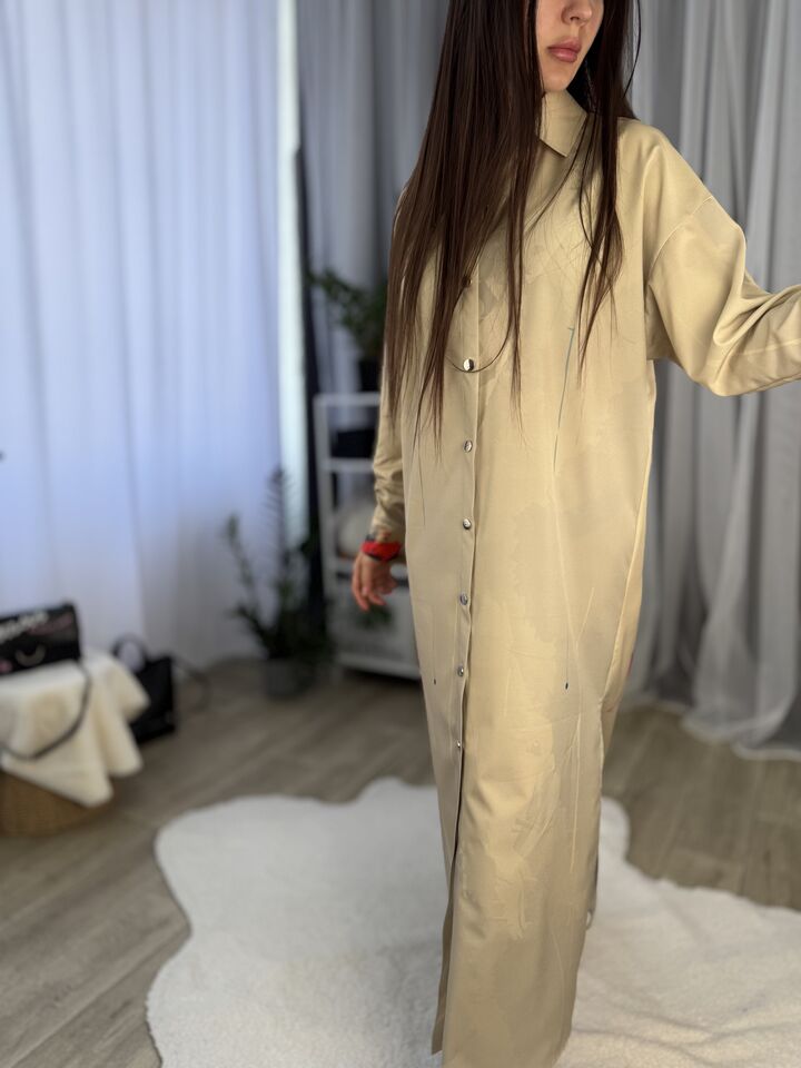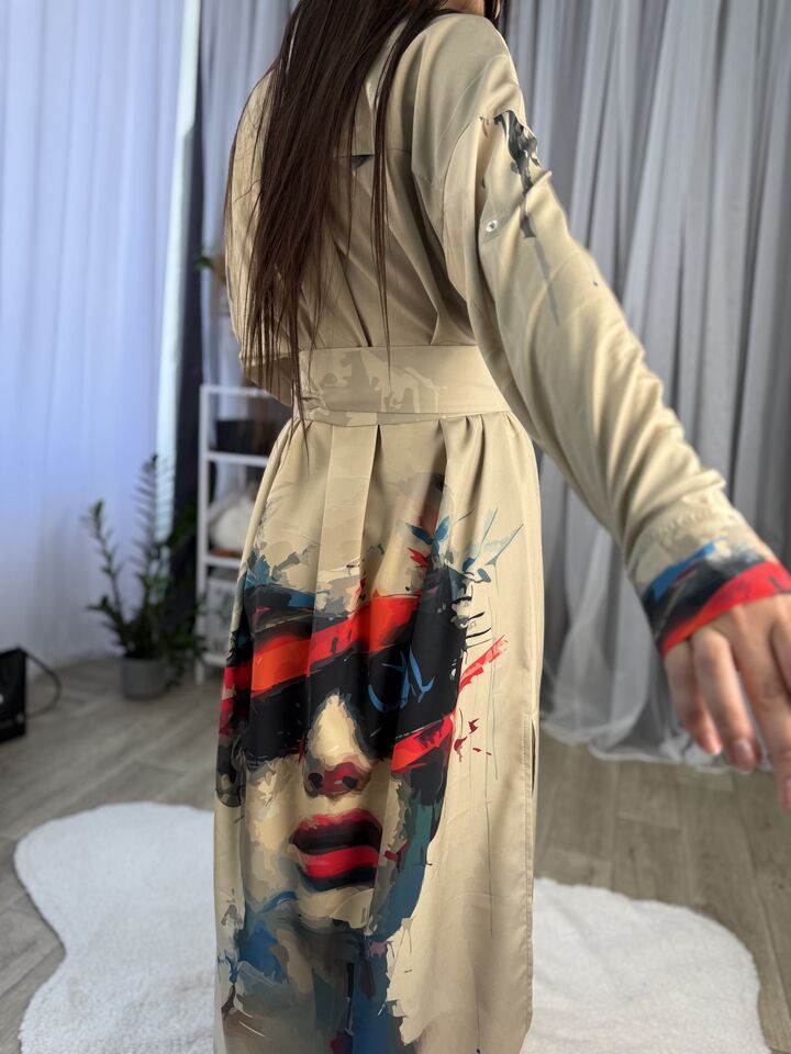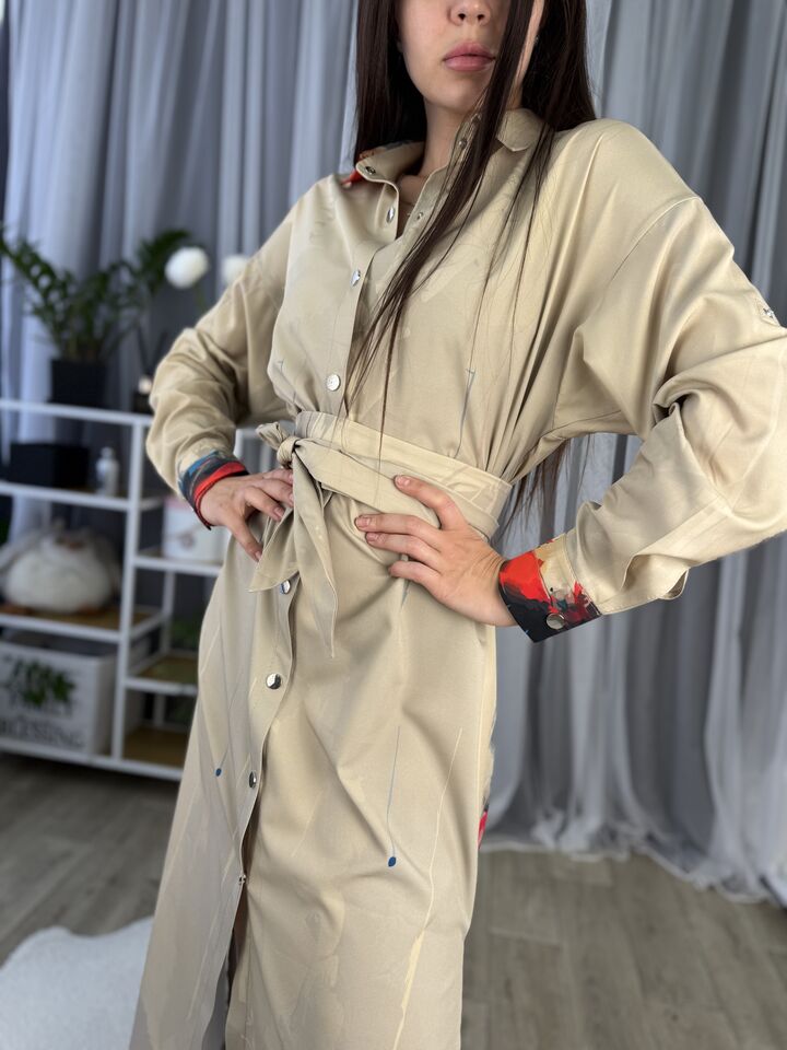 Сукня – сорочка, довга із поясом, бежева із принтом