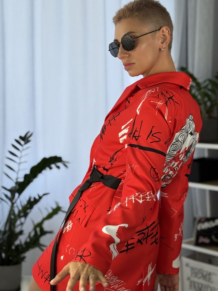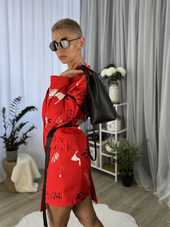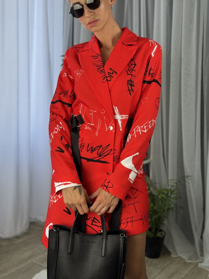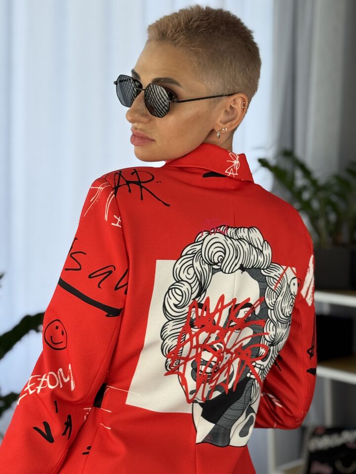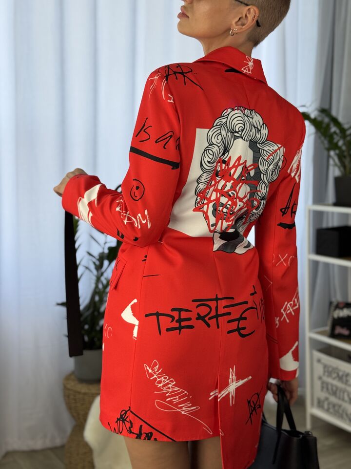 Сукня-жакет, приталена, червона із принтом монро